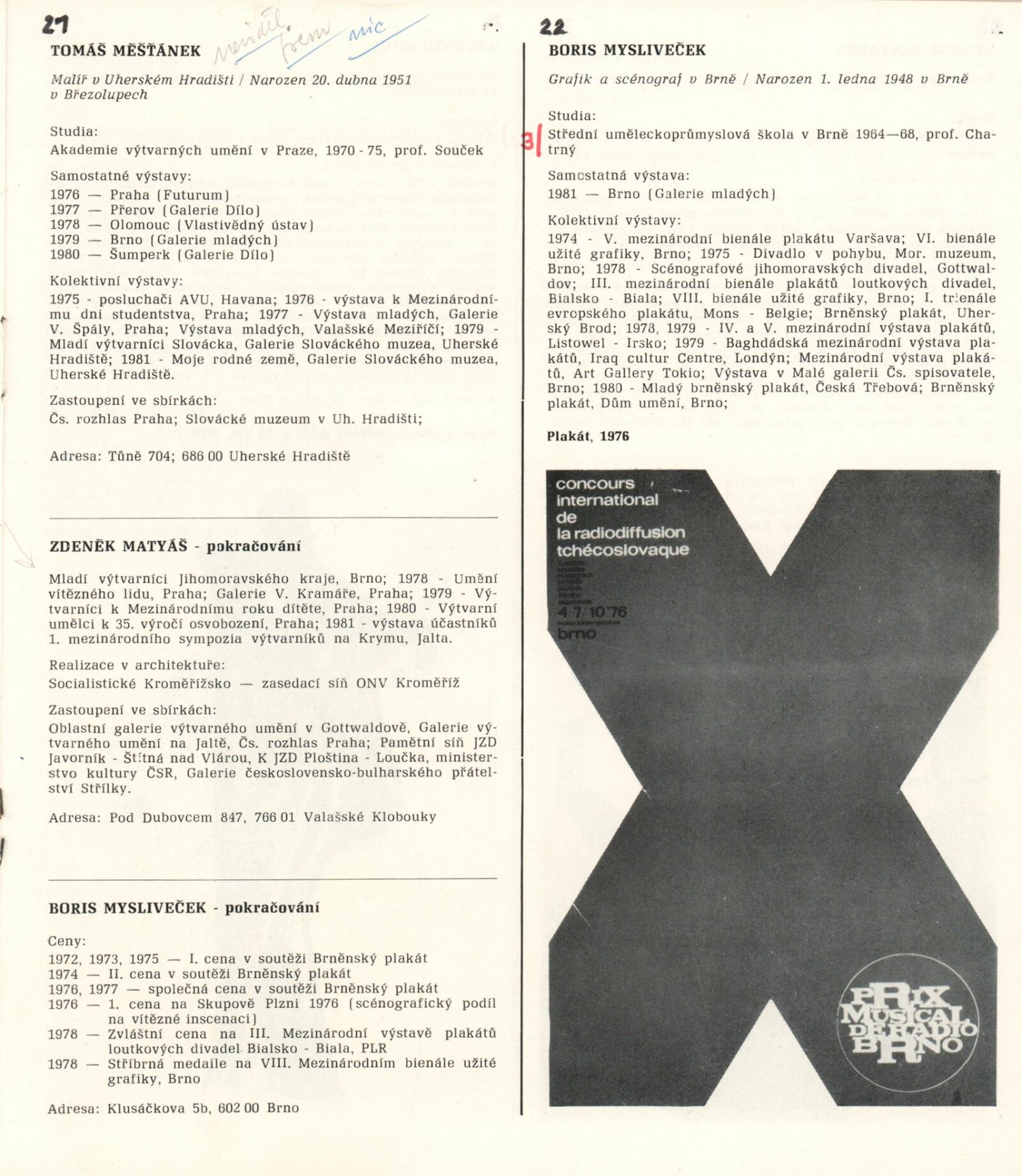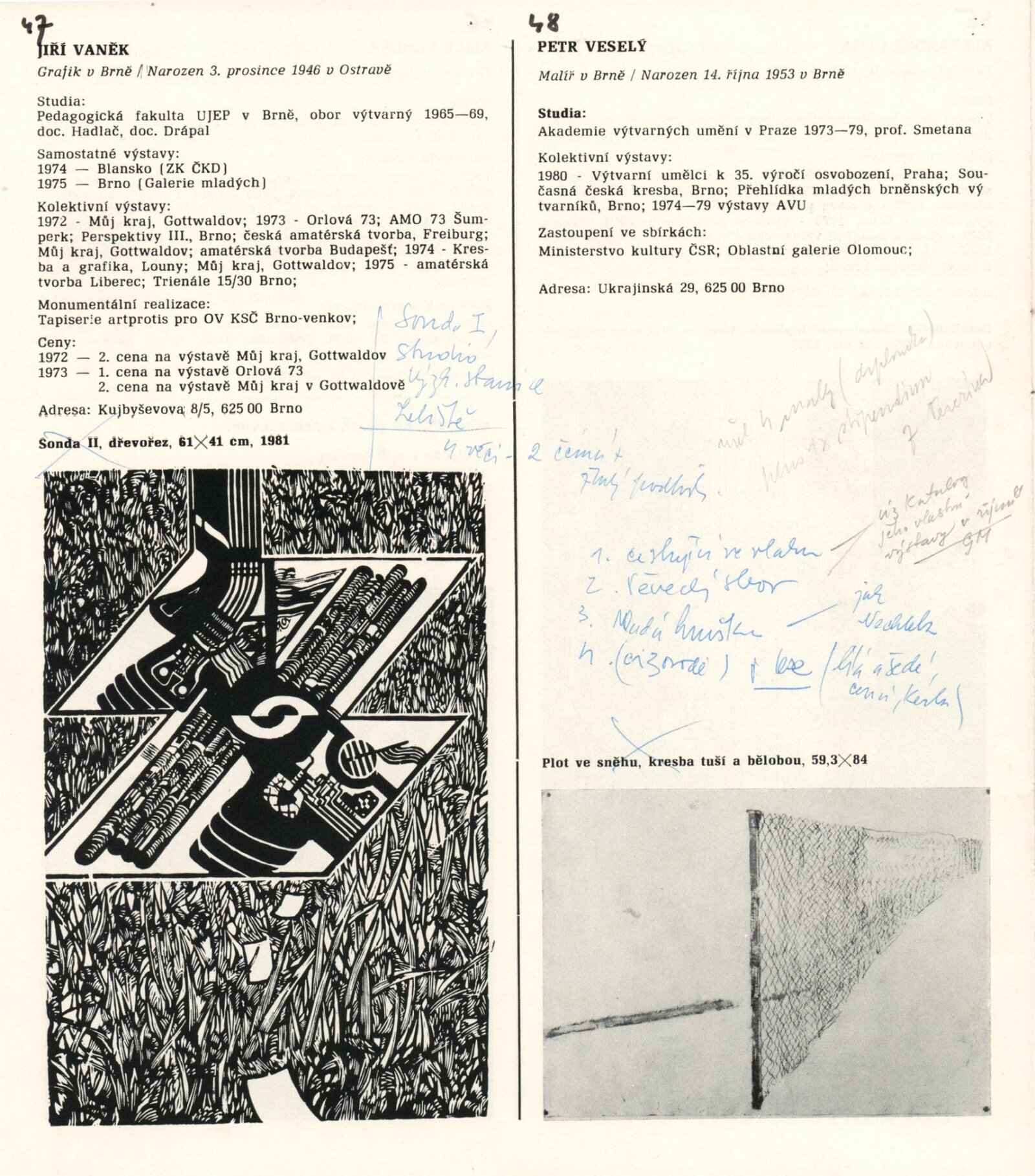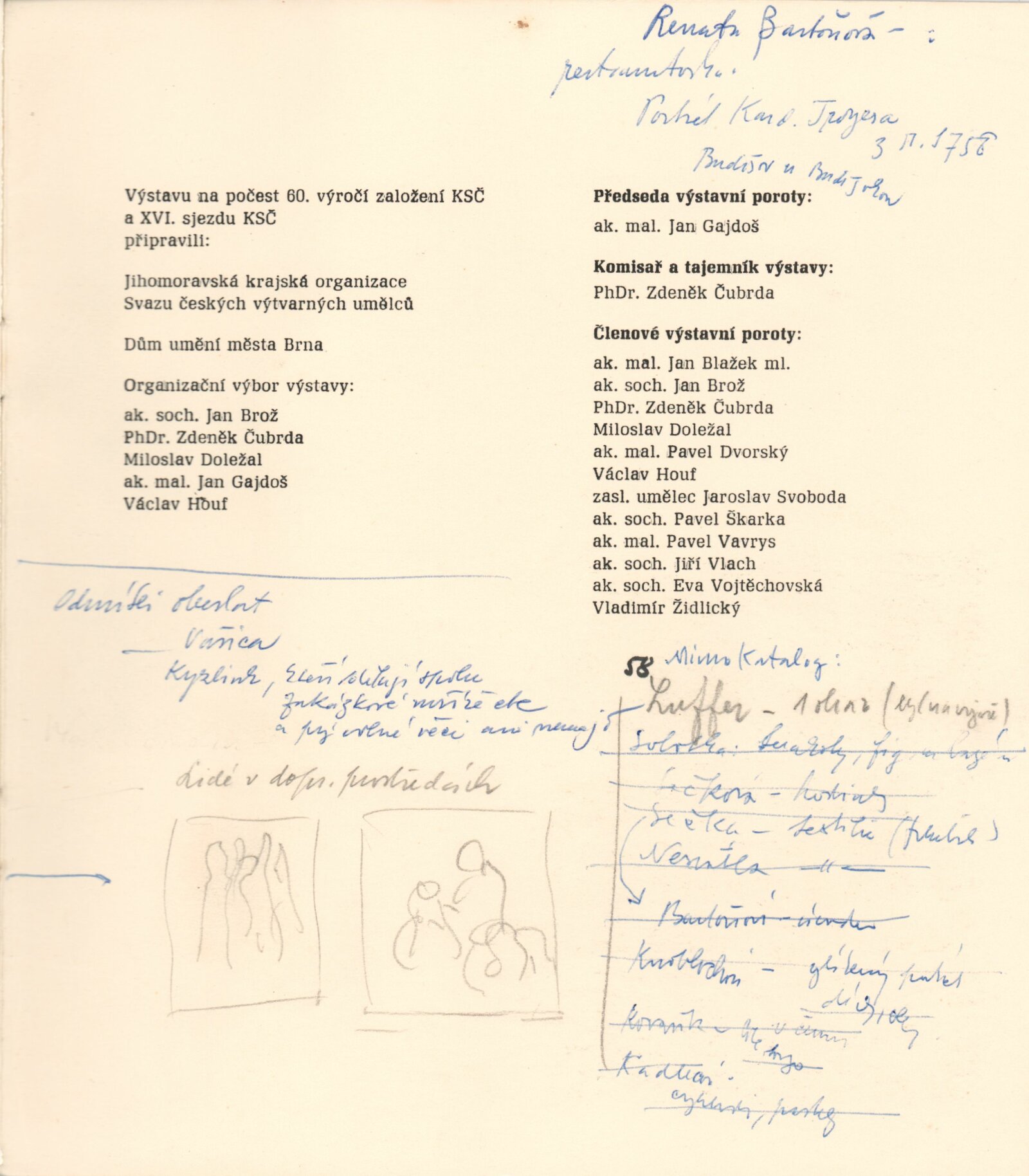 pozvánka na výstavu a pořad Hudba mezi obrazy, katalog (s poznámkami Igora Zhoře), podmínky a přihláška na bienále, básně, seznamy děl, seznam výtvarníků do 35 let v Jihomoravském kraji, provozní korespondence (SČVU), žádost o povolení výstavy, dopis ředitele DU výboru KO SČVU, recenze v tisku, propagační materiál k výstavě v Pavlově