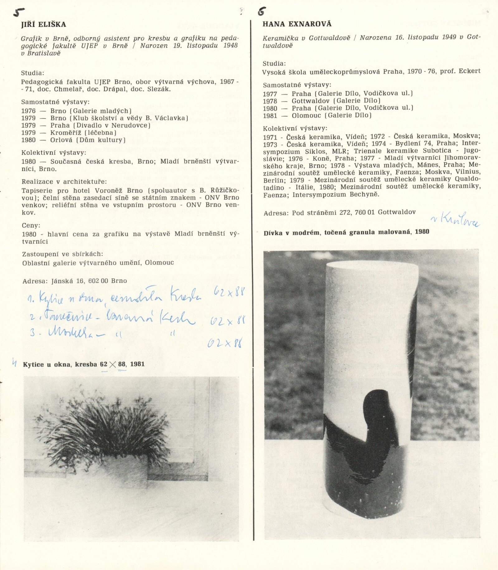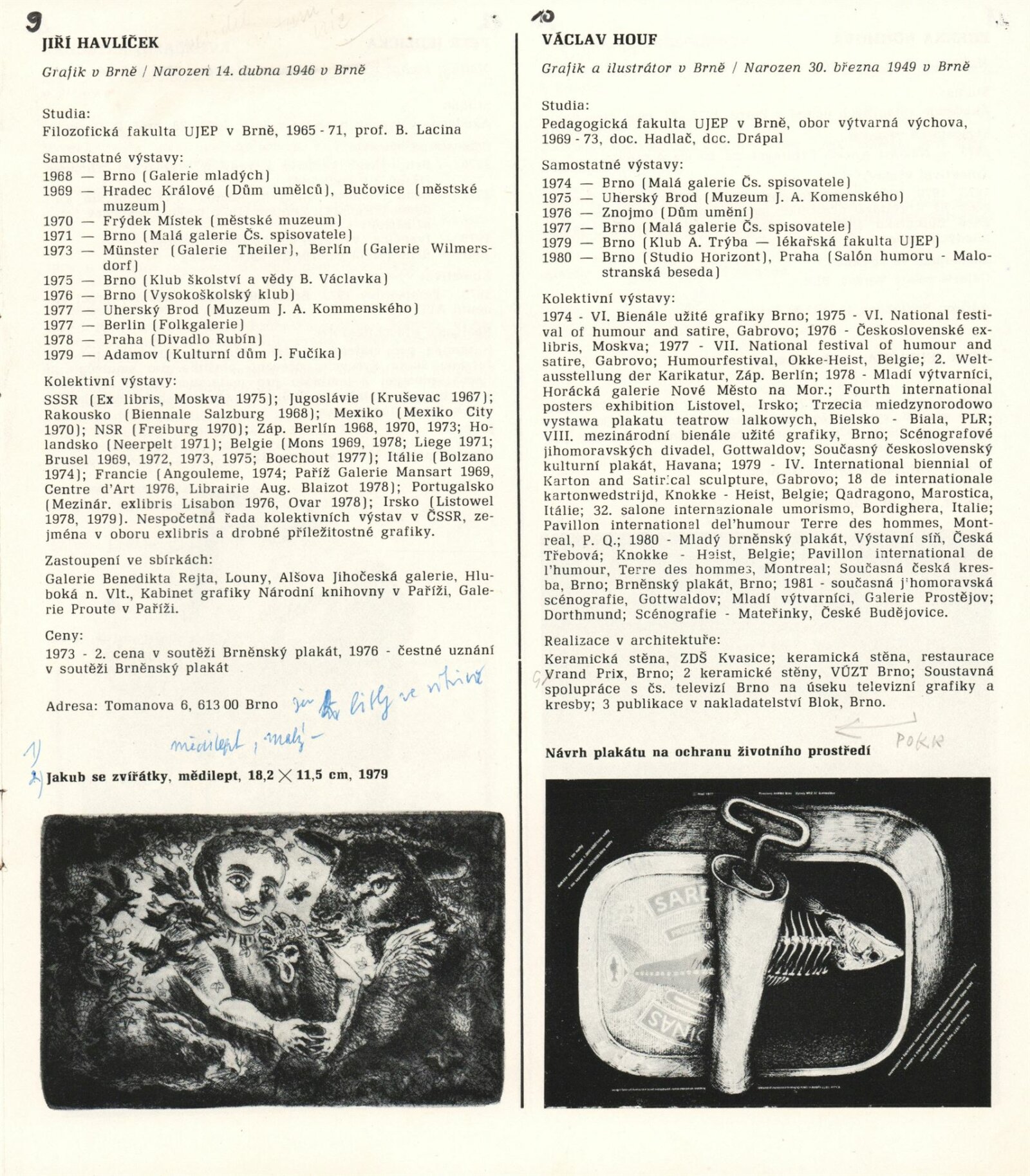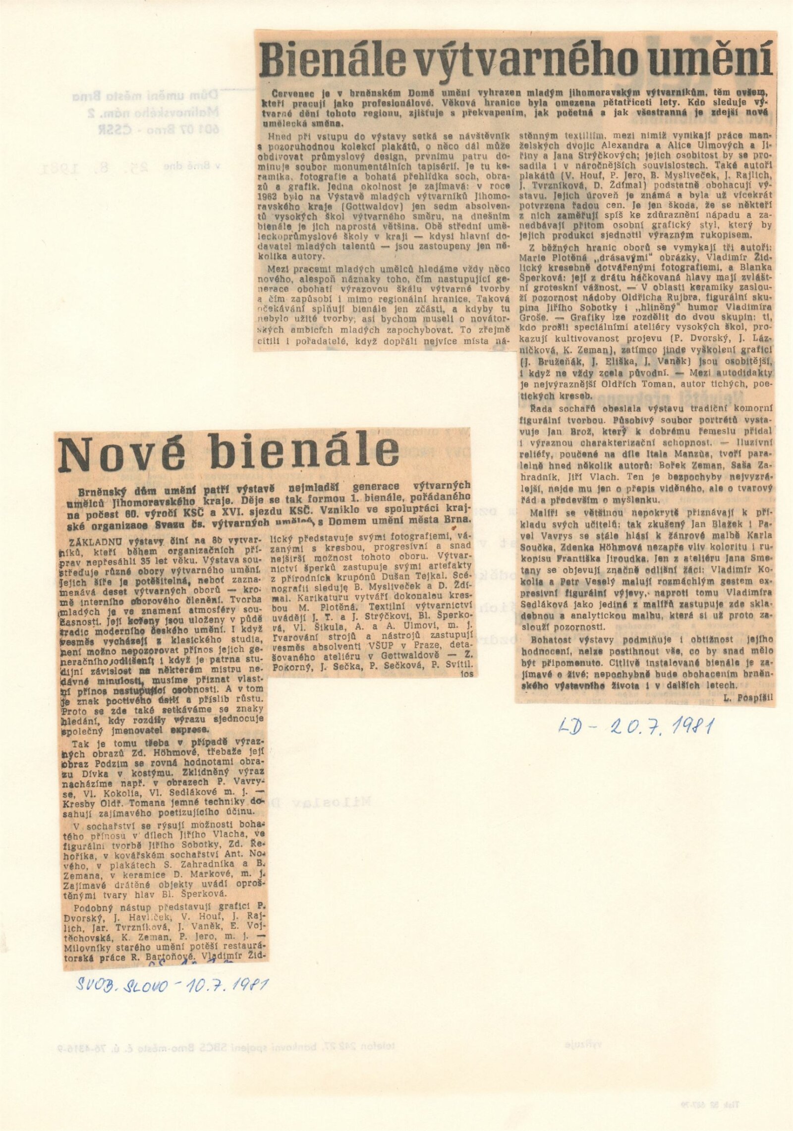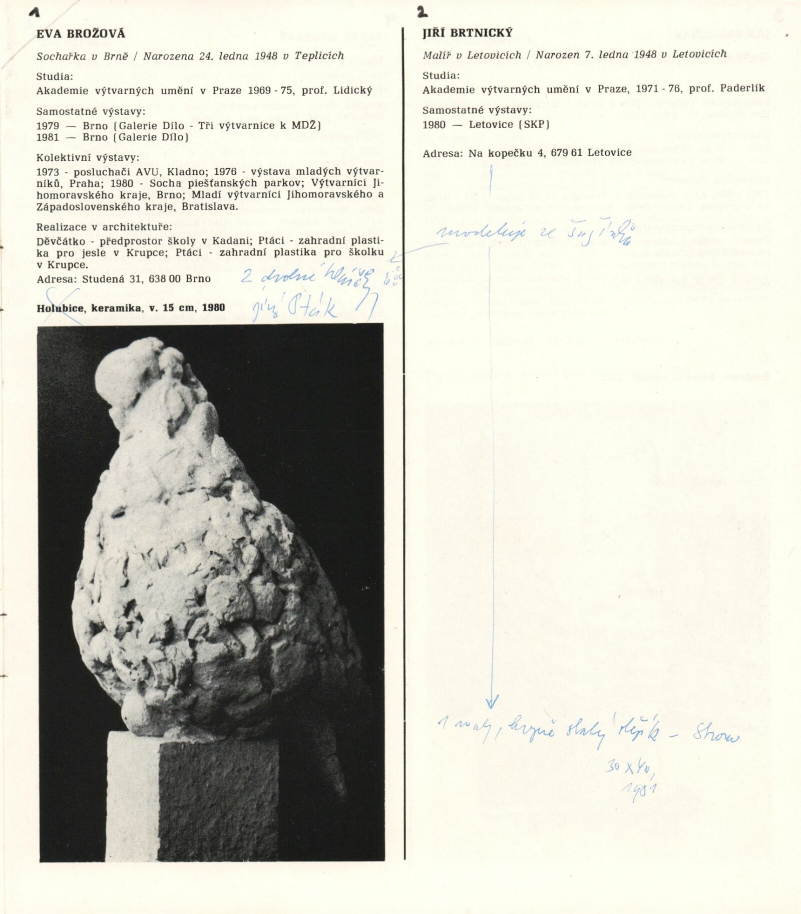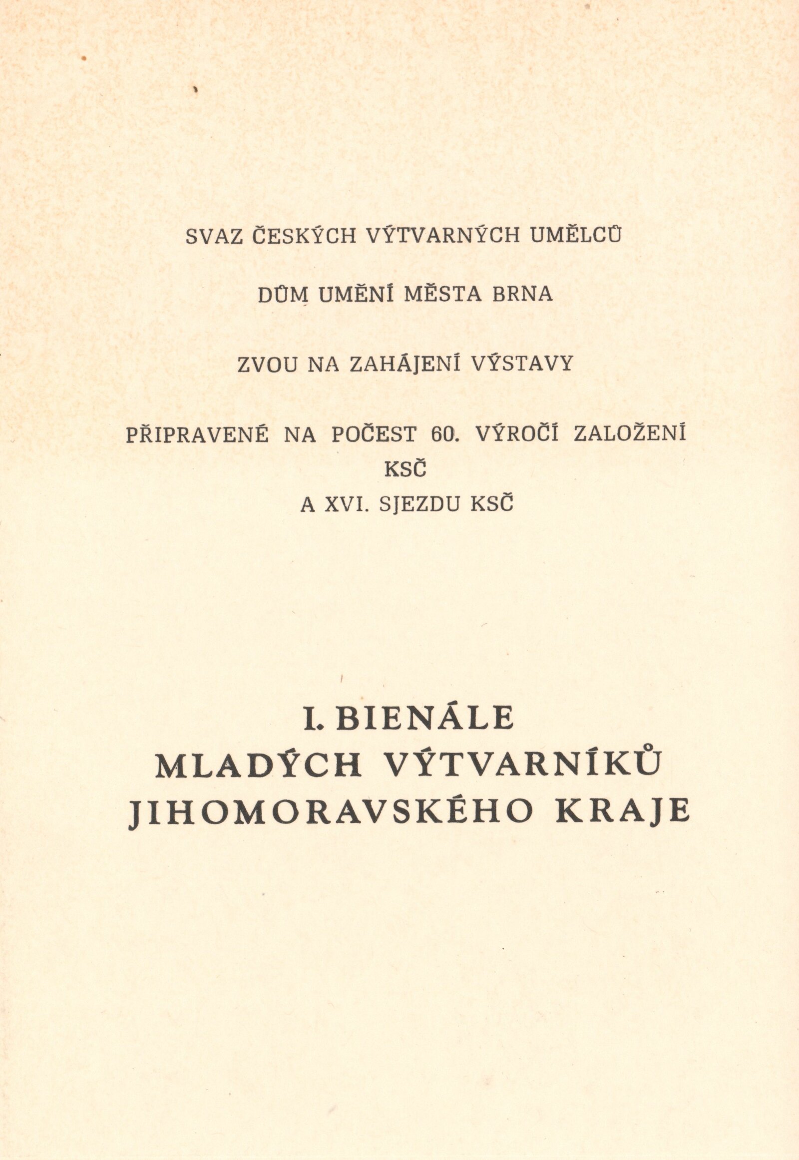 1. Bienále tvorby mladých výtvarníku jihomoravského kraje: Dům umění města Brna 5. 7. – 2. 3. 1981 / Text Zdeněk Čubrda. – Brno: DUmB, 1981. – 40 s., obr., životní data vystavujících, DU 732. – MZK; MG