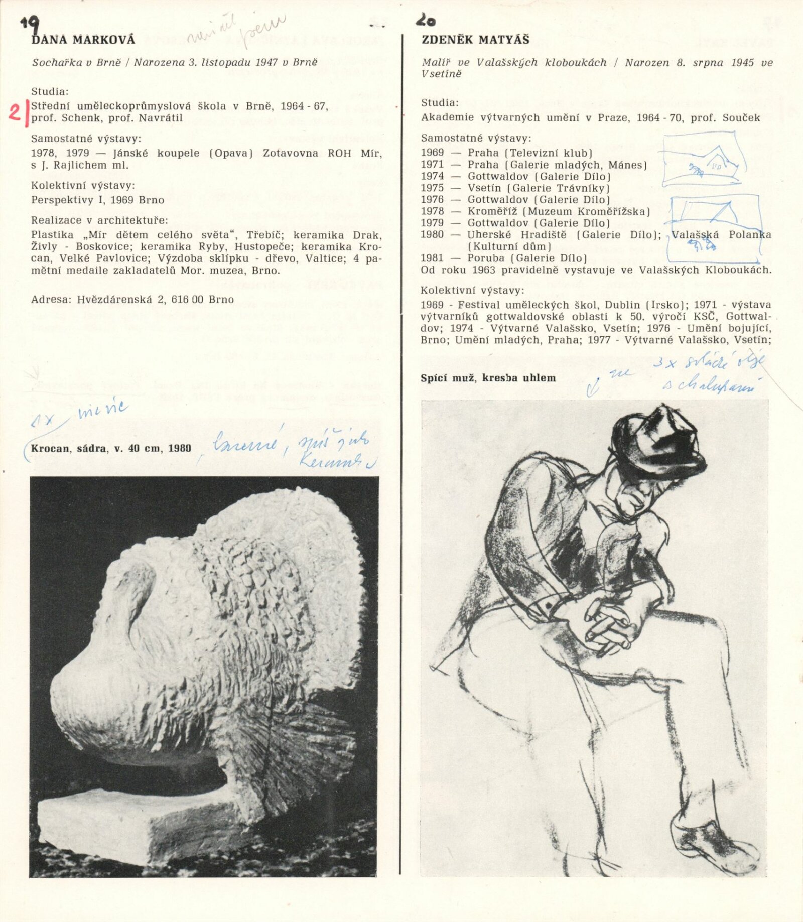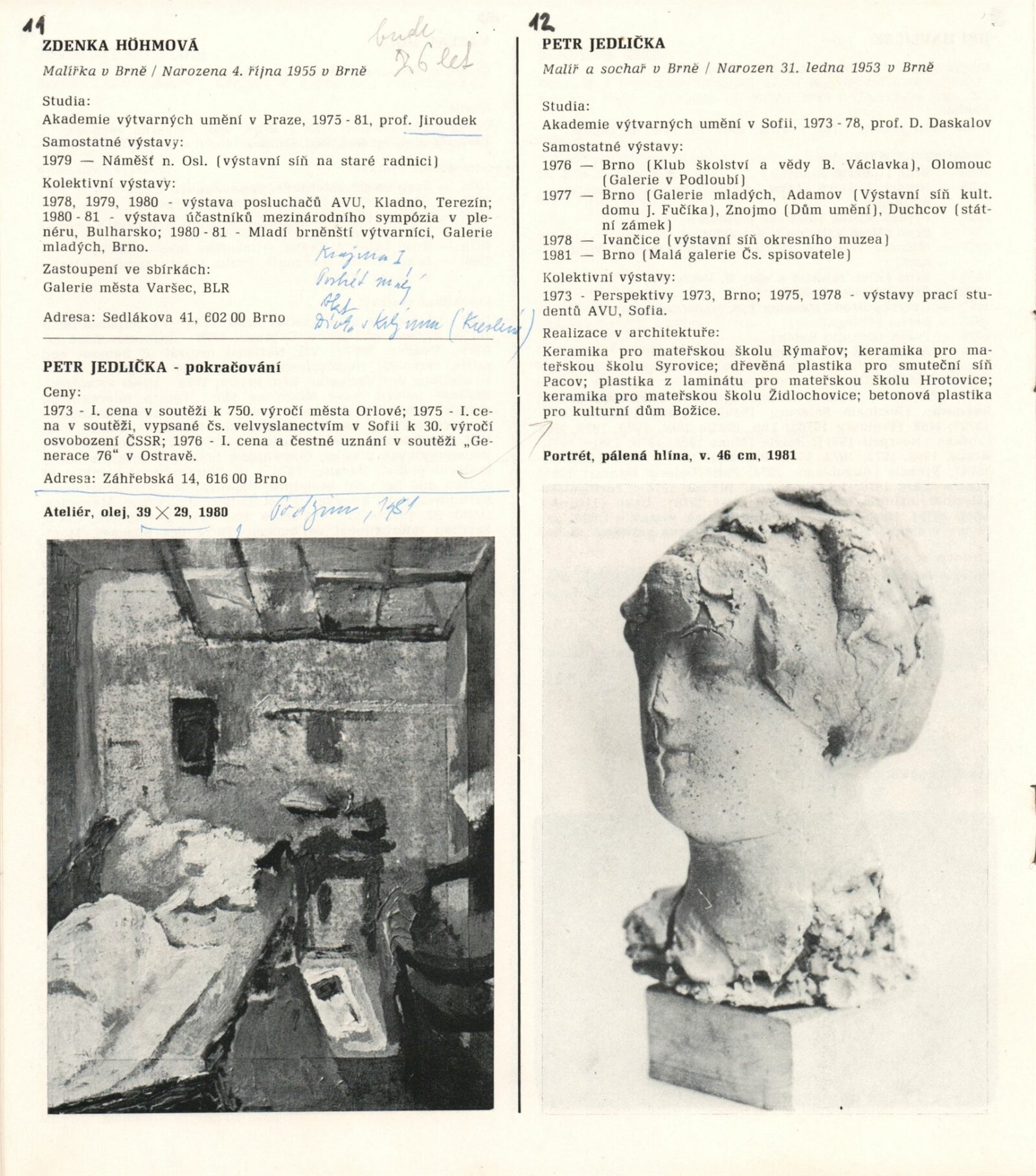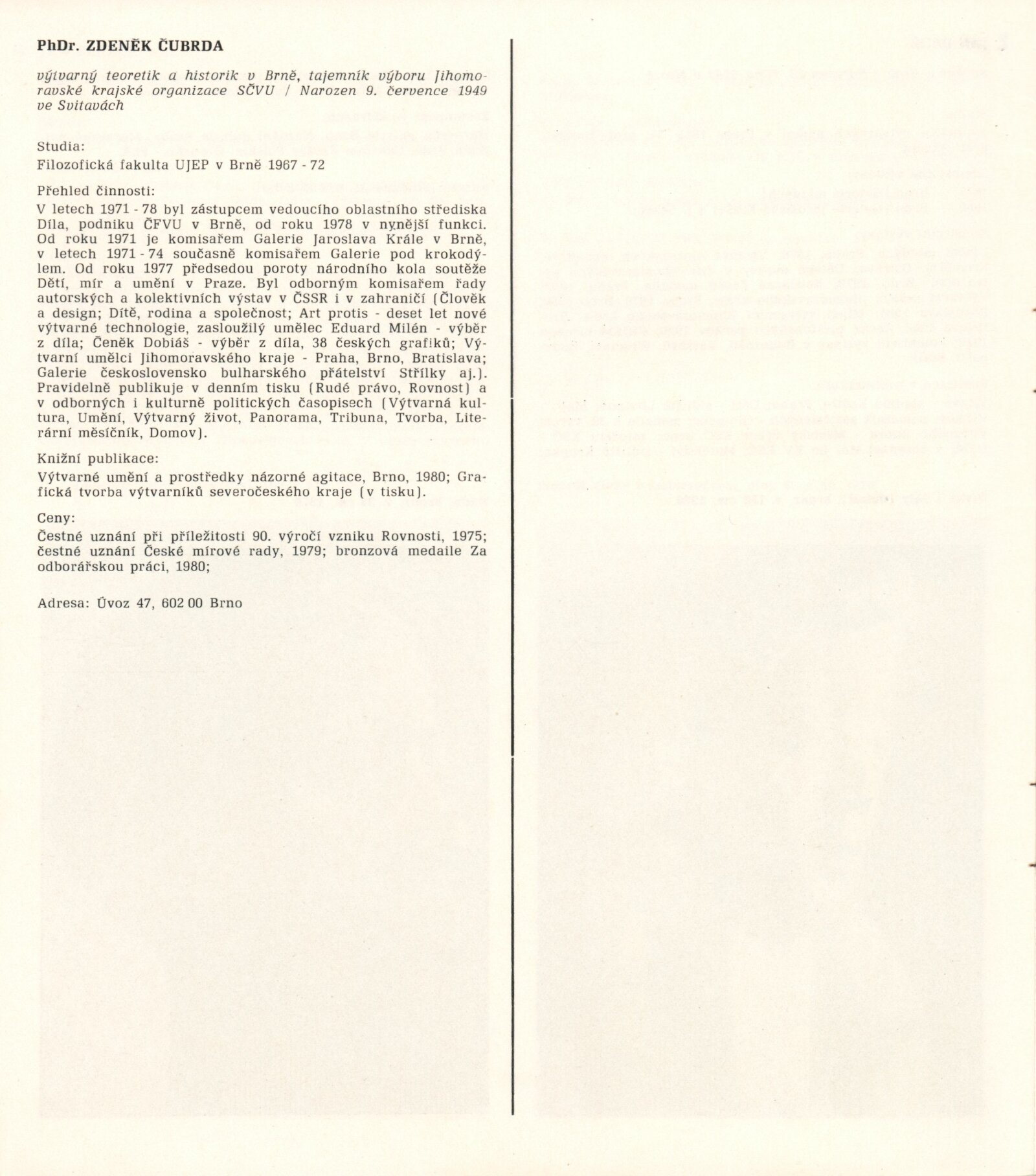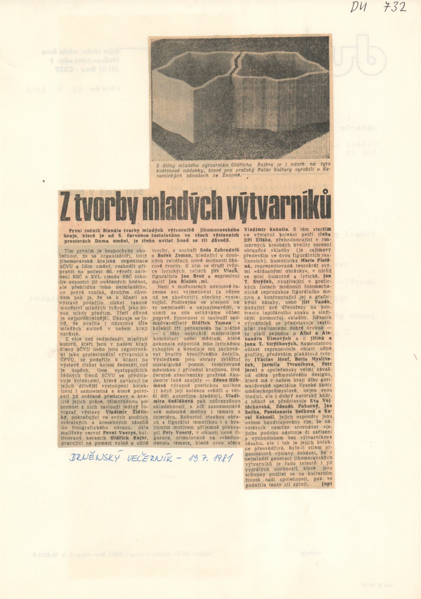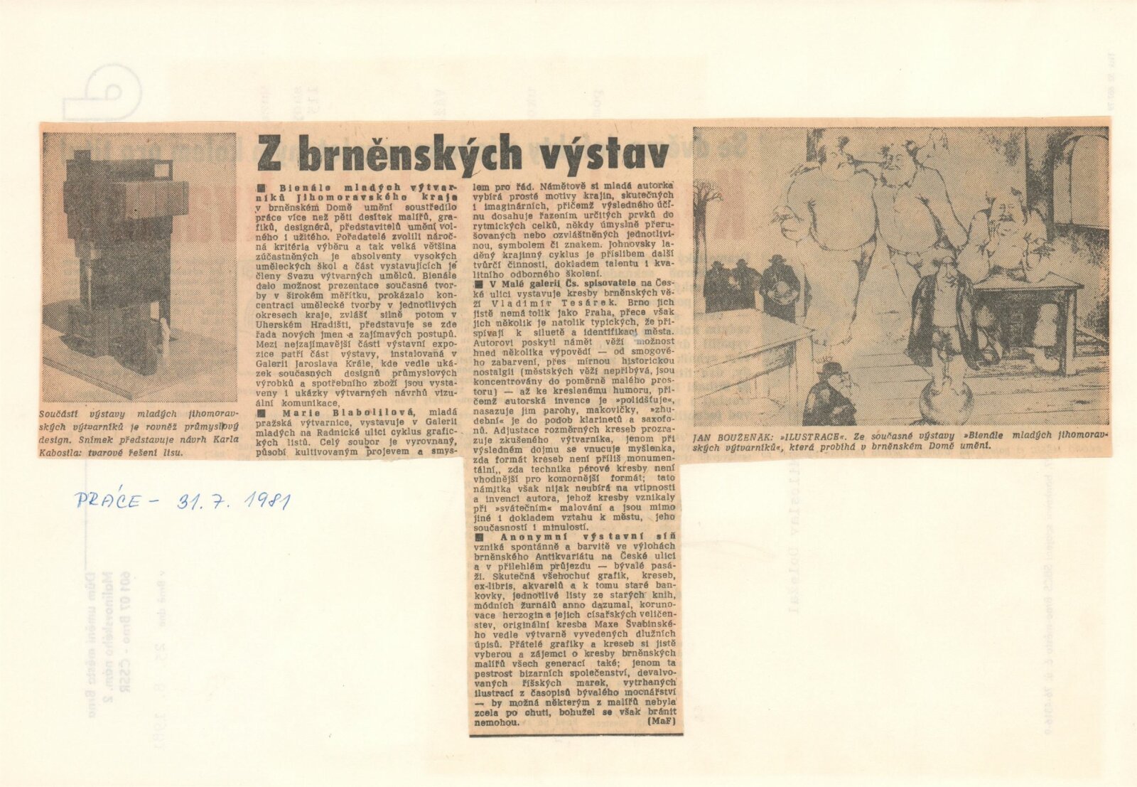 1. Bienále tvorby mladých výtvarníku jihomoravského kraje: Dům umění města Brna 5. 7. – 2. 3. 1981 / Text Zdeněk Čubrda. – Brno: DUmB, 1981. – 40 s., obr., životní data vystavujících, DU 732. – MZK; MG
