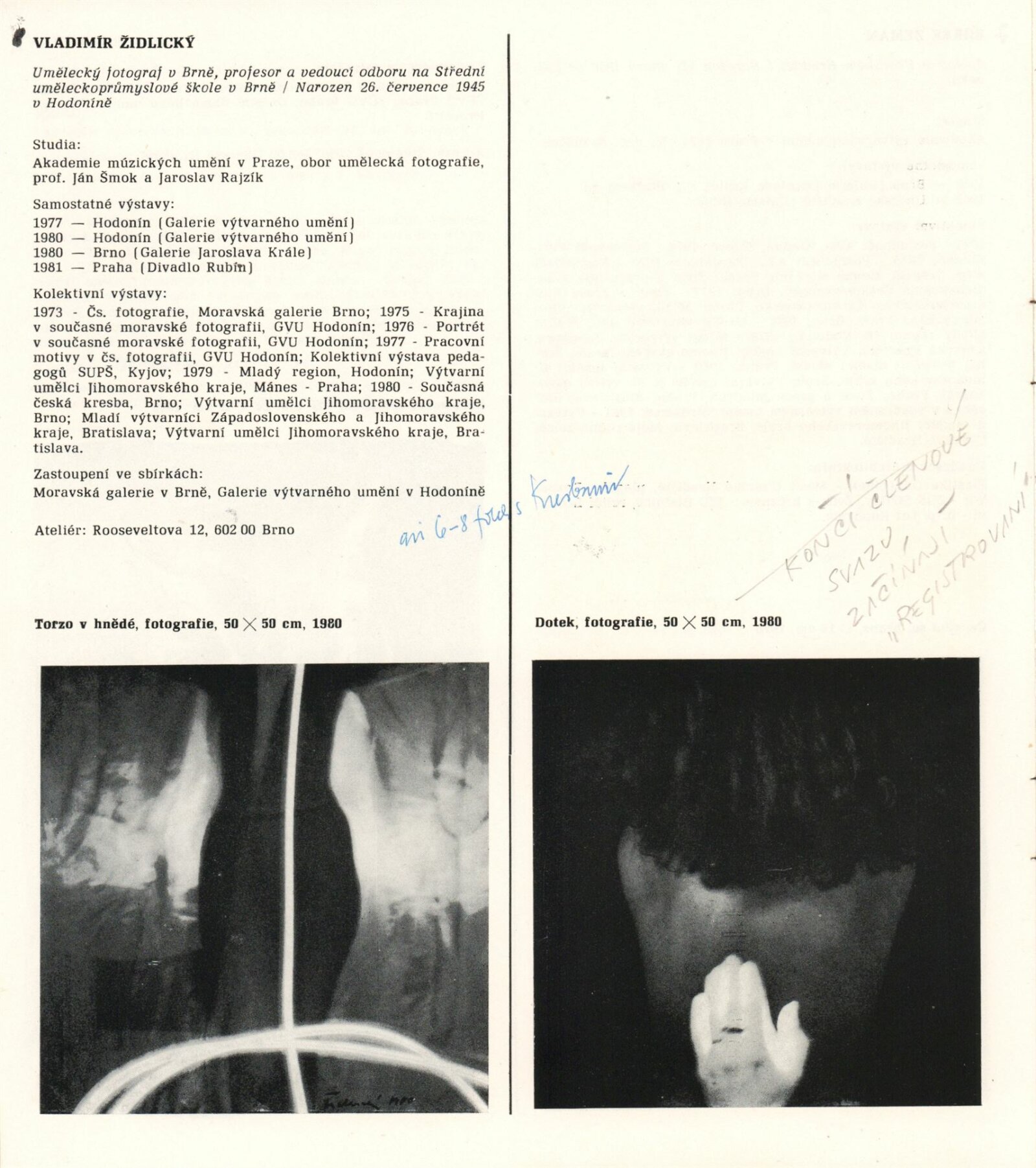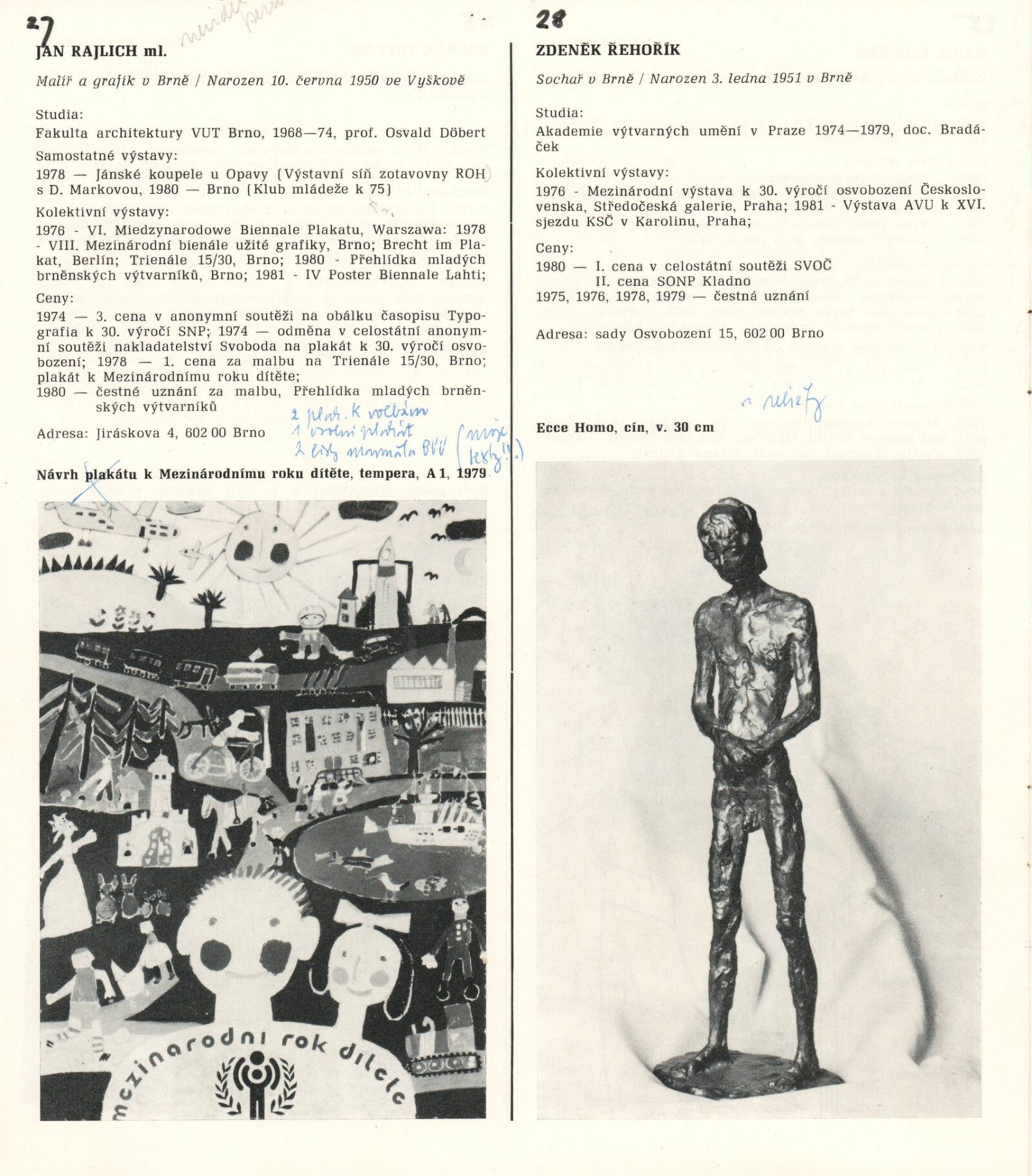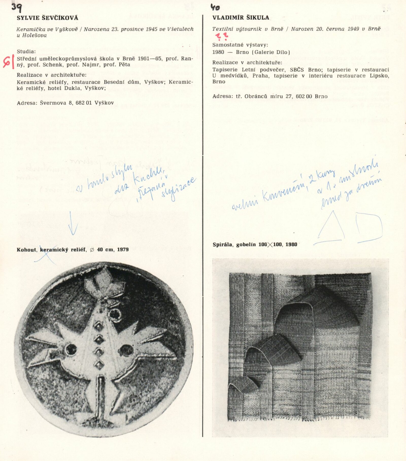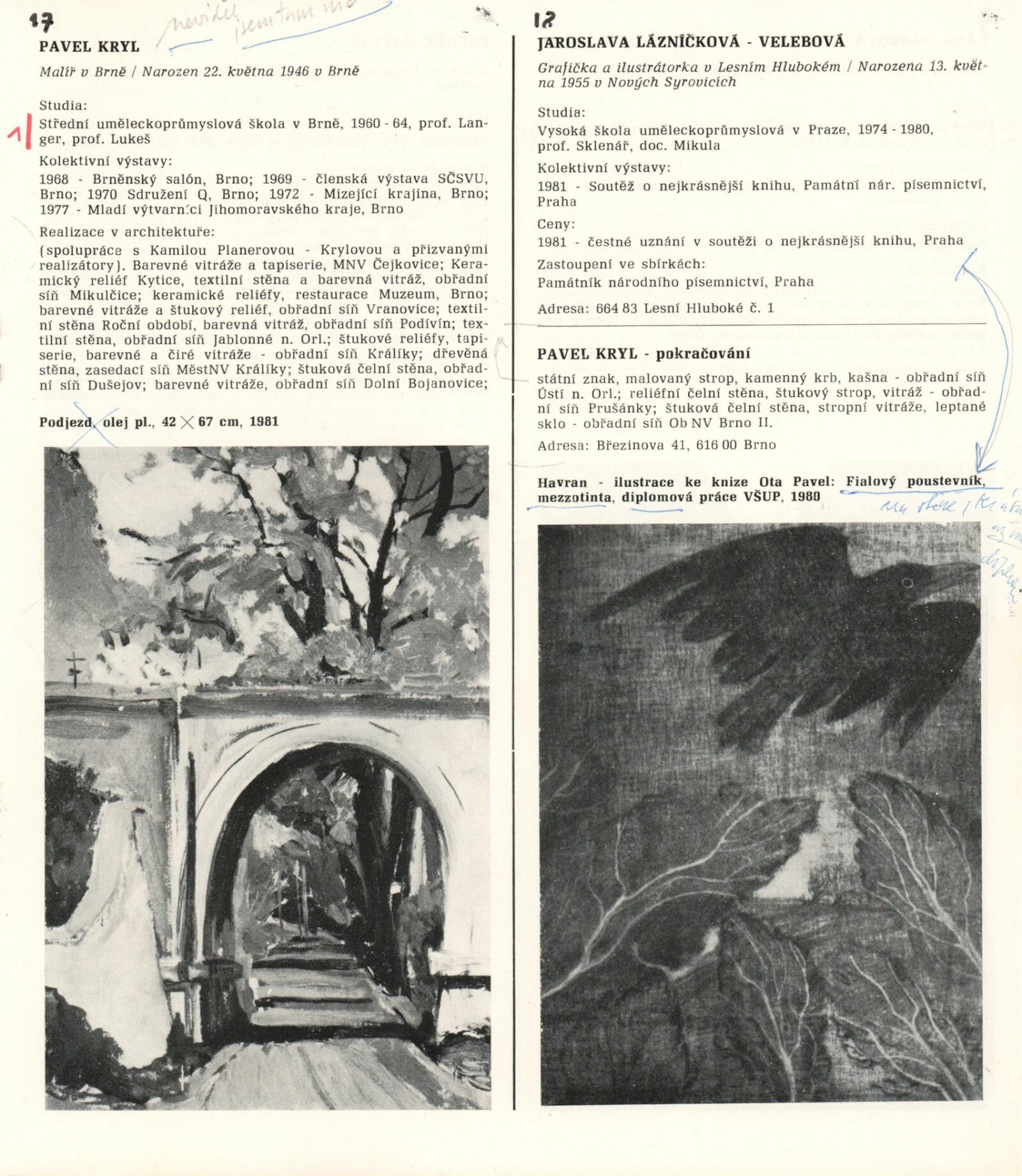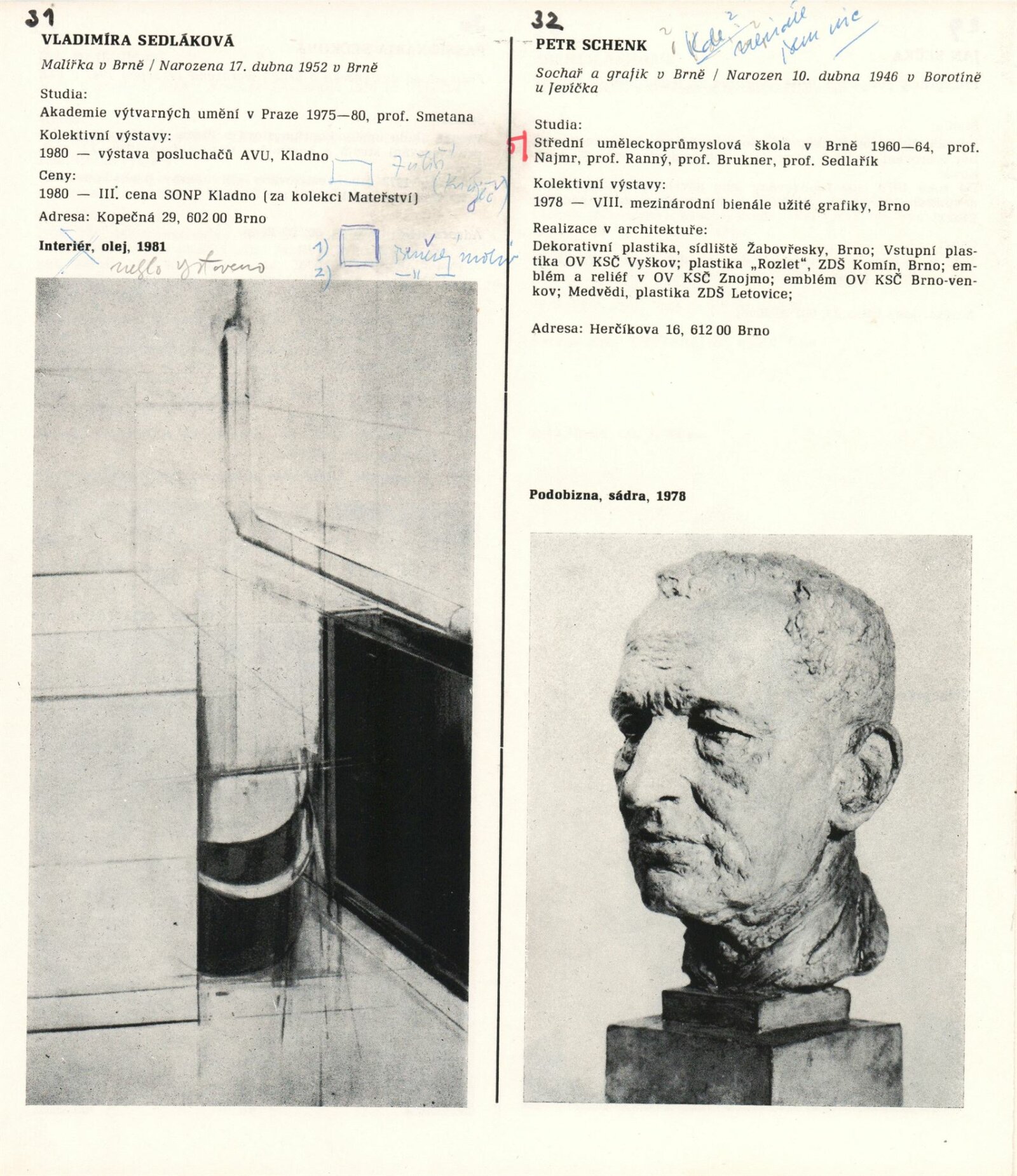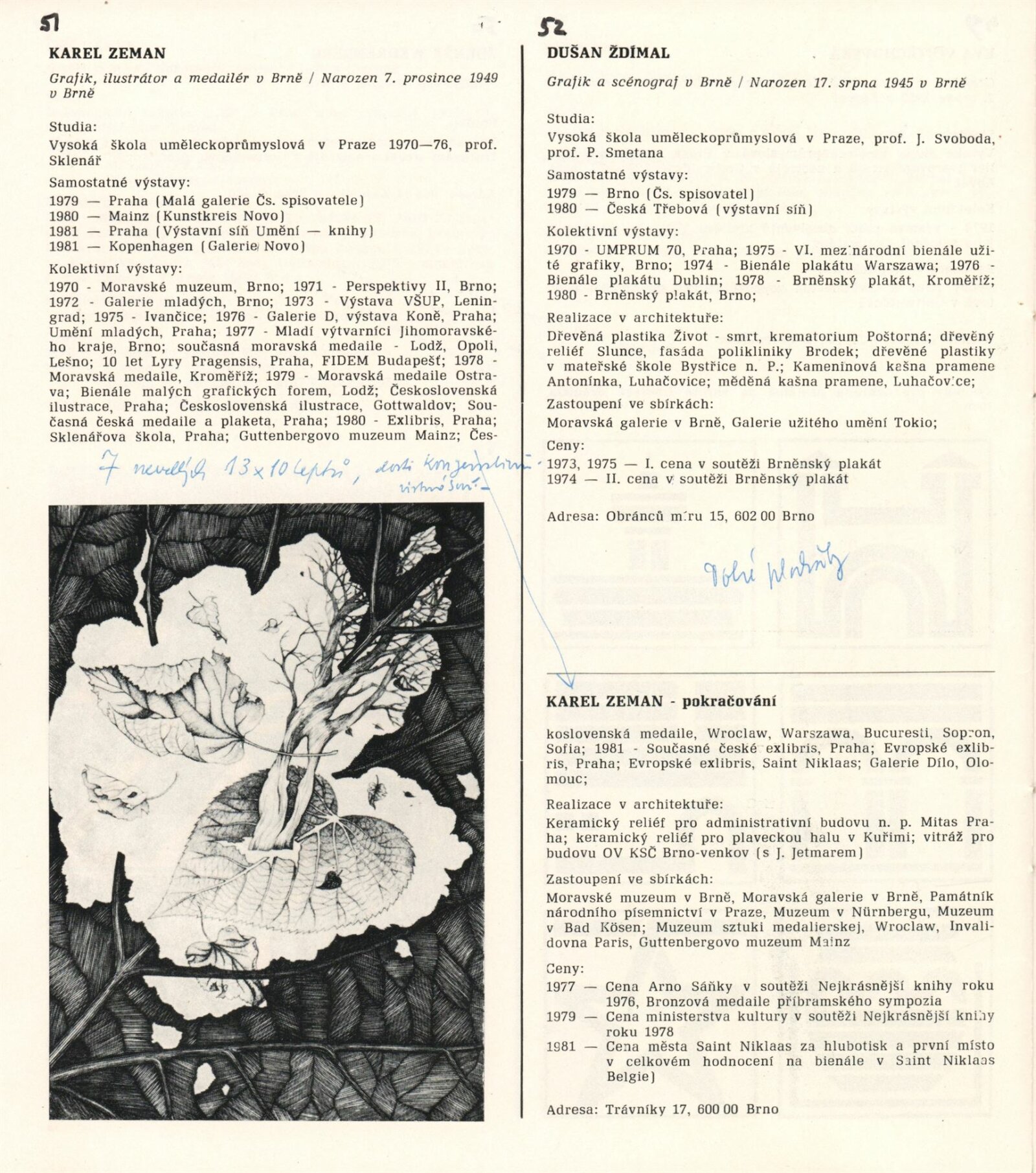 1. Bienále tvorby mladých výtvarníku jihomoravského kraje: Dům umění města Brna 5. 7. – 2. 3. 1981 / Text Zdeněk Čubrda. – Brno: DUmB, 1981. – 40 s., obr., životní data vystavujících, DU 732. – MZK; MG