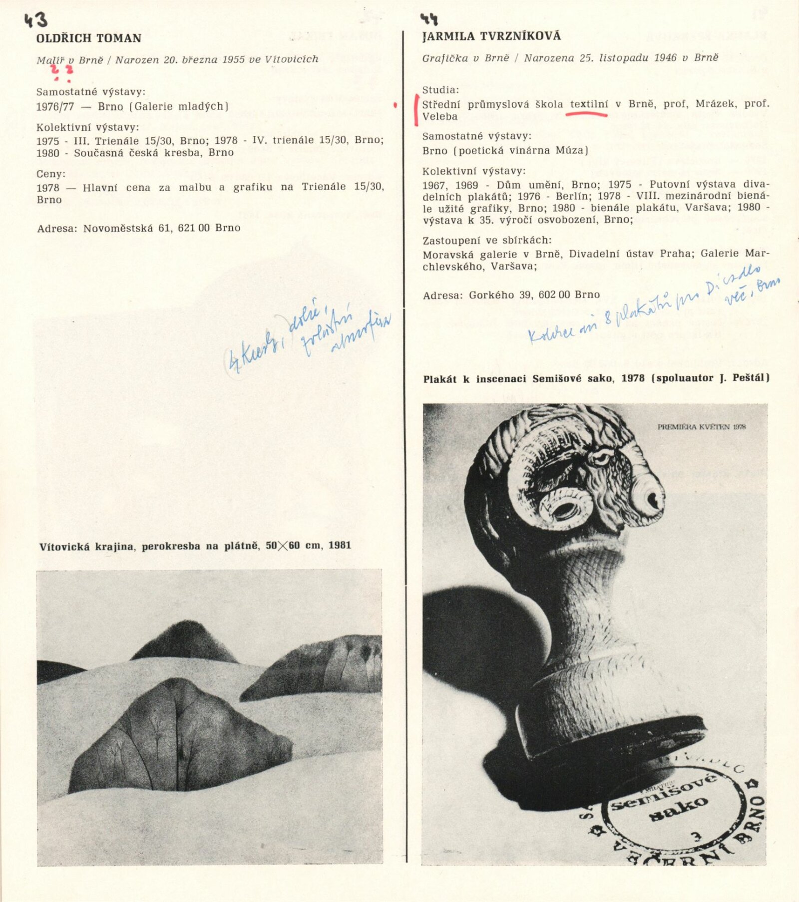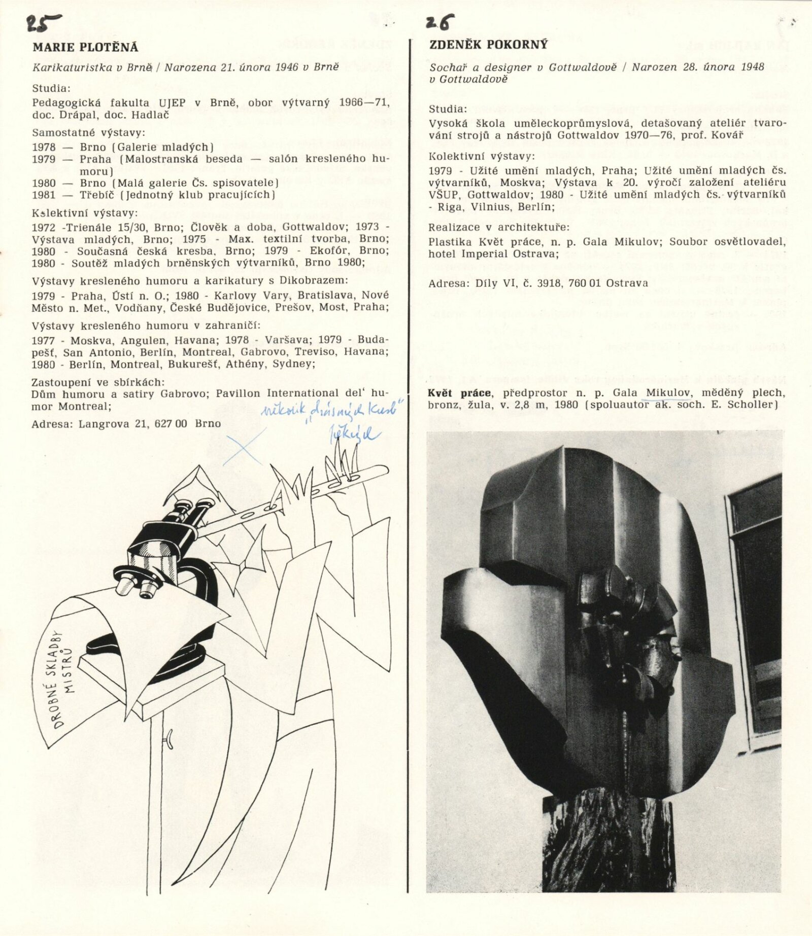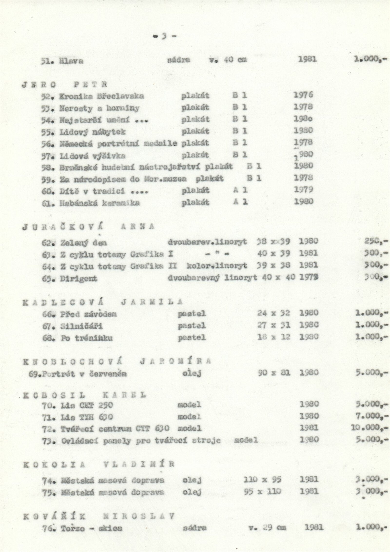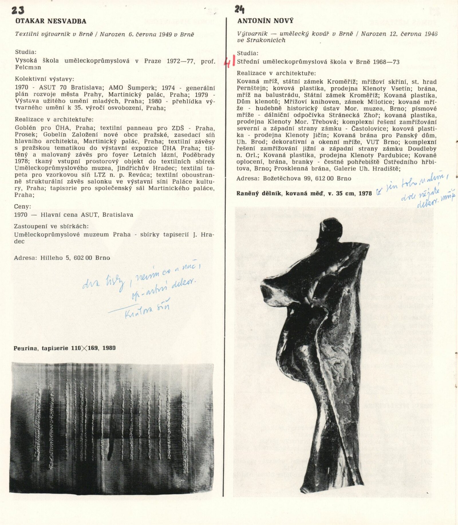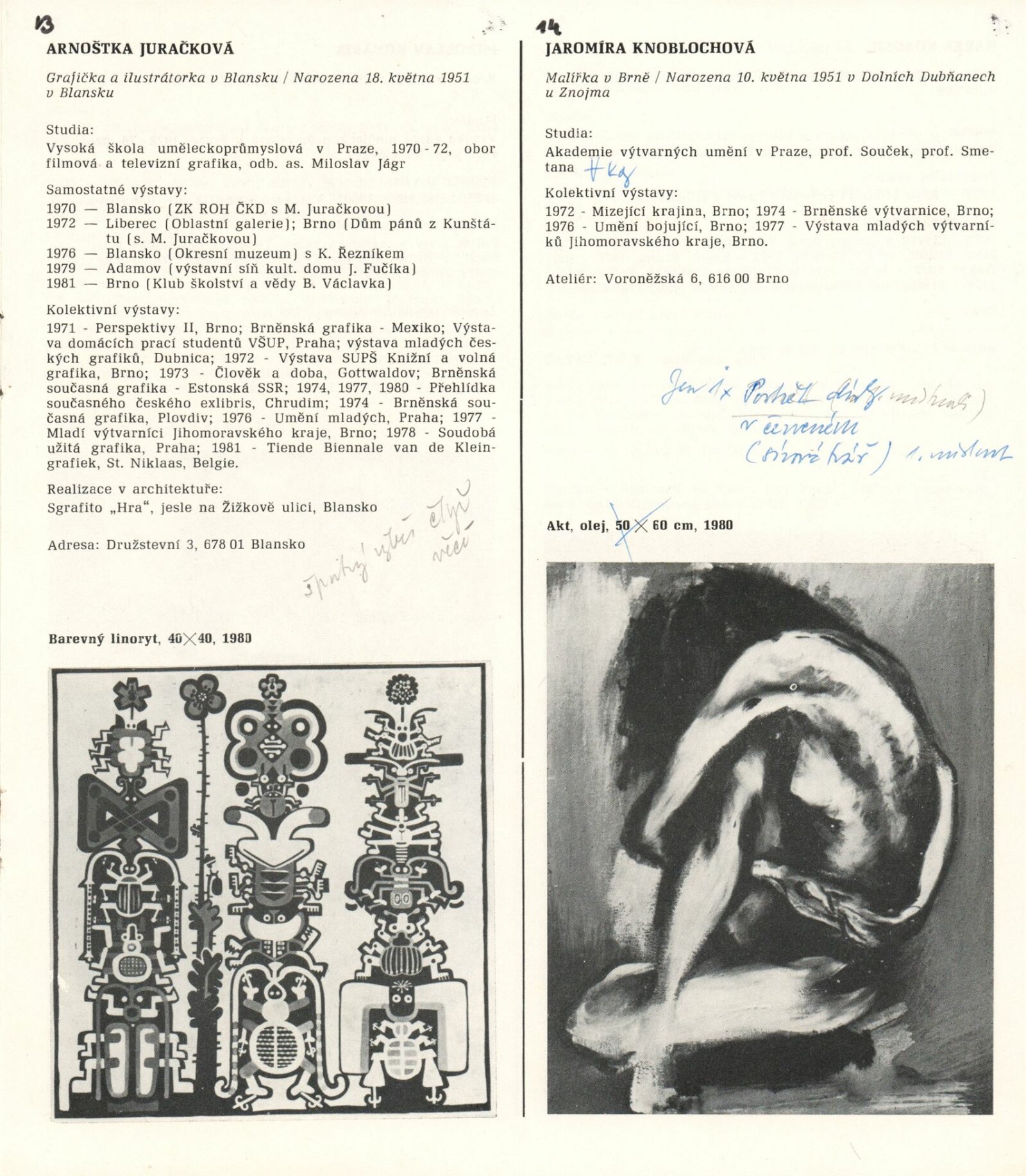 1. Bienále tvorby mladých výtvarníku jihomoravského kraje: Dům umění města Brna 5. 7. – 2. 3. 1981 / Text Zdeněk Čubrda. – Brno: DUmB, 1981. – 40 s., obr., životní data vystavujících, DU 732. – MZK; MG