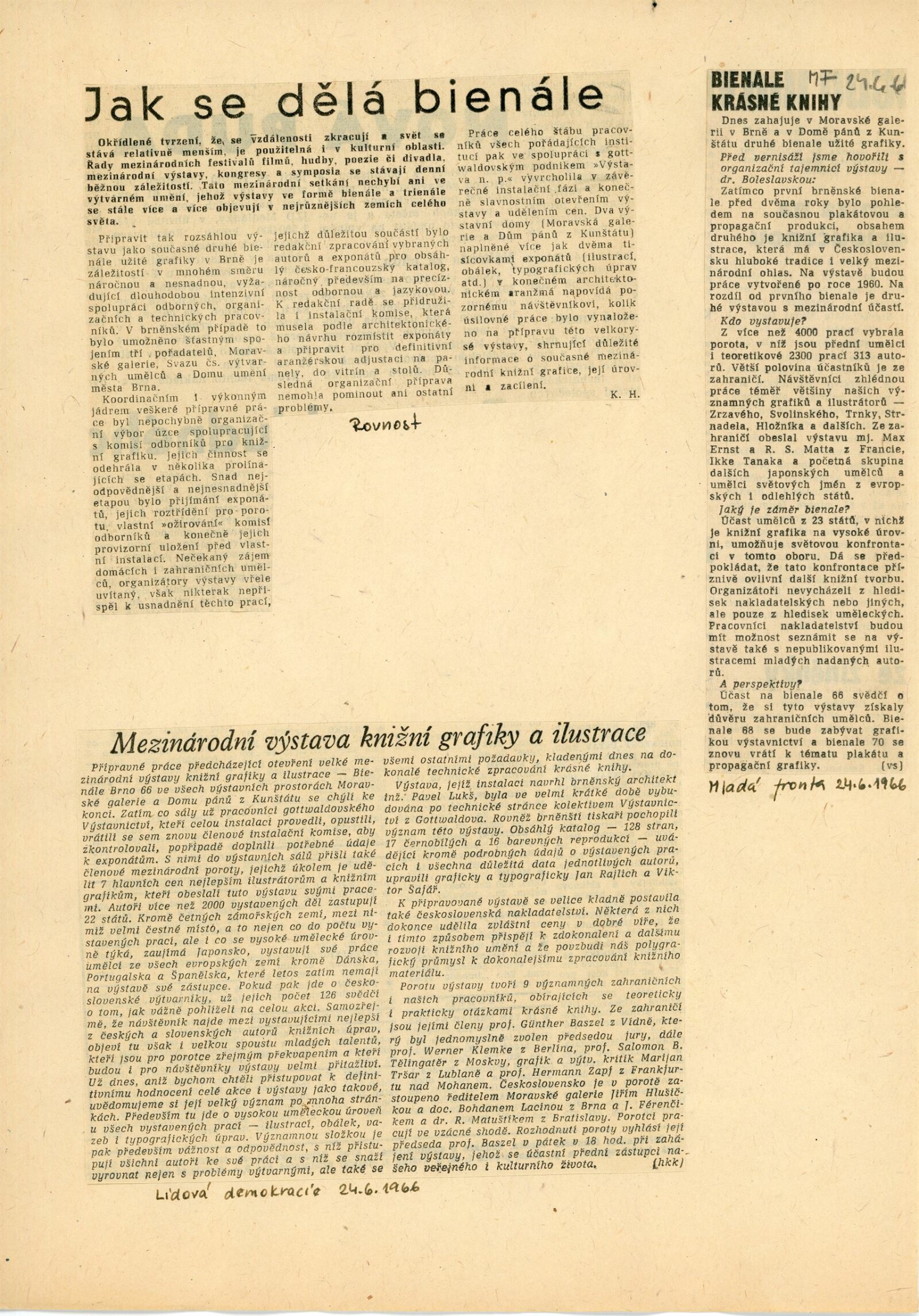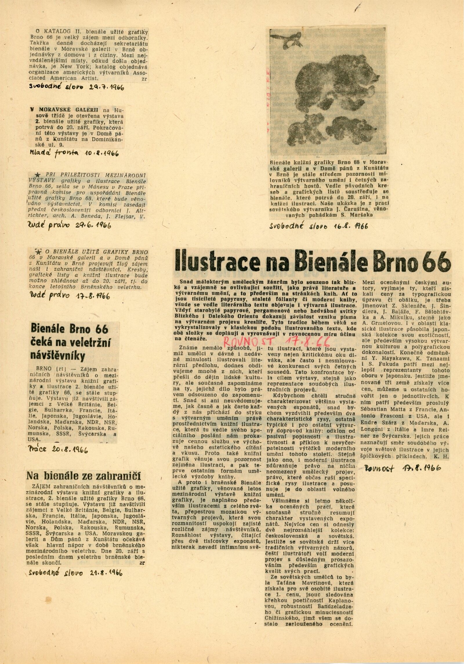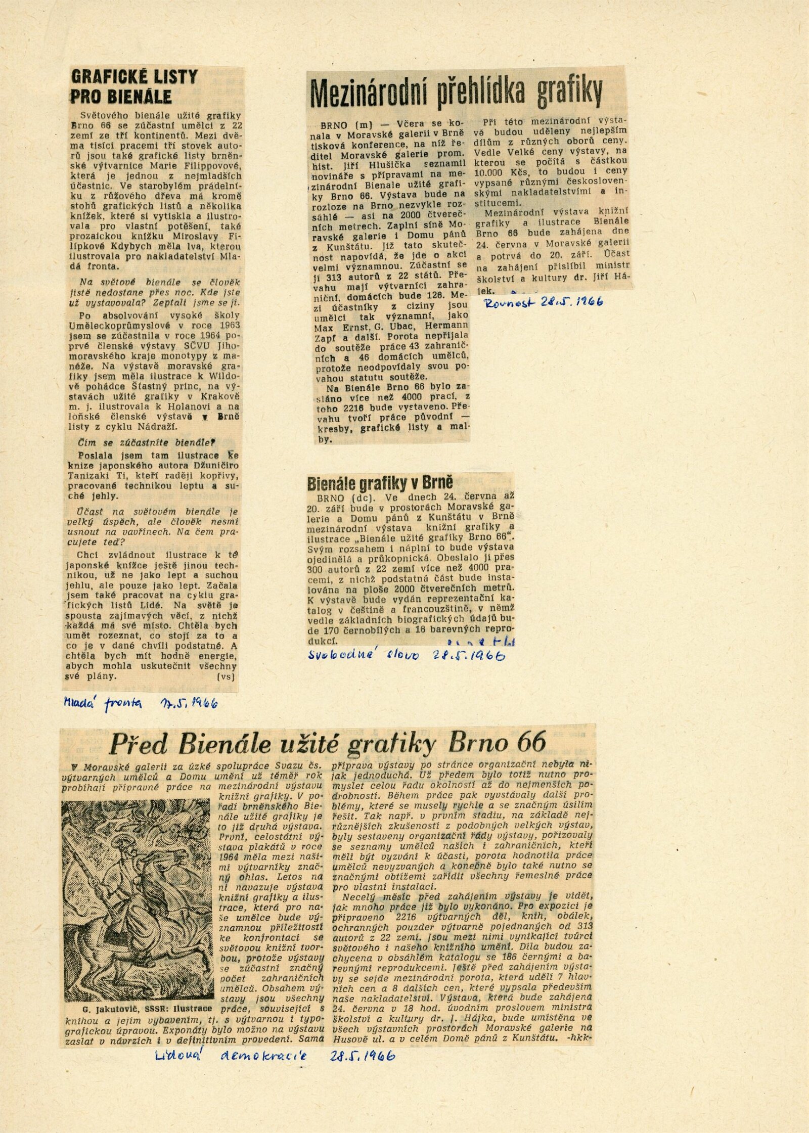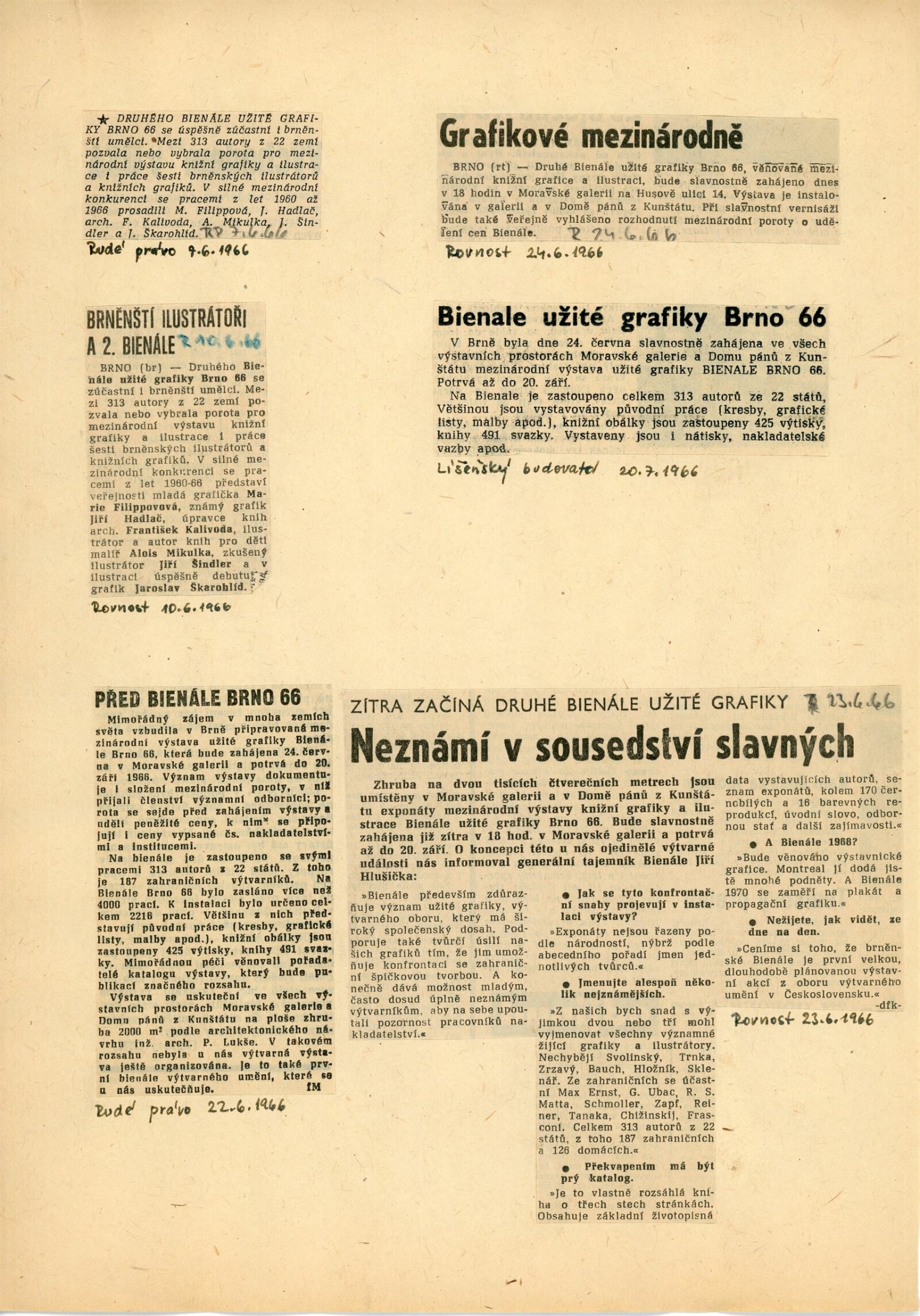 Mezinárodní výstava knižní grafiky a ilustrace. 2. bienále užité grafiky Brno 1966: Dům umění města Brna / Dům pánů z Kunštátu, Moravská galerie v Brně, 24. 6. – 20. 9. 1966 / Texty: Josef Grohman, Jiří Hlušička. – Brno: SČSVU, 1966. – 128 s., 136 s. obr. příl., skládačka, 6 s., název a text též francouzsky, DPK 310. – MZK