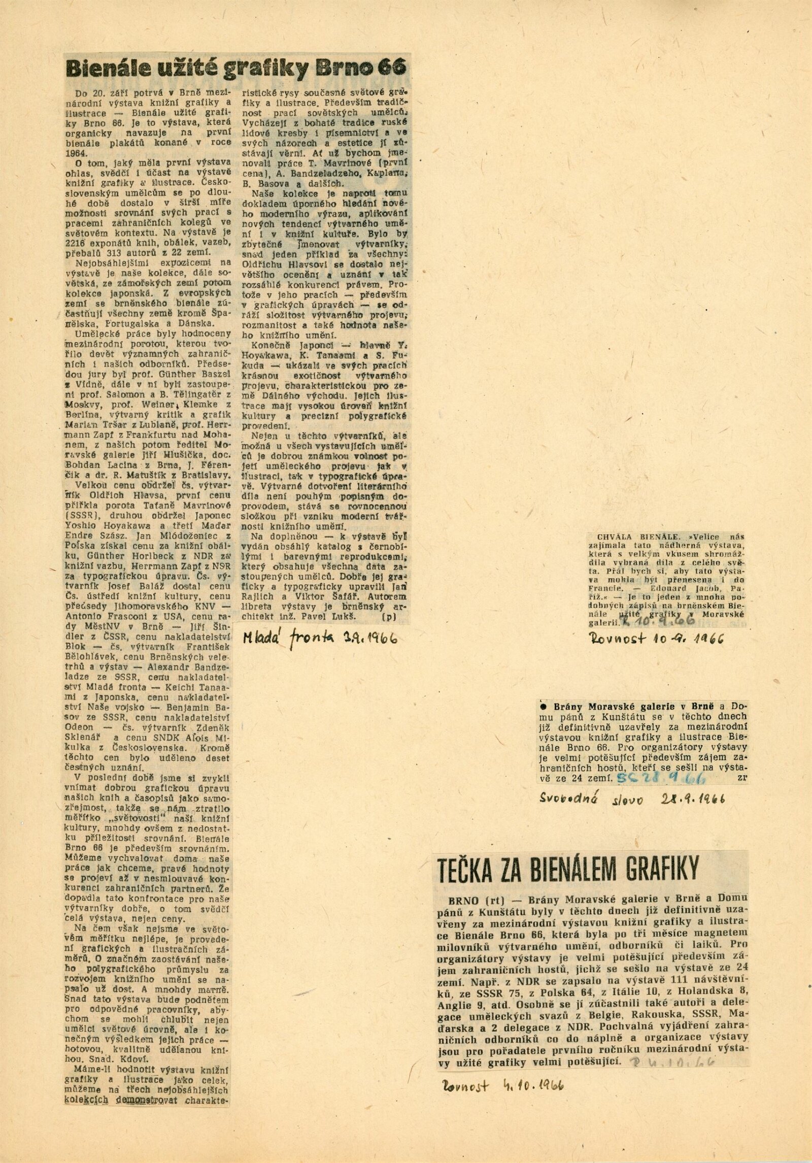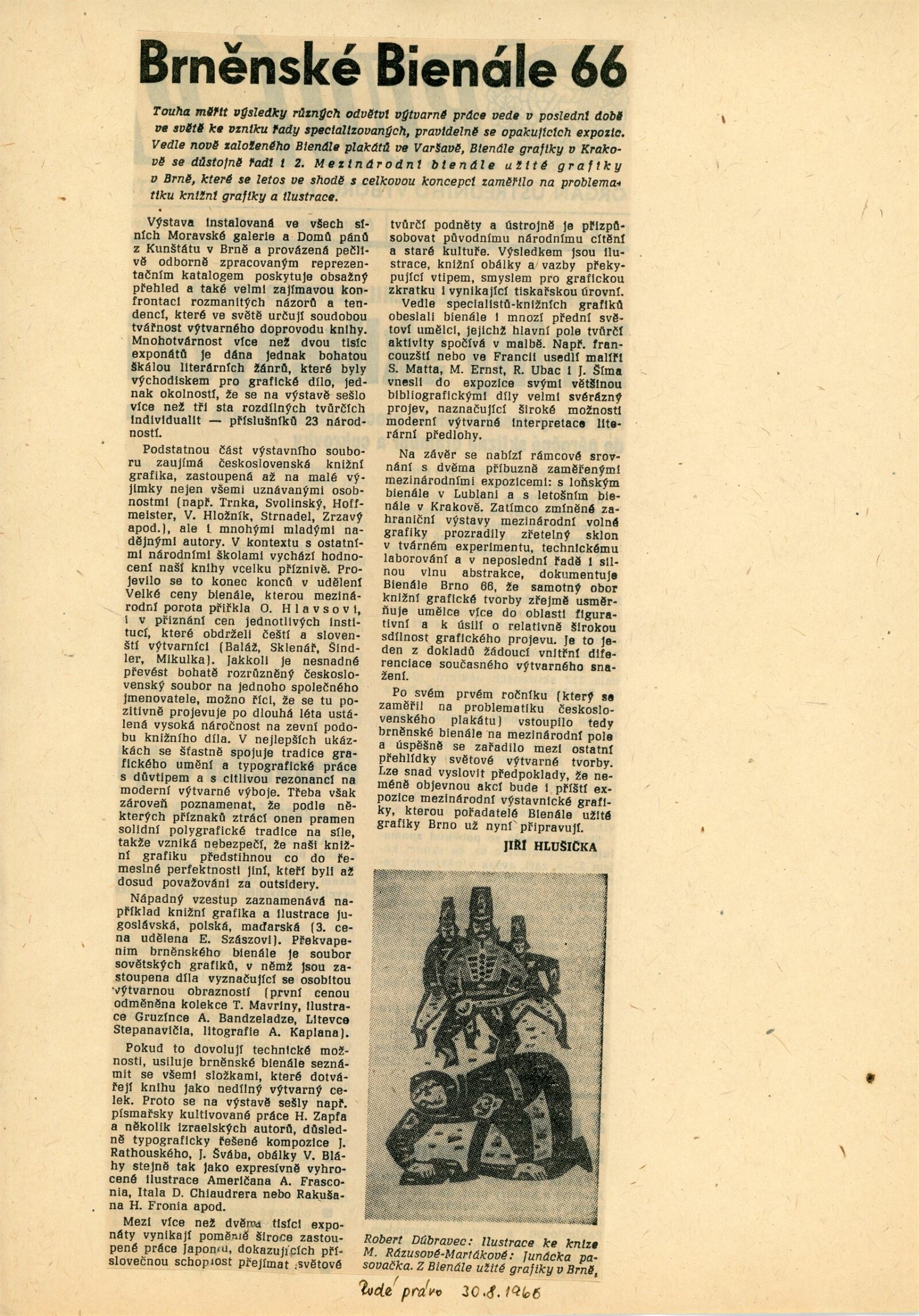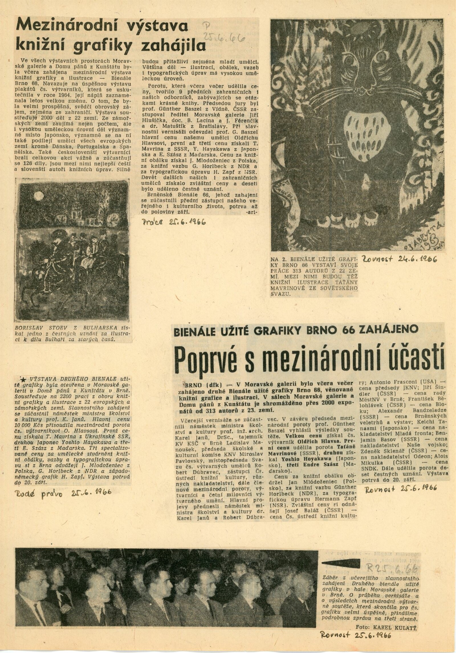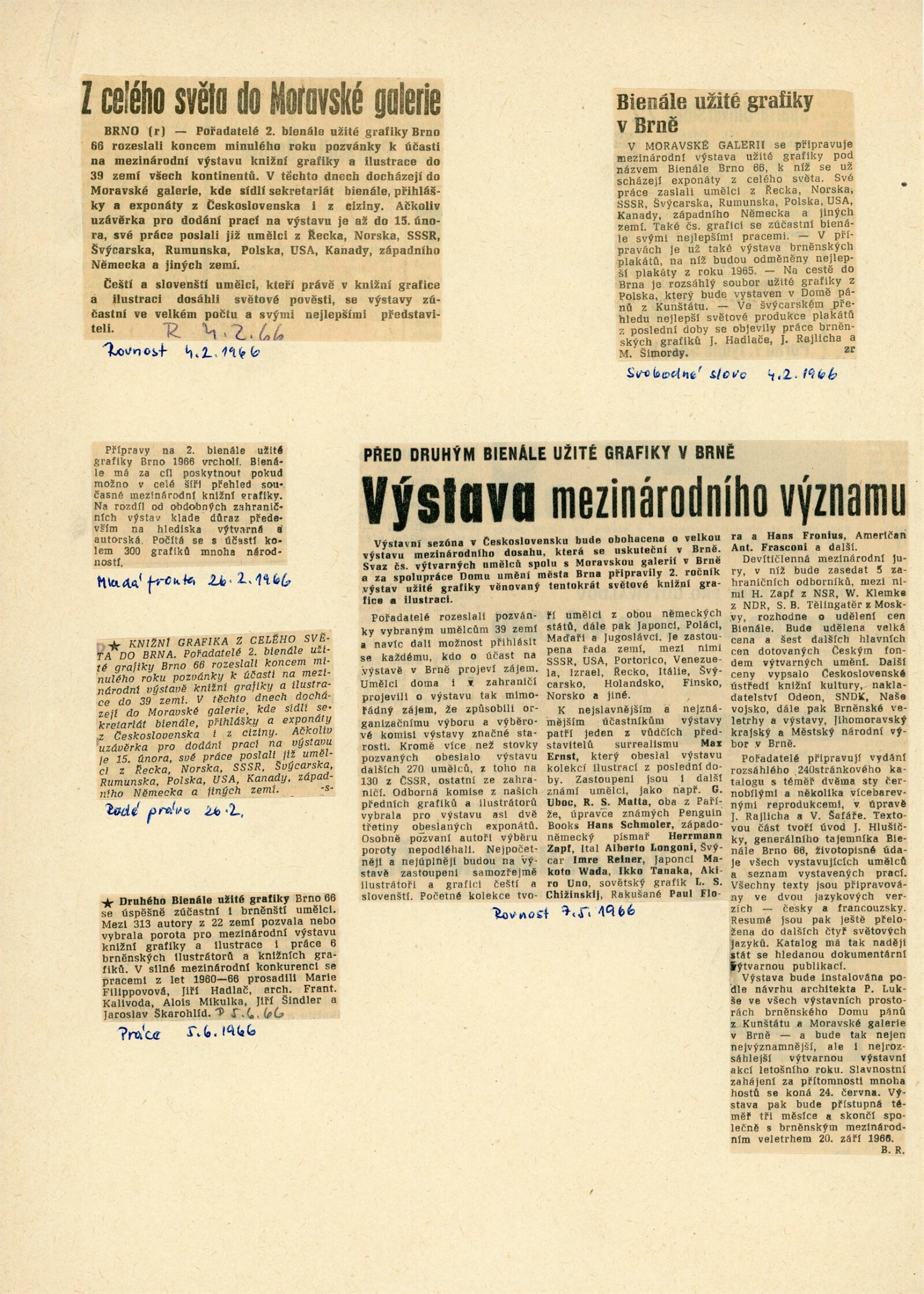 Mezinárodní výstava knižní grafiky a ilustrace. 2. bienále užité grafiky Brno 1966: Dům umění města Brna / Dům pánů z Kunštátu, Moravská galerie v Brně, 24. 6. – 20. 9. 1966 / Texty: Josef Grohman, Jiří Hlušička. – Brno: SČSVU, 1966. – 128 s., 136 s. obr. příl., skládačka, 6 s., název a text též francouzsky, DPK 310. – MZK