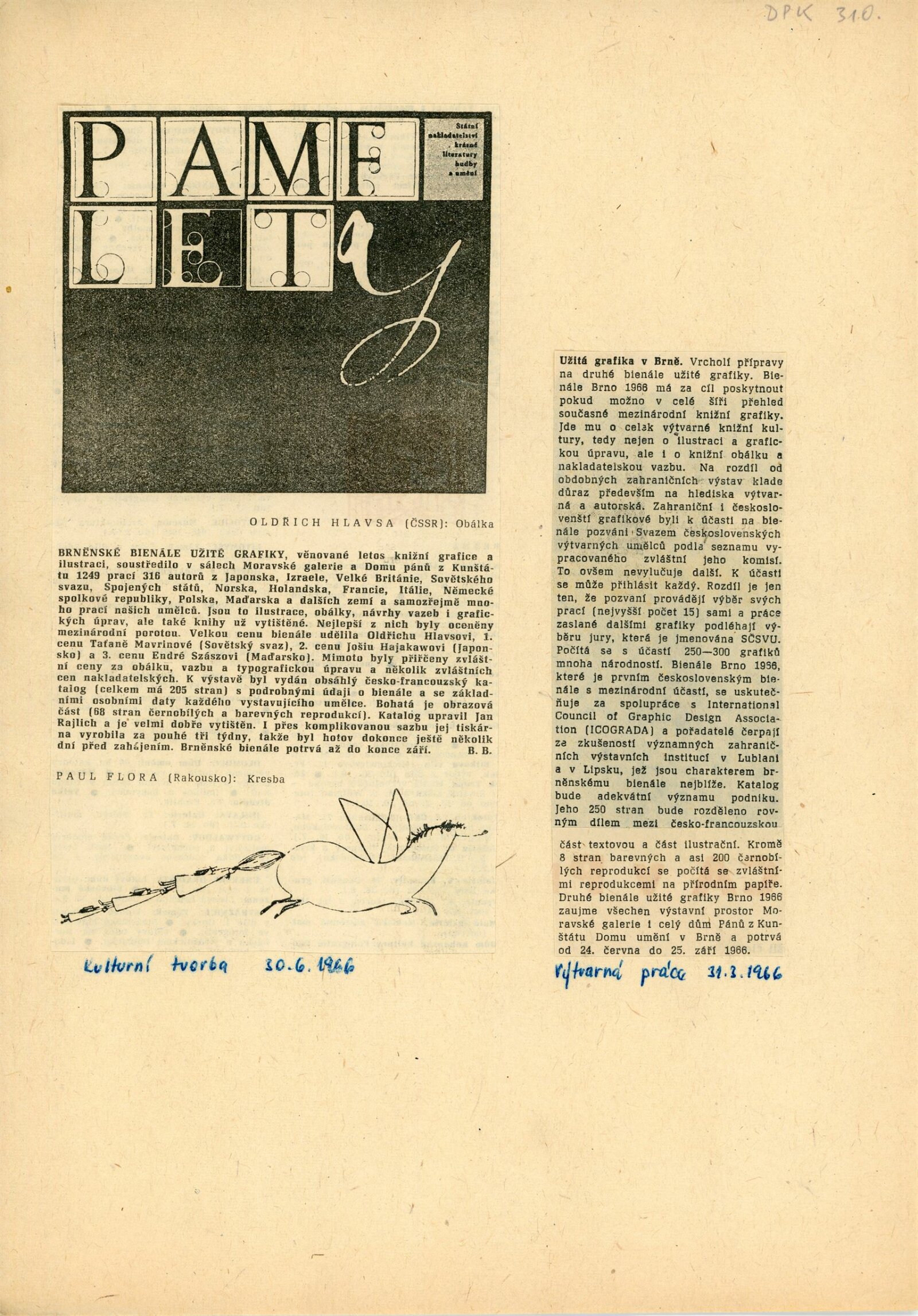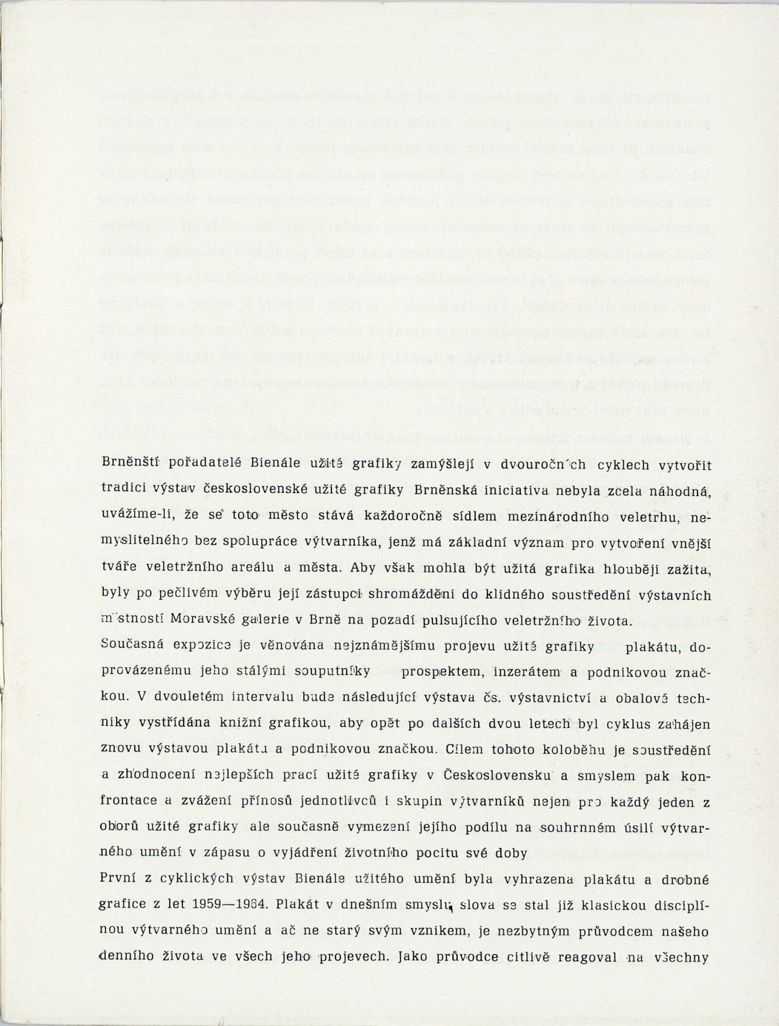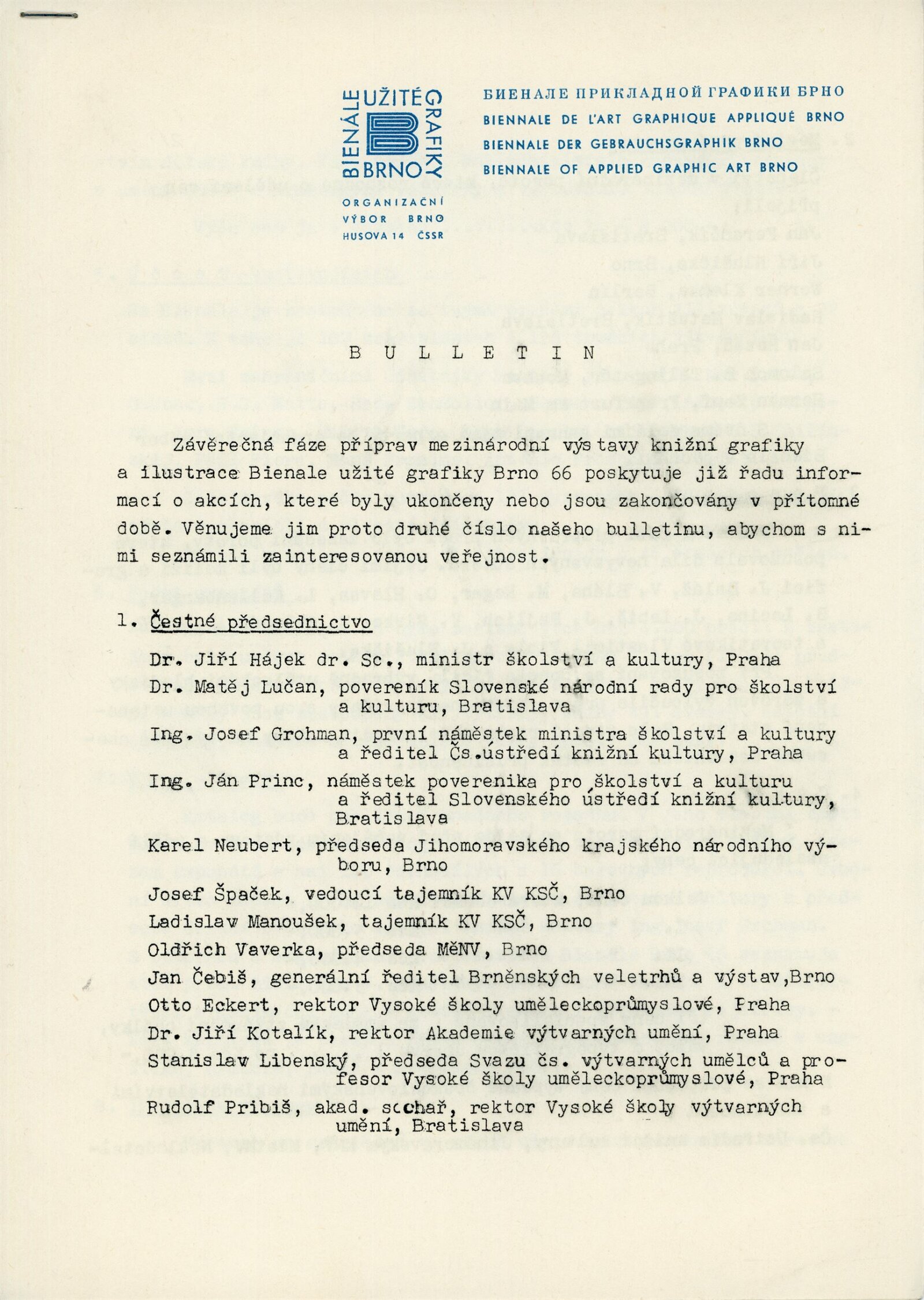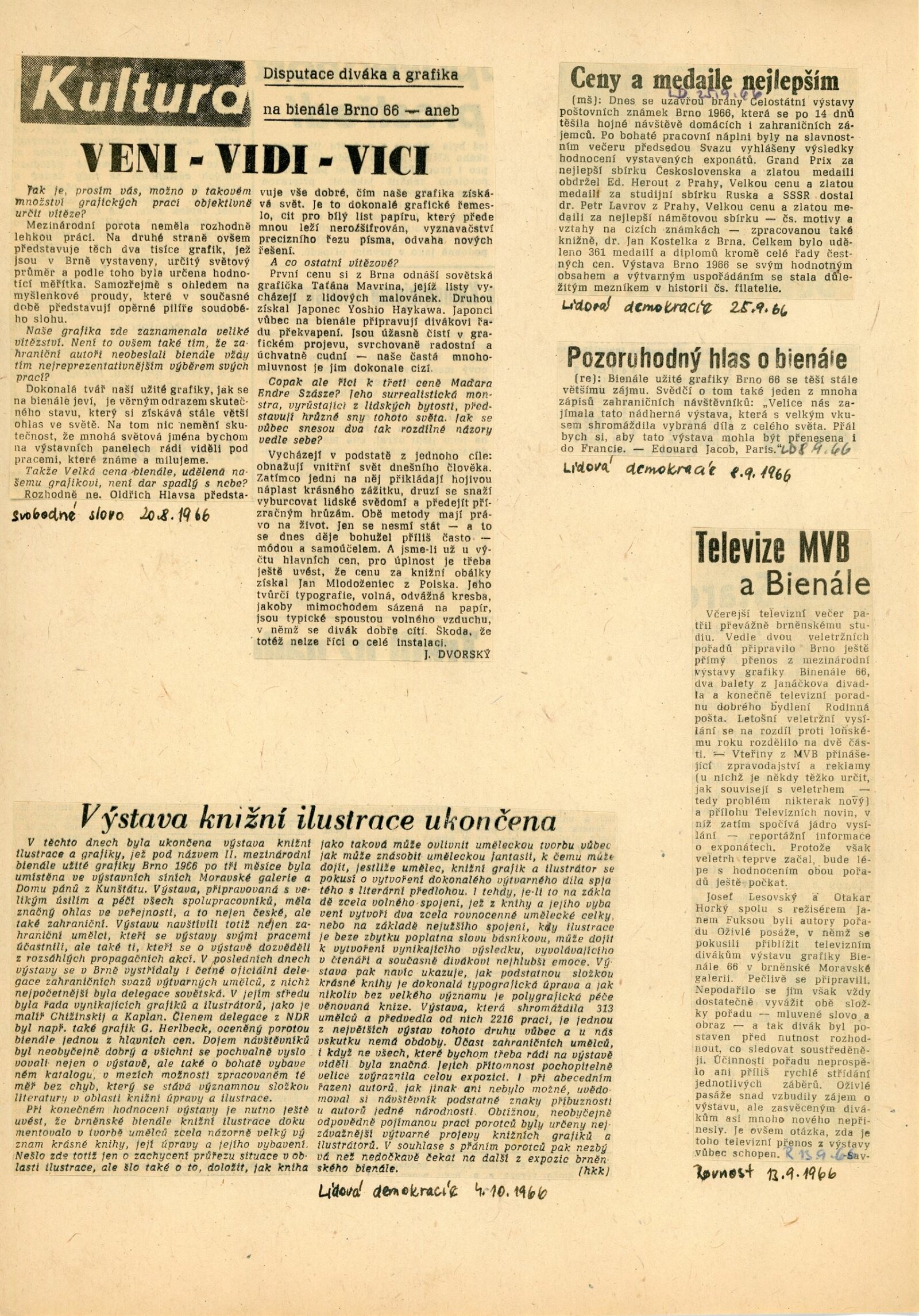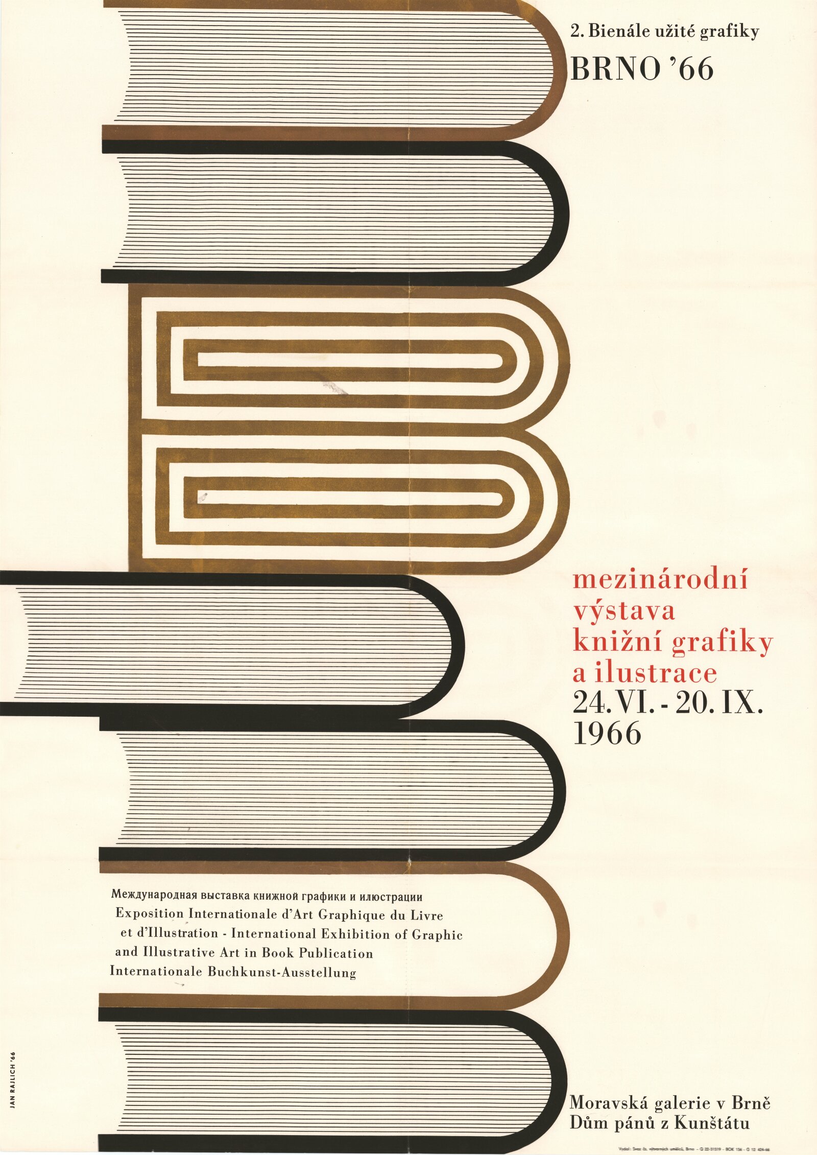 Mezinárodní výstava knižní grafiky a ilustrace. 2. bienále užité grafiky Brno 1966: Dům umění města Brna / Dům pánů z Kunštátu, Moravská galerie v Brně, 24. 6. – 20. 9. 1966 / Texty: Josef Grohman, Jiří Hlušička. – Brno: SČSVU, 1966. – 128 s., 136 s. obr. příl., skládačka, 6 s., název a text též francouzsky, DPK 310. – MZK