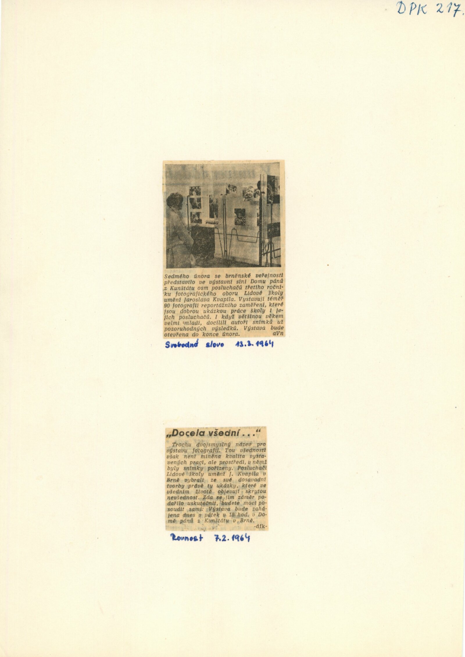 3. ročník LŠU Jaroslava Kvapila – Brno: Dům umění města Brna / Dům pánů z Kunštátu, 52. výstava Kabinetu fotografie Jaromíra Funka, 7. 2. – 1. 3. 1964 / Text: Antonín Hinšt. – Brno: Lidová škola umění Jaroslava Kvapila, 1964. – složený list, obr., DPK 217. – MG