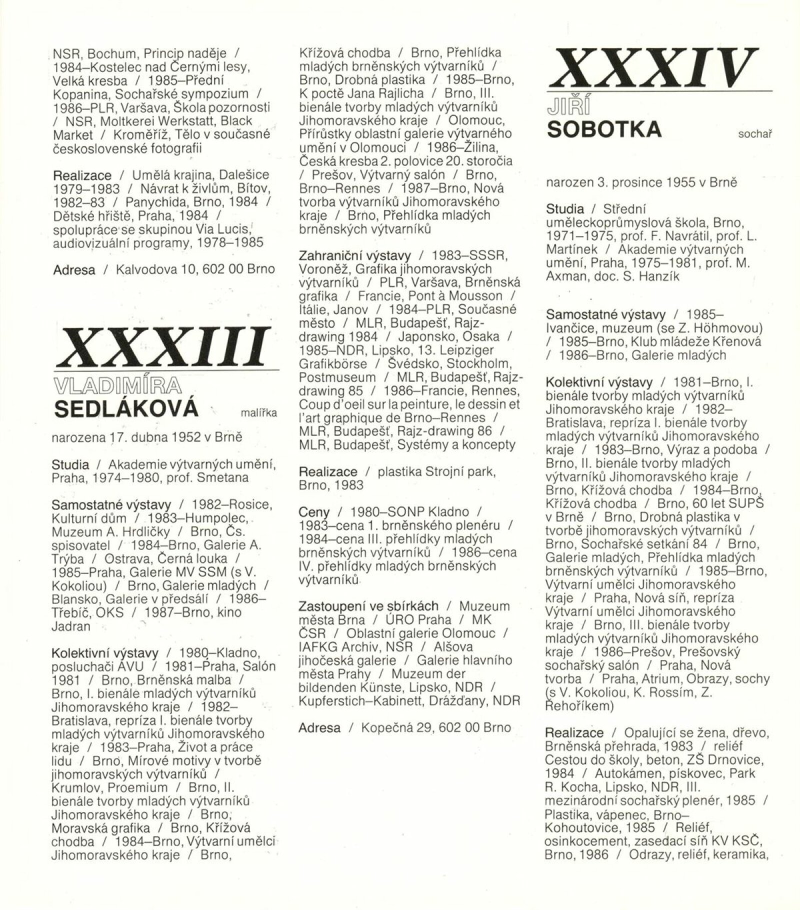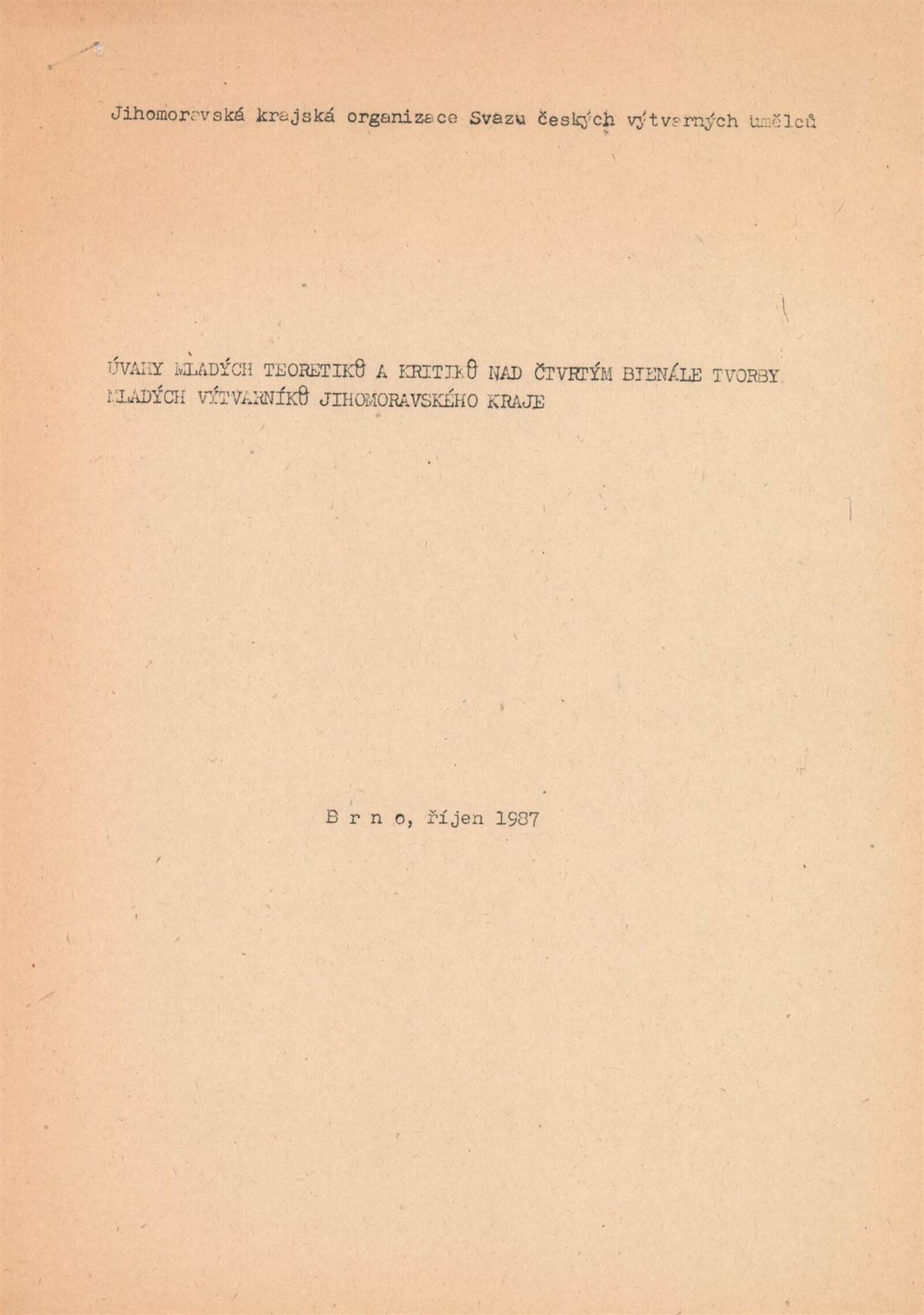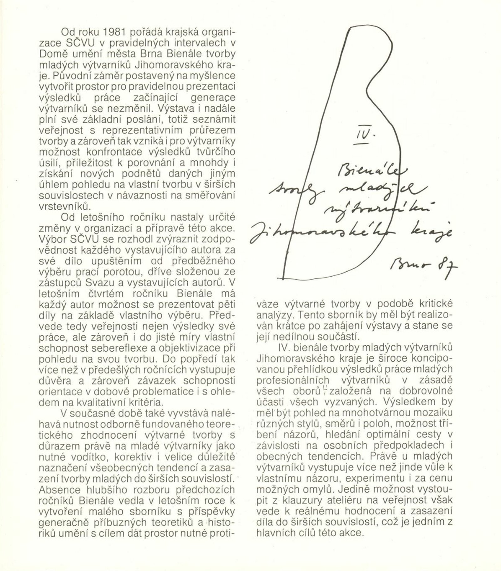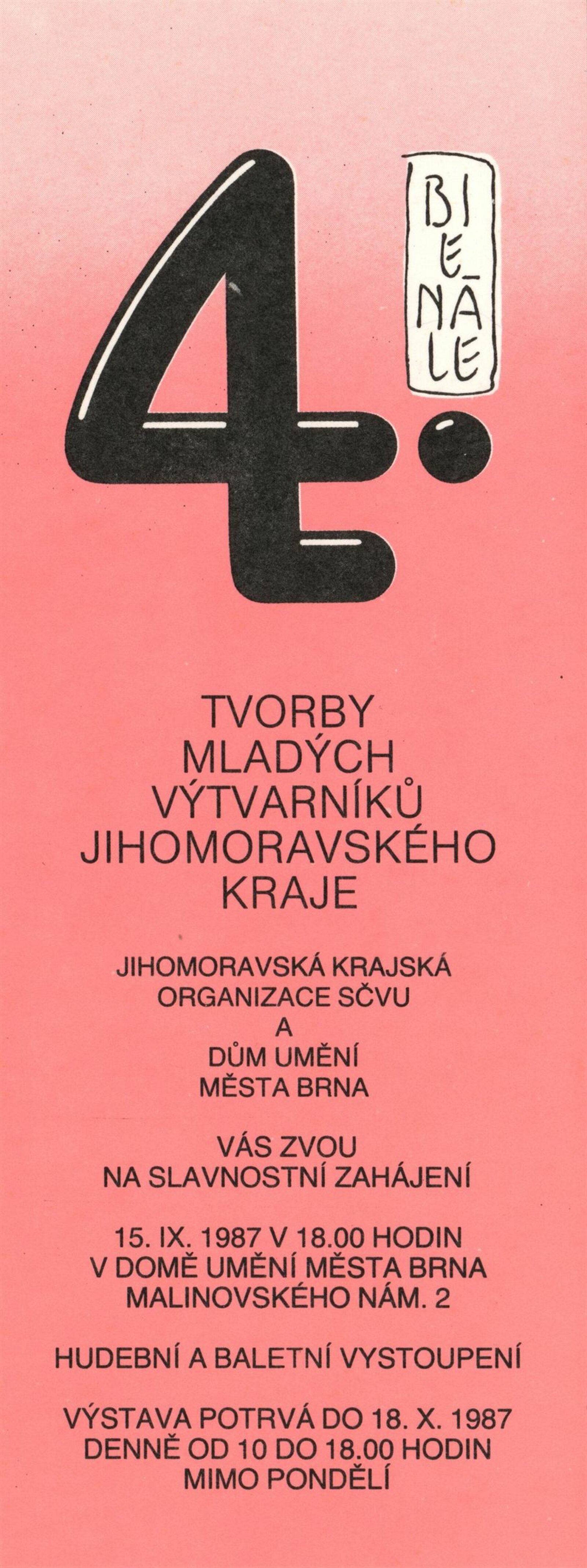 4. bienále tvorby mladých výtvarníků Jihomoravského kraje: Dům umění města Brna, 15. 9. – 18. 10. 1987 / Text: Petr Nedoma. – Brno: SČVU, 1987. – [56] s., obr., životní data vystavujících, DU 838