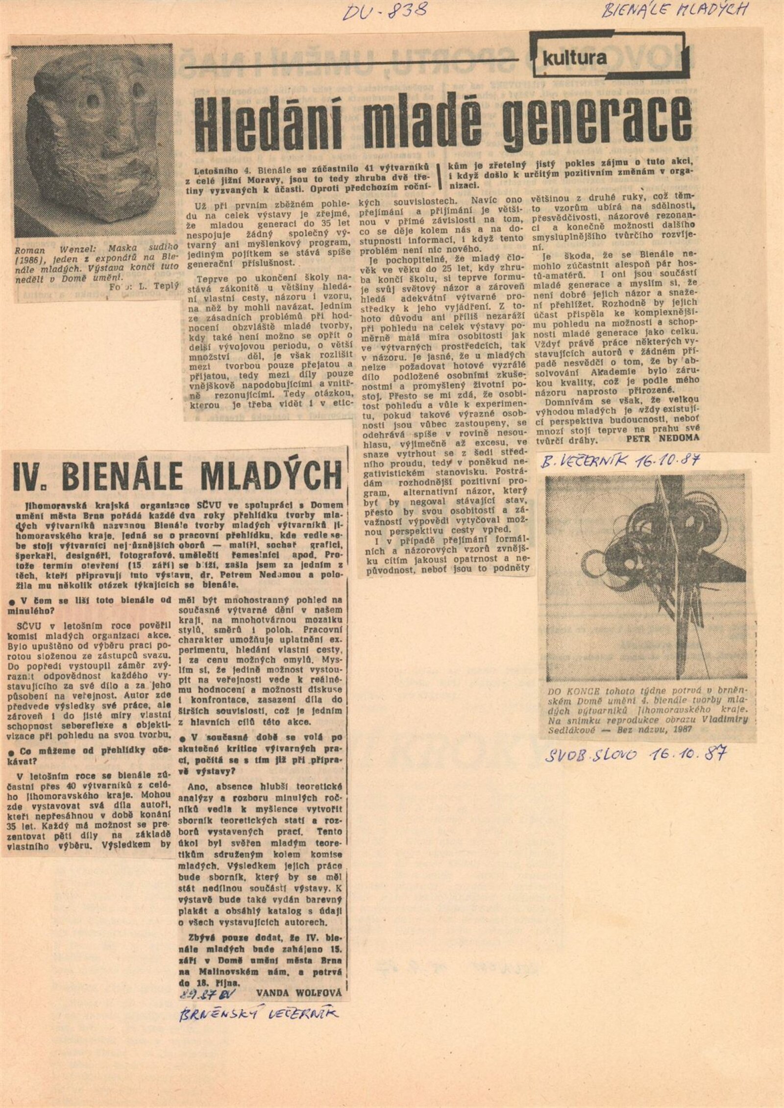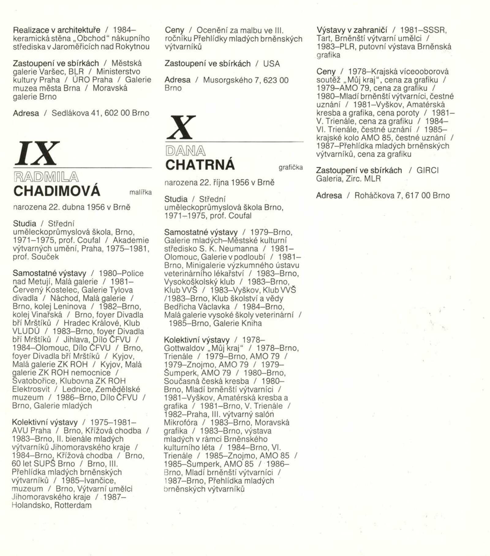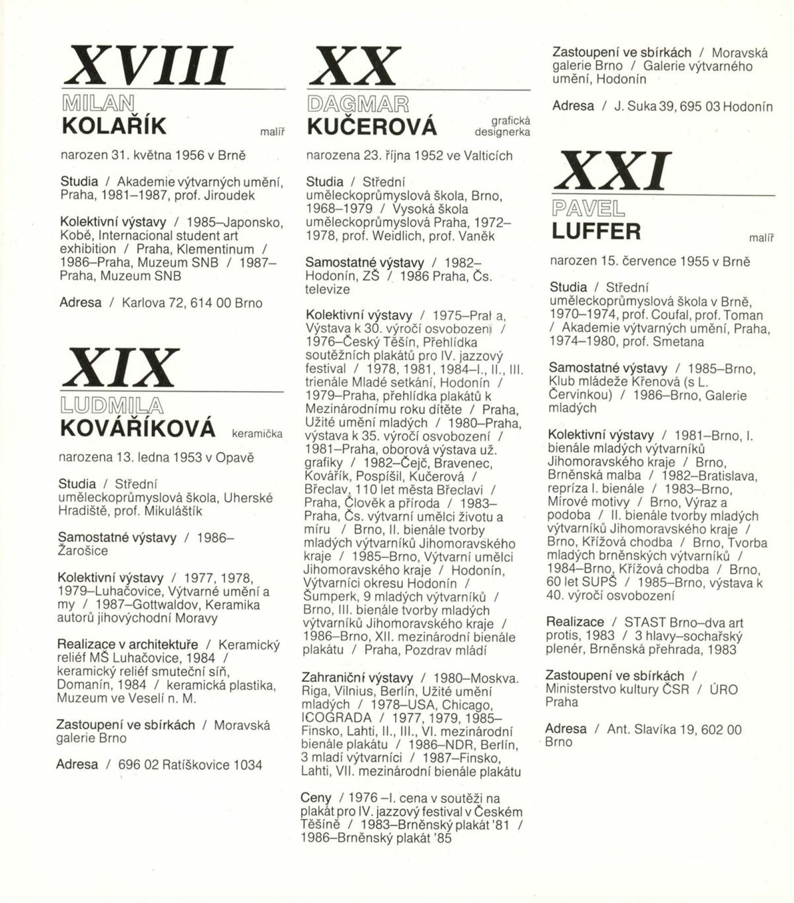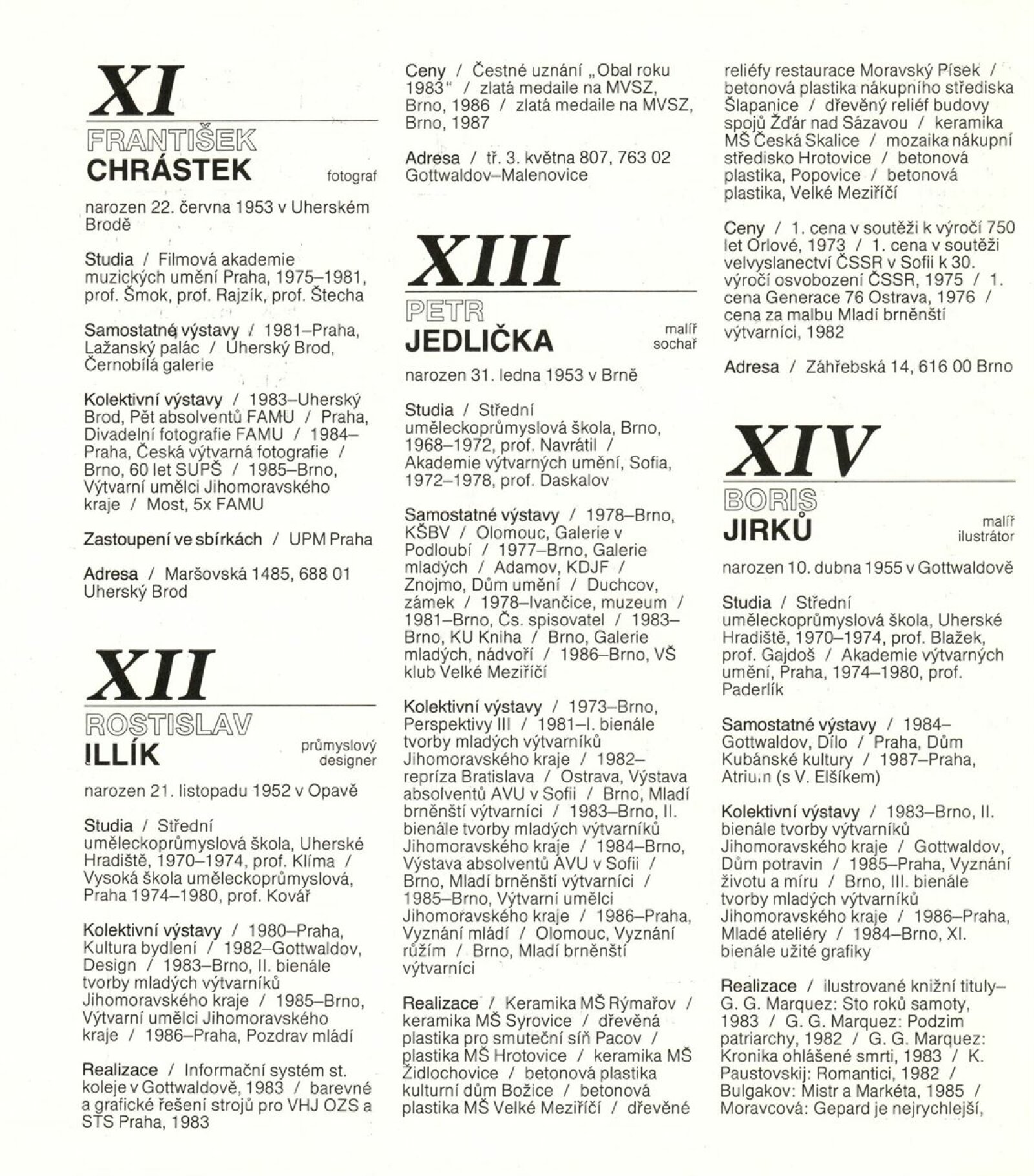 4. bienále tvorby mladých výtvarníků Jihomoravského kraje: Dům umění města Brna, 15. 9. – 18. 10. 1987 / Text: Petr Nedoma. – Brno: SČVU, 1987. – [56] s., obr., životní data vystavujících, DU 838