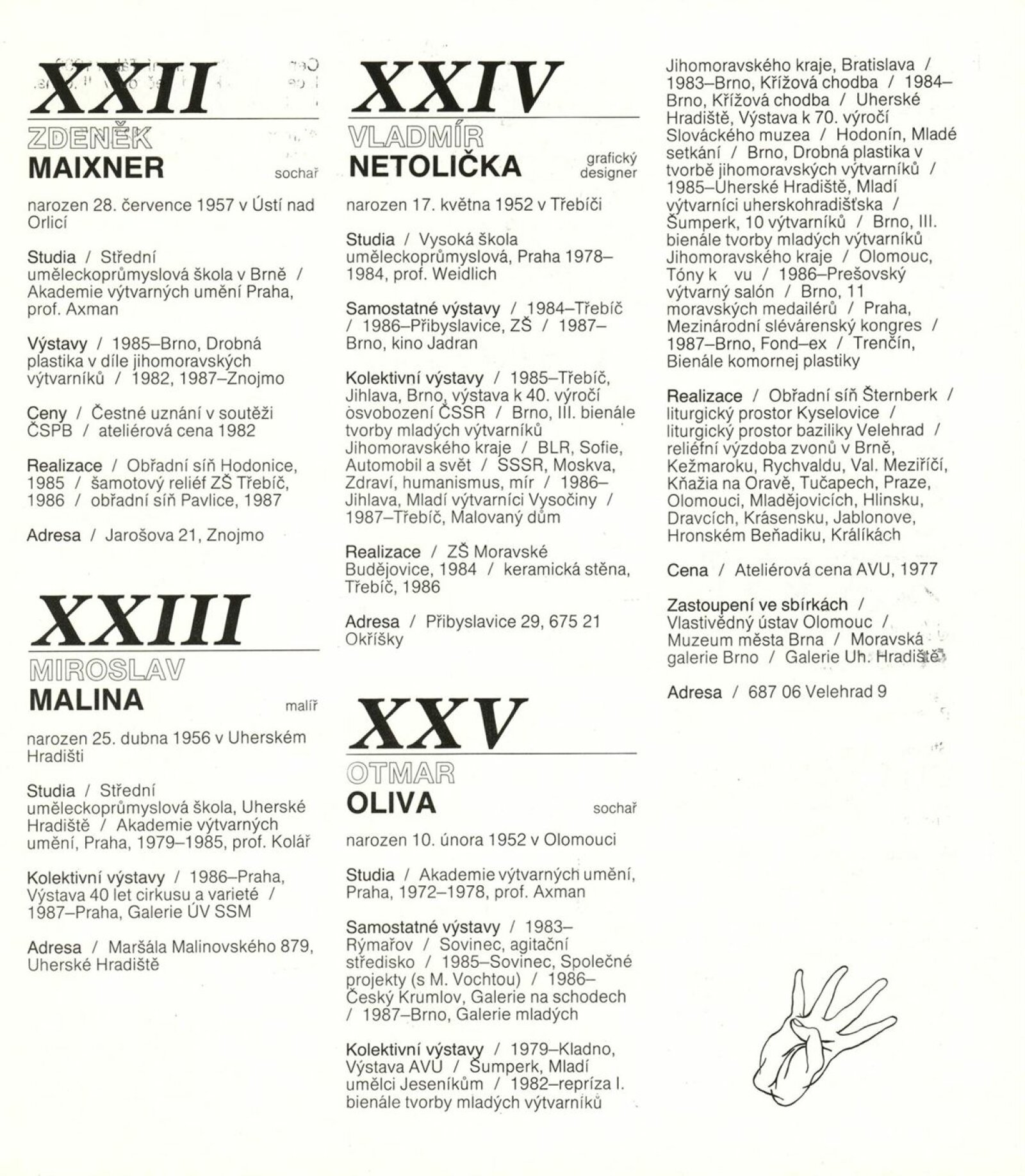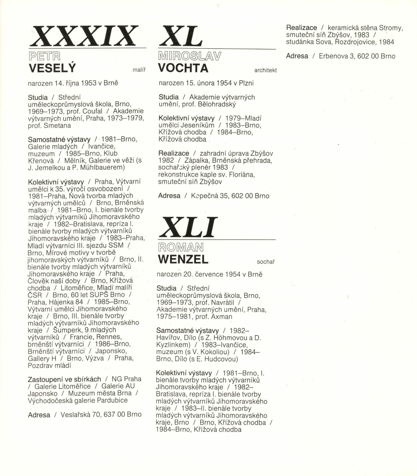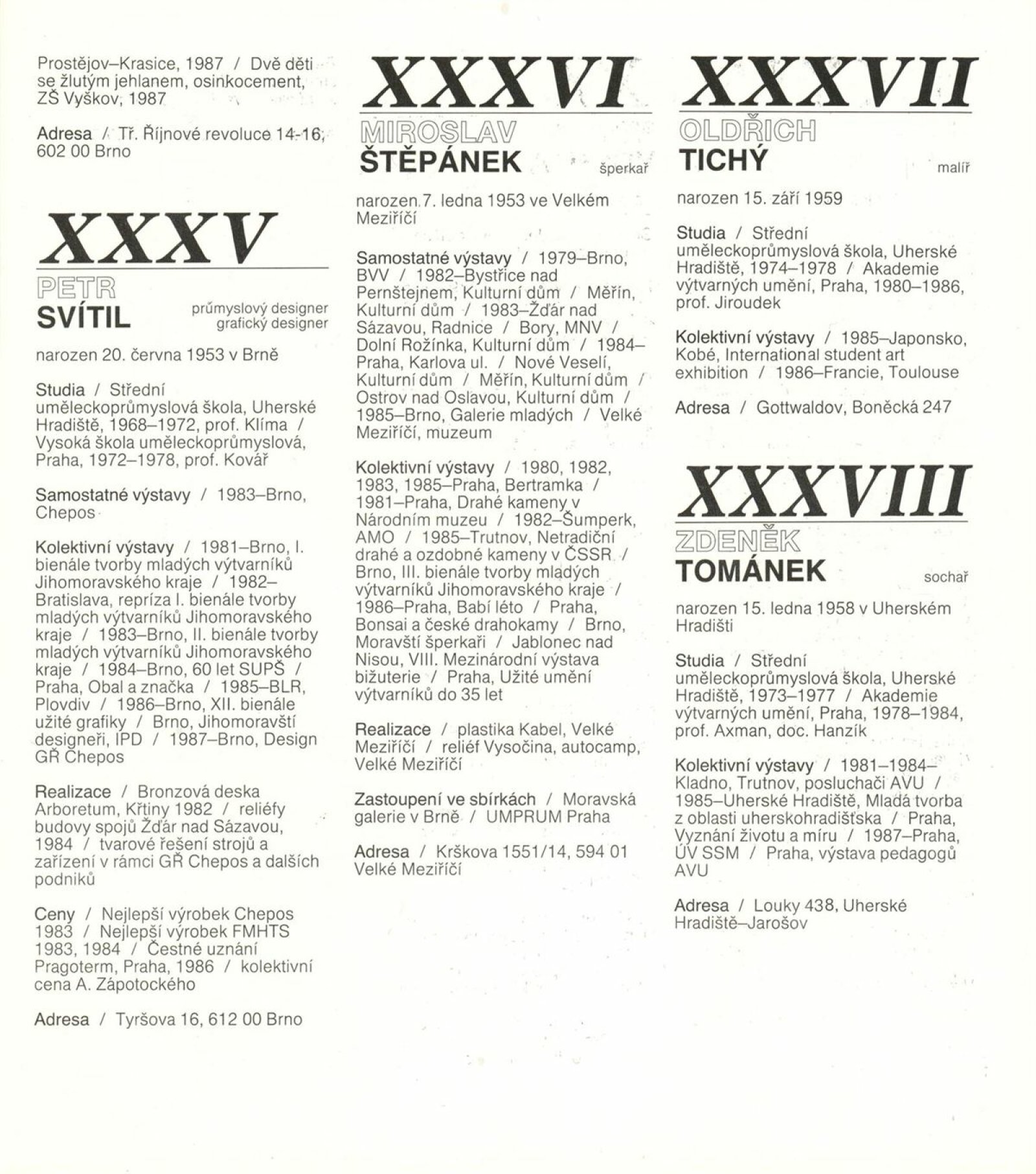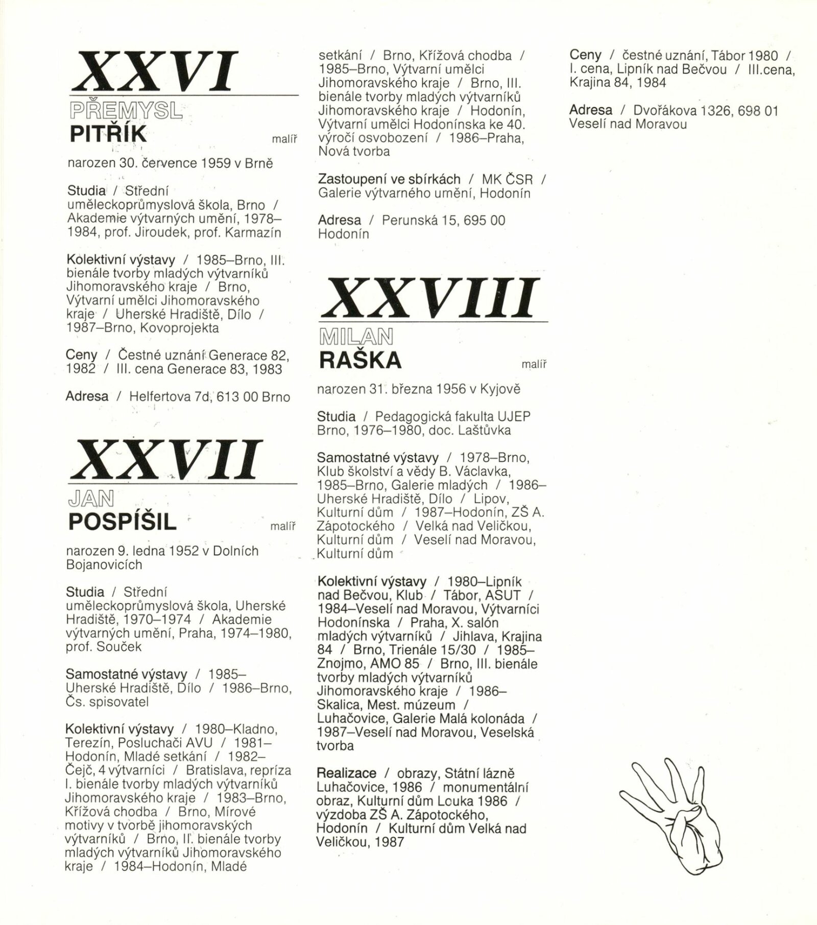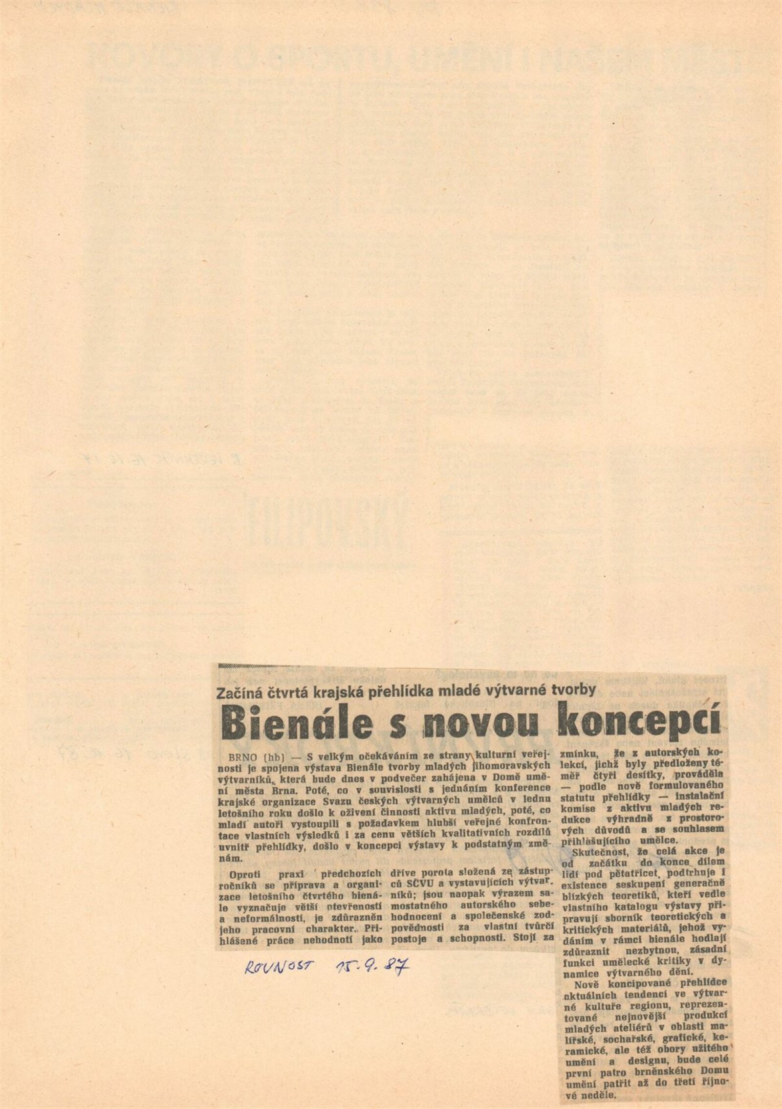 4. bienále tvorby mladých výtvarníků Jihomoravského kraje: Dům umění města Brna, 15. 9. – 18. 10. 1987 / Text: Petr Nedoma. – Brno: SČVU, 1987. – [56] s., obr., životní data vystavujících, DU 838