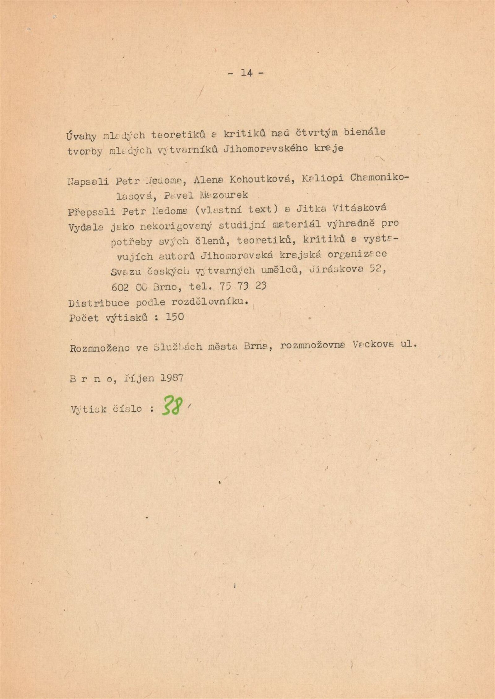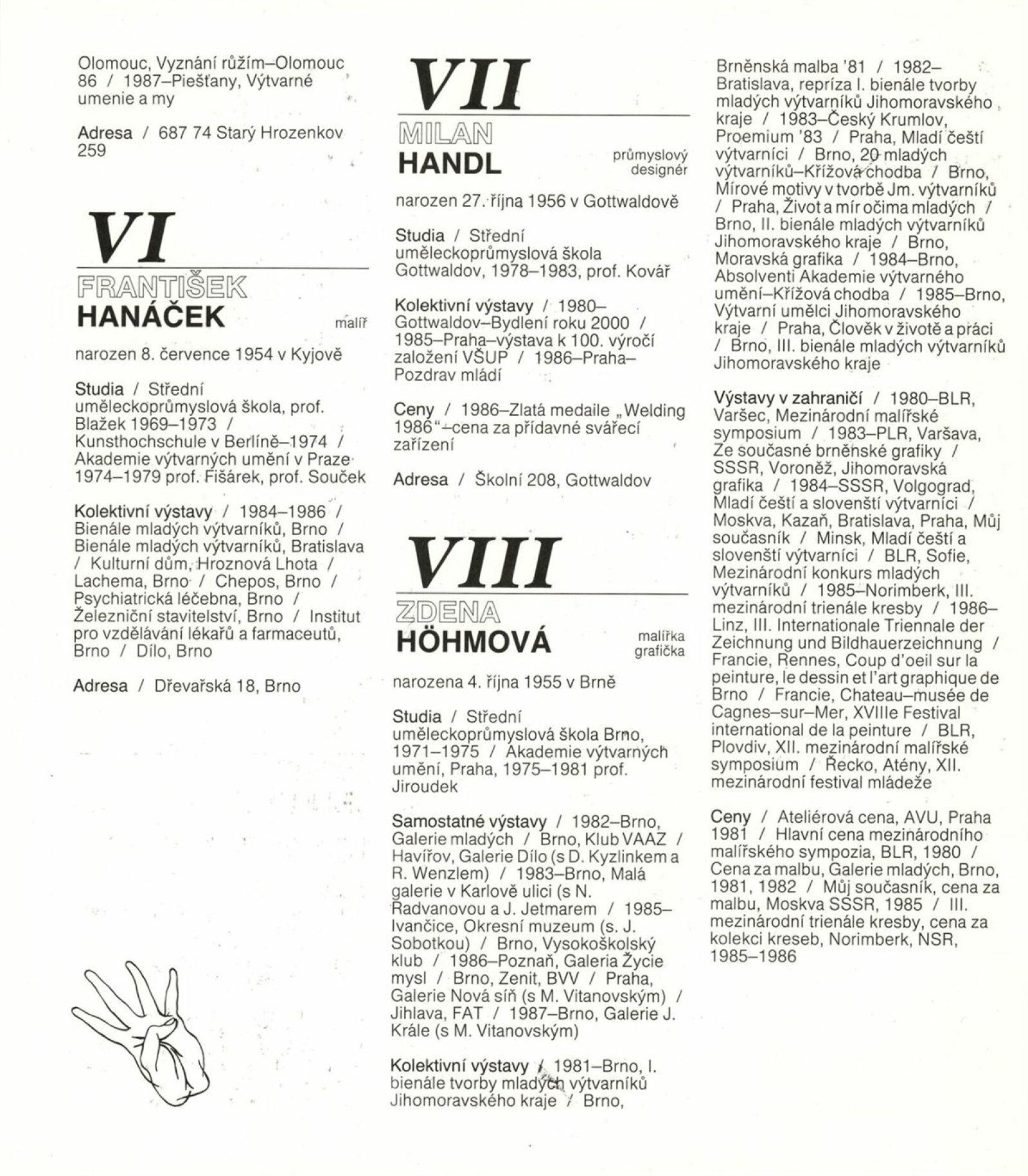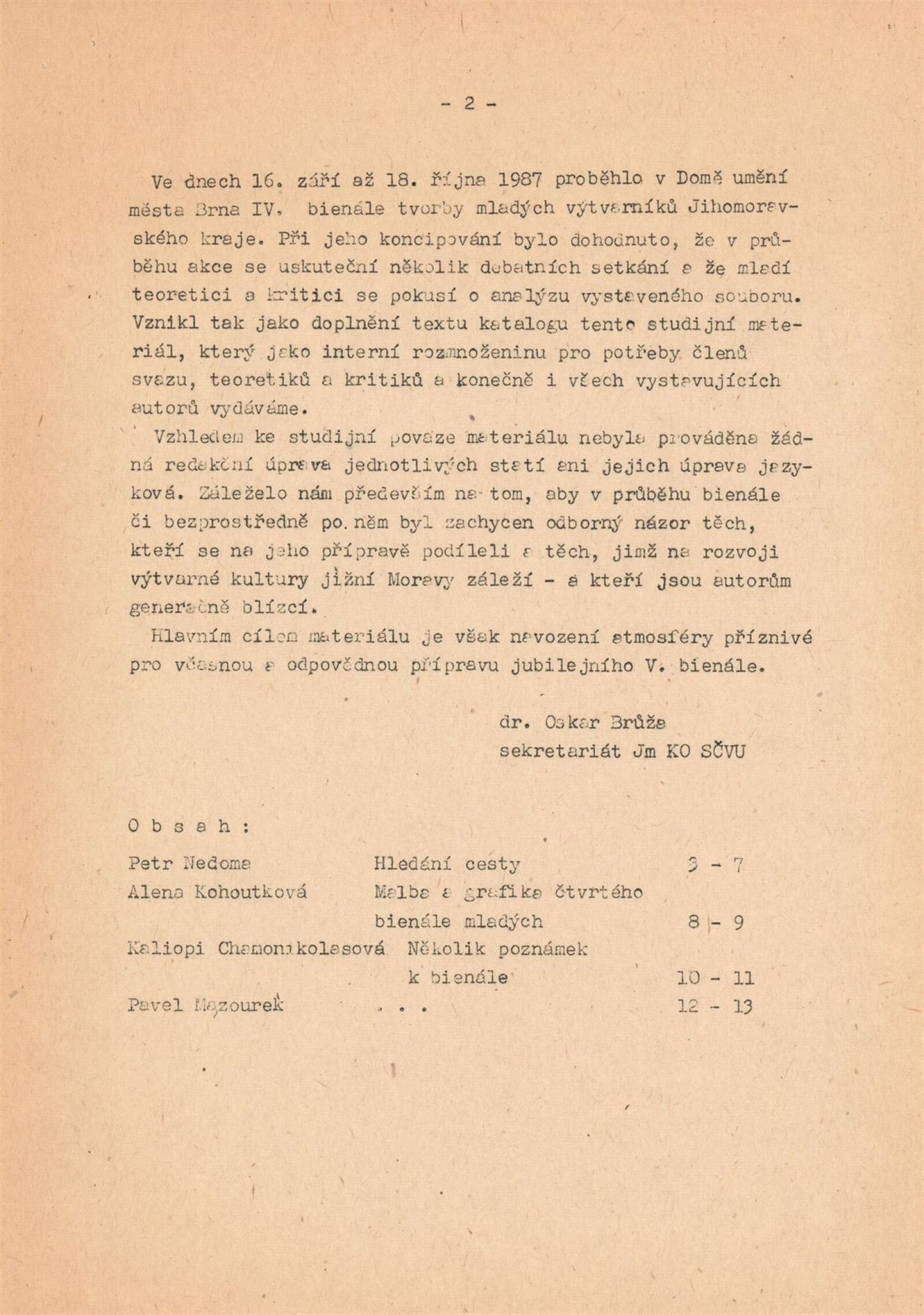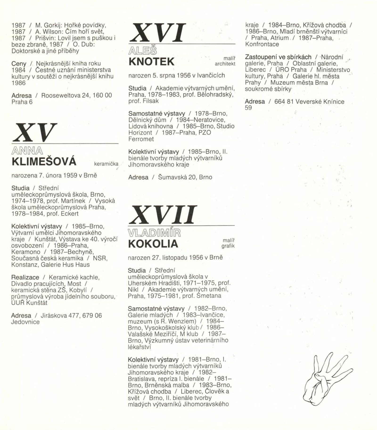 4. bienále tvorby mladých výtvarníků Jihomoravského kraje: Dům umění města Brna, 15. 9. – 18. 10. 1987 / Text: Petr Nedoma. – Brno: SČVU, 1987. – [56] s., obr., životní data vystavujících, DU 838