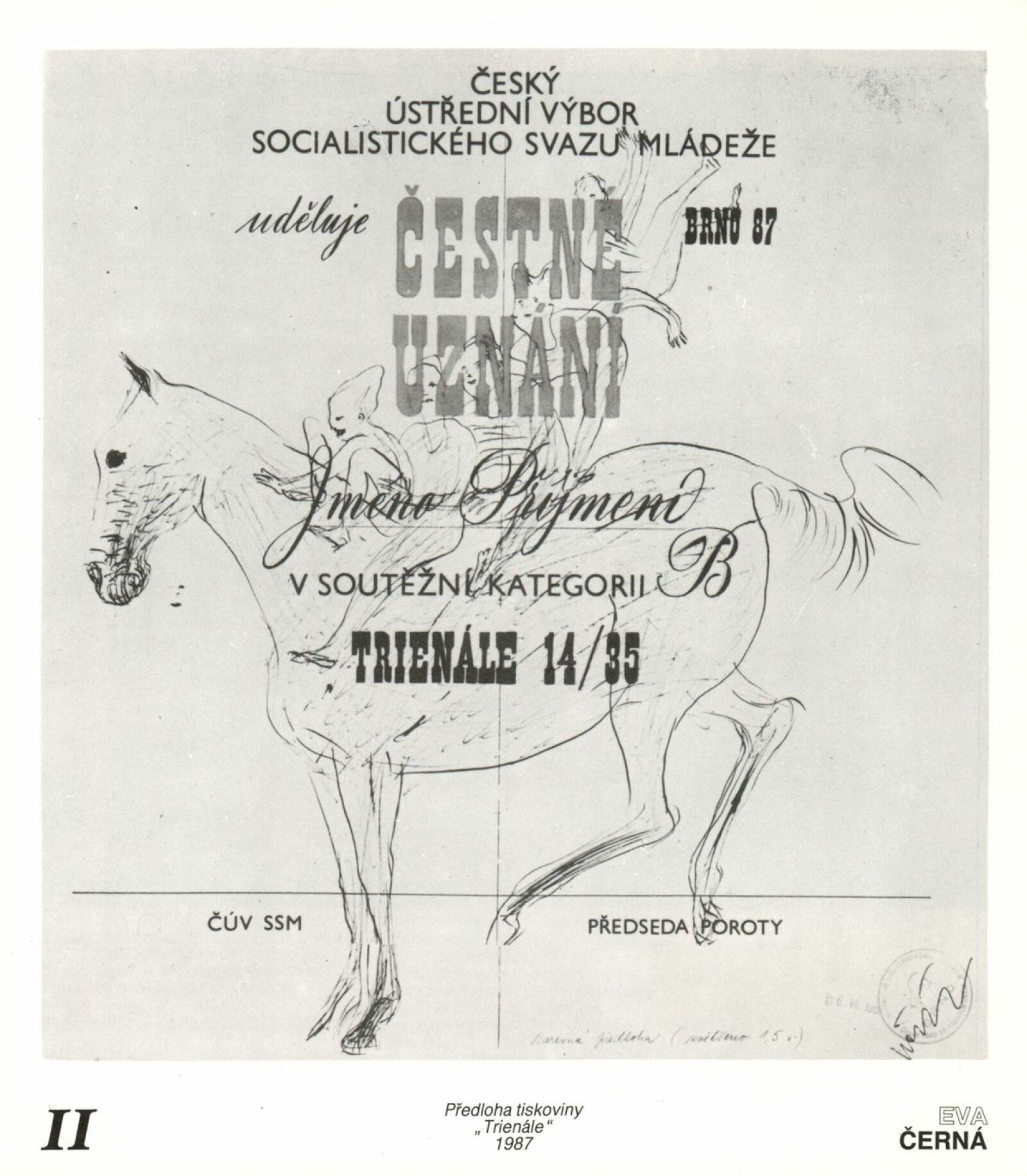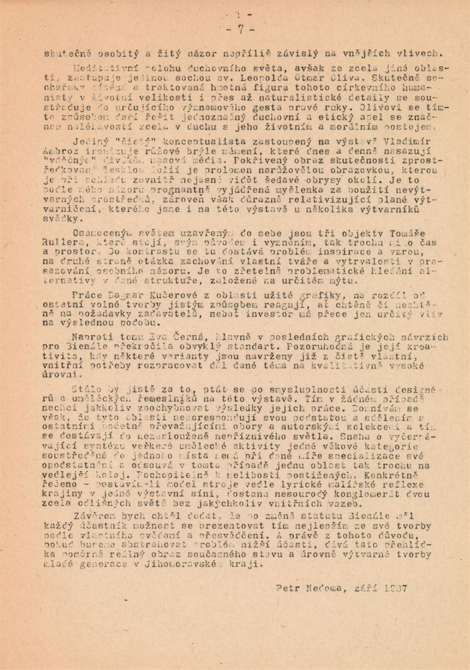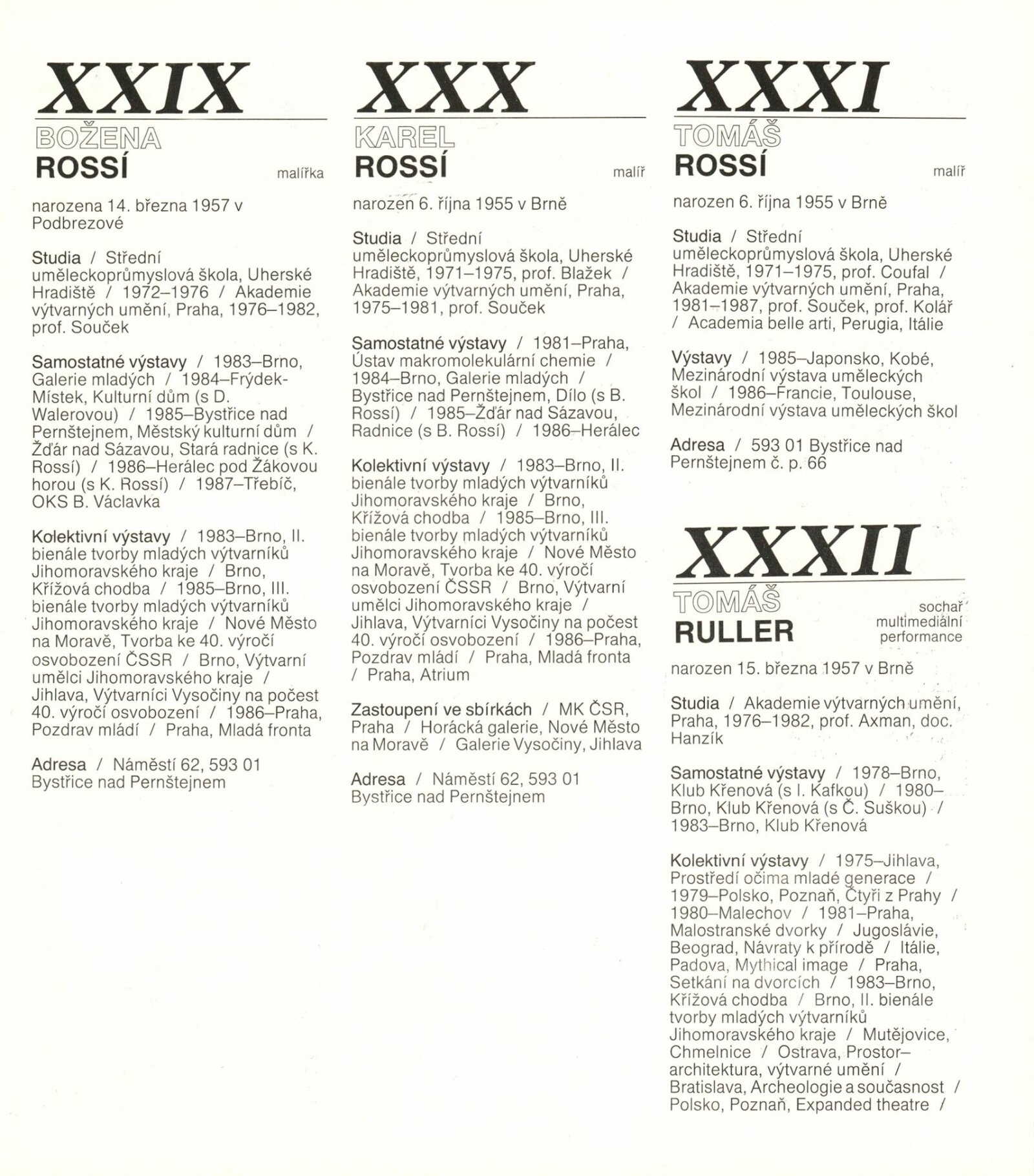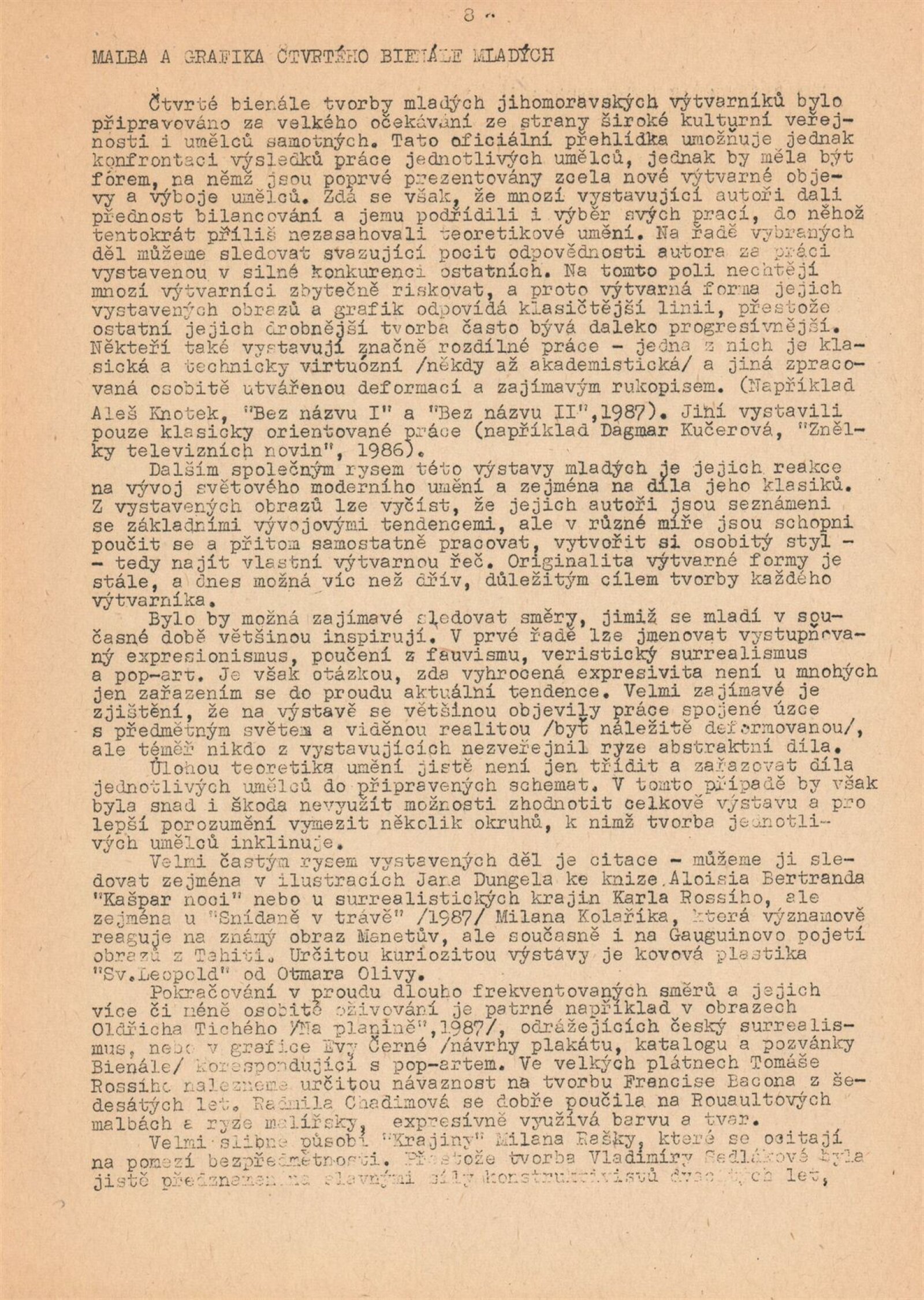 4. bienále tvorby mladých výtvarníků Jihomoravského kraje: Dům umění města Brna, 15. 9. – 18. 10. 1987 / Text: Petr Nedoma. – Brno: SČVU, 1987. – [56] s., obr., životní data vystavujících, DU 838