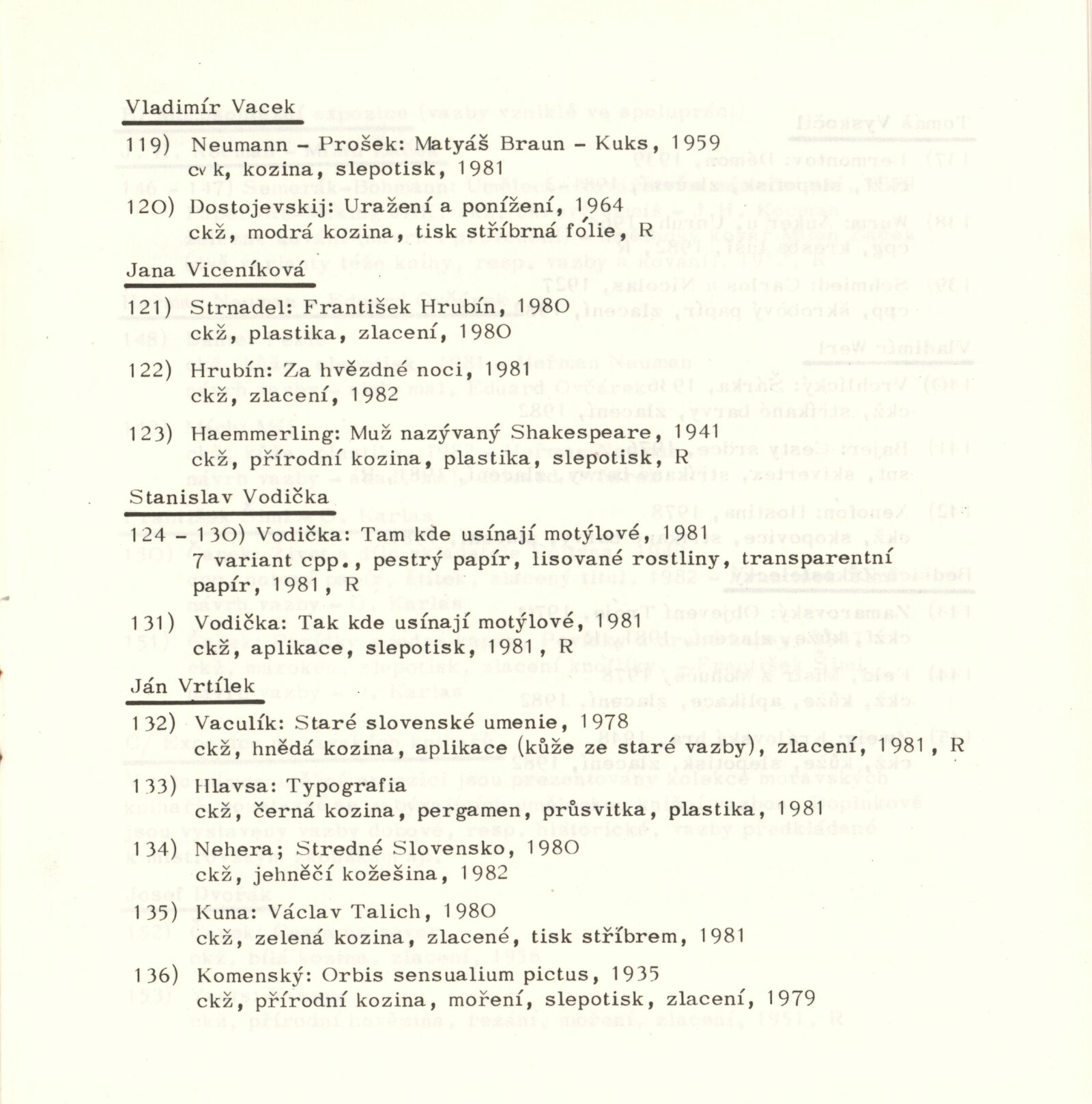 4. trienále umělecké knižní vazby Brno 1982: Dům umění / Dům pánů z Kunštátu, 9. 10. – 31. 10. 1982 / Text: Emil Minář. – Brno: DUmB, 1982. – 22 s., obr., soupis exponátů 31 s., DPK 784. – MZK