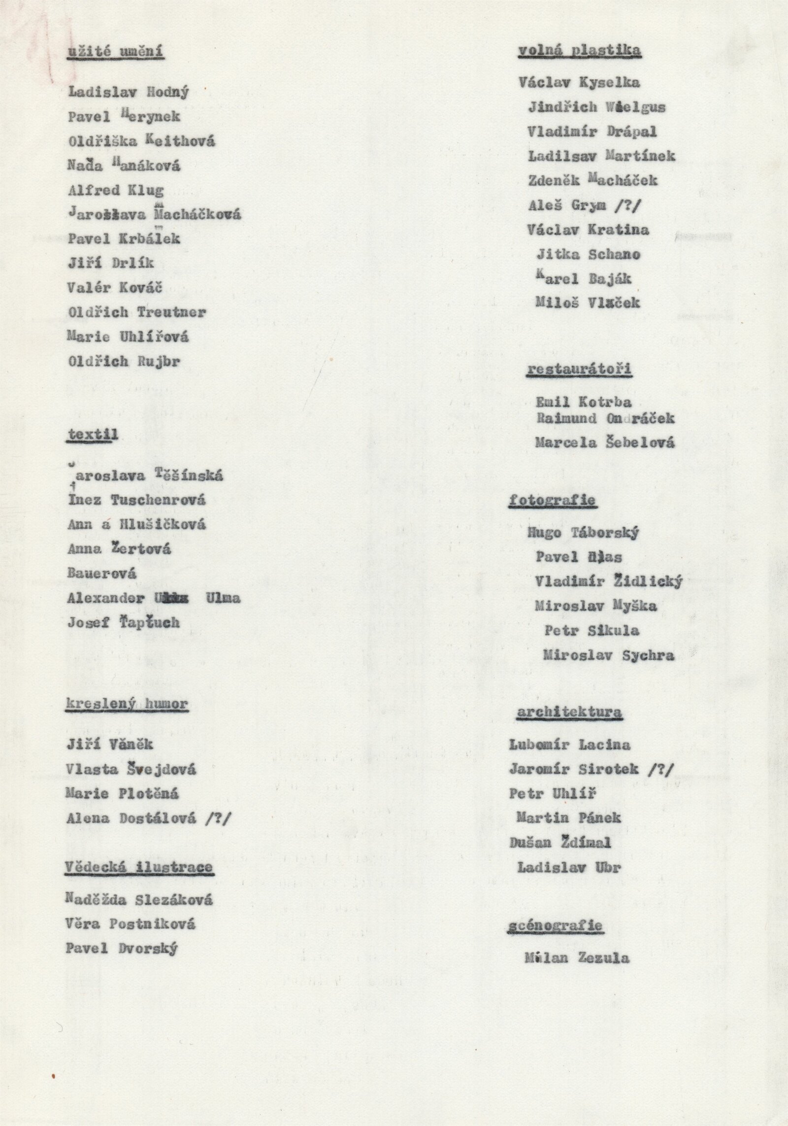 Pavel Adamec, Jiří Auermüller, Karel Baják, Tatjana Bakalová, Vlasta Baránková, Zdeňka Bauerová, Dagmar Berková, František Bič, Václav Bílovský, Jaroslav Bouček, Ladislav Branč, Miroslav Bravenec, Jan Brukner, Naděžda Brzobohatá-Hanáková, Jaroslava Brzobohatá-Macháčková, Jiří Coufal, Oldřich Crhounek, Olga Čechová, Petr Čepický, Eva Černá, Aleš Černý, Pavel Dias, Petr Dillinger, Alena Dostálová, Vladimír Drápal, Olga Drápalová, Jiří Drlík, Pavel Dvorský, Jaroslav Dvořáček, Marie Ehlerová, Jiří Eliška, Antonín Fajtl, Nikolaj Feďkovič, Vlastimil Fiala, Rudolf Filla, Marie Fillippovová, Věra Friedrichová, Josef Fronk, Zdeněk Fuksa, Milan Grygar, Aleš Grym, Michal Hádlík, Naďa Hanáková, Jiljí Hartinger, Jiřina Hartingerová, Karel Haruda, Pavel Herynek, Květoslava Hladká, Robert Hliněnský, Drahomír Hlobil, Jiří Hlušička, Anna Hlušičková, Ladislav Hodný, Zdenka Höhmová, Miroslav Holek, Viktor Holubár, Ivo Houf, Vladimír Hradil, Emanuel Hrbek, Karel Otto Hrubý, Radmila Chadimová, Chalupa, Dana Chatrná, Dalibor Chatrný, Ivan Chatrný, Jaroslav Cheben, František Chrástek, Robert Jakubíček, Marie Jančová, Jan Janíček, Dušan Janoušek, Miloš Jelínek, Jan Jemelka, Karel Jílek, Zdeněk Juna, Arnoštka Juračková, Jaroslav Kačer, Josef Kadula, František Kaláb, Josef Kalivoda, Vítězslava Kaprálová, Arnošt Karásek, Oldřiška Keithová, Alfred Klug, Milan Klvaňa, Jaromíra Knoblochová, Olga Kolovratová, Dagmar Kopecká, Miroslav Korčian, Jozef Kostka, Emil Kotrba, Valér Kováč, Jaroslav Král, Radoslav Kratina, Vlasta Kratinová, Pavel Krbálek, Josef Kremláček, Ivo Krsek, Ester Krumbachová, Jánuš Kubíček, Ladislav Kucharski, Oldřiška Kuchařová, Václav Kyselka, Lubomír Lacina, Aleš Lamr, Karel Langer, Miroslav Láska, Vilma Lesková, Jan Lichtág, Jiří Lindovský, Jiří Liška, Karel Loch, Jiřina Lossmannová, Pavel Luffer, Jaroslav Lukeš, Ladislav Magni, Zdeněk Macháček, Jaroslava Macháčková, František Malý, Dana Marková, František Maršálek, Ladislav Martínek, Karel Masařík, Bohumír Matal, Frant. Merzl, Mikulíková-Slezáková, Alois Mikulka, Hilda Misurová-Diasová, Zdeněk Mlčoch, Eva Mužíková, Václav Myslivec, Boris Mysliveček, Miroslav Myška, Jan Maria Najmr, František Navrátil, Pavel Navrátil, Petr Navrátil, Miroslav Netík, Josef Novák, Alois Nožička, Antonín Odehnal, Reimund Ondráček, Jarmila Opletalová, Martin Pánek, Radan Pantůček, Karel Pekárek, Milan Peloušek, Bedřich Petrovan, Marie Plotěná, Marie Postniková, Věra Postniková, Jan Rajlich ml., Jan Rajlich st., Emanuel Ranný ml., Emanuel Ranný st., Michal Ranný, Pavel Richtr, Jan Rodinger, Olga Rosenbaumová, Zdeněk Rosmann, Vladimír Rosol, Theodor Rotrekl, Pavel Rudolf, Oldřich Rujbr, Zdeněk Řehořík, Jaroslav Sedlář, Václav Sedlařík, Jitka Schano, Libuše Schwormová, Petr Sikula, Zbyšek Sion, Jaromír Sirotek, Petr Skácel, Mirka Slámová, Miloš Slezák, Naděžda Slezáková, Karel Smetana, Vladimír Smrčka, Jiří Sobotka, Jan Spáčil, Oldřich Staněk, František Süsser, Jindřich Svoboda, Metoděj Sychra, Miroslav Sychra, Josef A. Šálek, Jan Šebela, Marcela Šebelová, František Šenk, Miroslav Šimorda, Jiří Šindler, Jaroslav Škarohlíd, Danuše Štefková, Ivan Štrouf, Vlasta Švejdová, Hugo Táborský, Vladimír Tesárek, Jaroslava Těšínská, Jiřina Tobolíková-Hartingerová, Antonín Tomalík, Oldřich Toman, Vlastimil Toman, Jarmila Totušková, Oldřich Treutner, Matěj Trojan, Vladimír Tůma, Ctibor Turba, Inéz Tuschnerová, Josef Ťapťuch, Ladislav Ubr, Petr Uhlíř, Marie Uhlířová, Jaroslav Úlehla, Alexander Ulma, Alice Ulmová, Elvír Urban, Růžena Urbanová, Jiří Vaněk, Bohumil Vašák, Radomír Vavruša, Mirko Večeřa, Luděk Vejman, Petr Veselý, Jiří Vláčil, Miloš Vlček, Ludvík Voneš, František Vrána, František Vystrčil, Jindřich Wielgus, Marie Zeithammerová, Karel Zeman, Otakar Zemina, Milan Zezula, Karel Zouhar, Svatopluk Žampa, Dušan Ždímal, Anna Žertová, Vladimír Židlický
