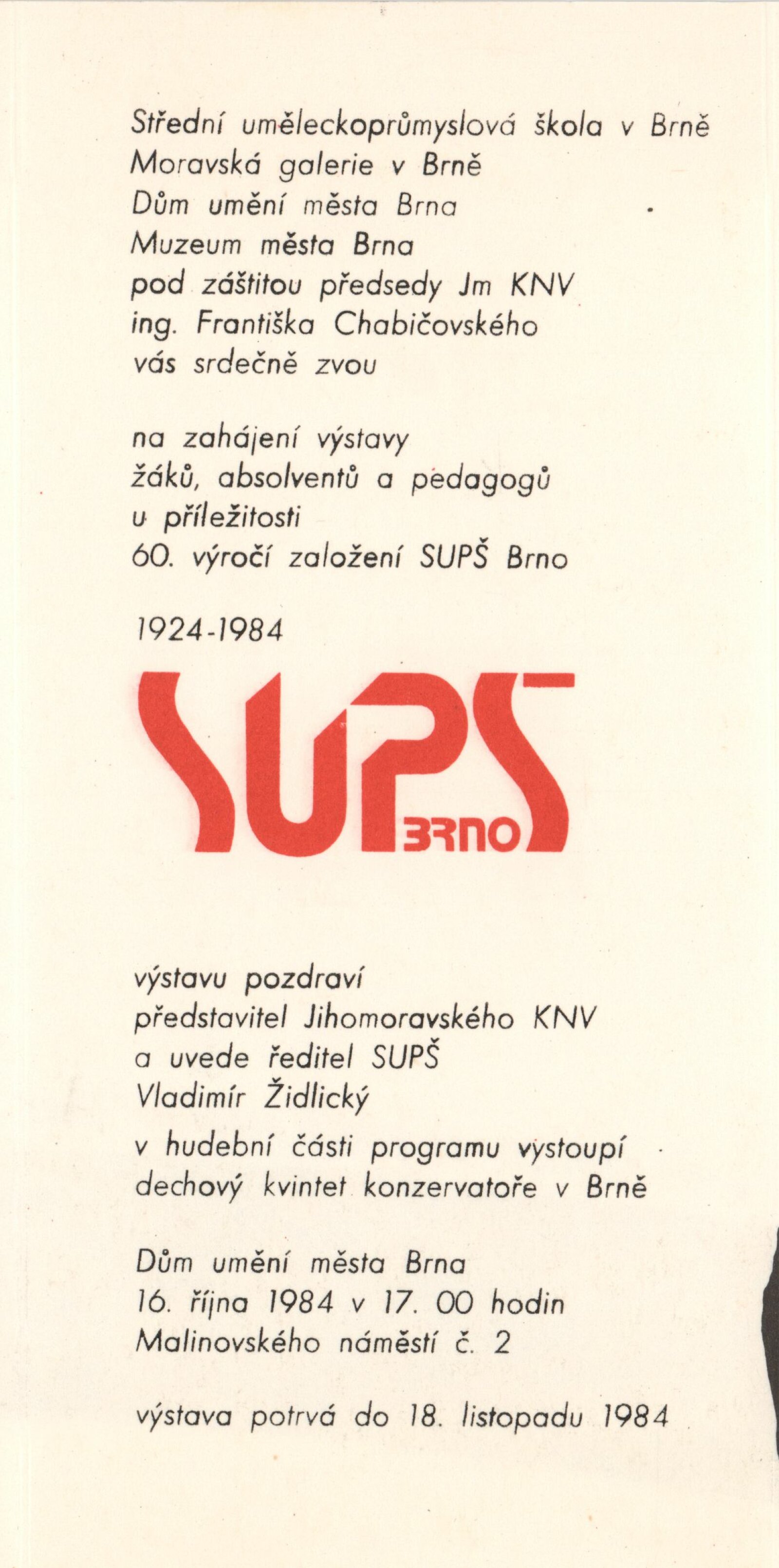 K šedesátiletému výročí založení brněnské ŠUŘky (dnešní Střední školy umění a designu) byla v roce 1984 uspořádána souborná výstava v Domě umění, v rámci které byla kromě tvorby tehdejších studentů všech uměleckých a užitých oborů představena také díla absolventů a významných pedagogů školy. Na přípravě výstavy spolupracovali zástupci ŠUŘky, Domu umění a Moravské galerie, díla však byla zapůjčena i ze sbírek Muzea města Brna, pražského Uměleckoprůmyslového muzea a Oblastní galerie ve Zlíně. Výstava trvající od 16. října do 18. listopadu byla instalačně rozdělená na dvě části, retrospektivně pojaté přízemí Domu umění seznamovalo diváky s tvorbou absolventů a pedagogů působících na škole od jejího založení. Zde byla uvedena například i díla předválečných odborných učitelů Petra Dillingera, Emanuela Hrbka nebo Františka Süssera. V druhé části expozice, v prvním patře Domu umění, byla kromě úvodní části věnované výuce základů kresby, malby a modelování vystavena tvorba žáků sedmi tehdy vyučovaných oborů (Propagační grafika; Aranžérství a výstavnictví; Užitá malba v architektuře, propagaci a scénografii; Užitá fotografie v propagaci, kultuře, vědě a technice; Tvarování hraček a dekorativních předmětů; Tvarování výrobků z plastických hmot; Tvorba nábytku a interiéru). Dle archivních materiálů je evidentní, že se v přípravné fázi počítalo s vystavením filmových děl a příkladů restaurátorské praxe absolventů školy, avšak kvůli nedostatku místa a komplikacím spojeným s instalací bylo od tohoto záměru upuštěno. Stejně tak nebyli představeni absolventi, které škola připravila na další působení ať už na poli dějin umění, tak v oblasti dramatického nebo hudebního umění.