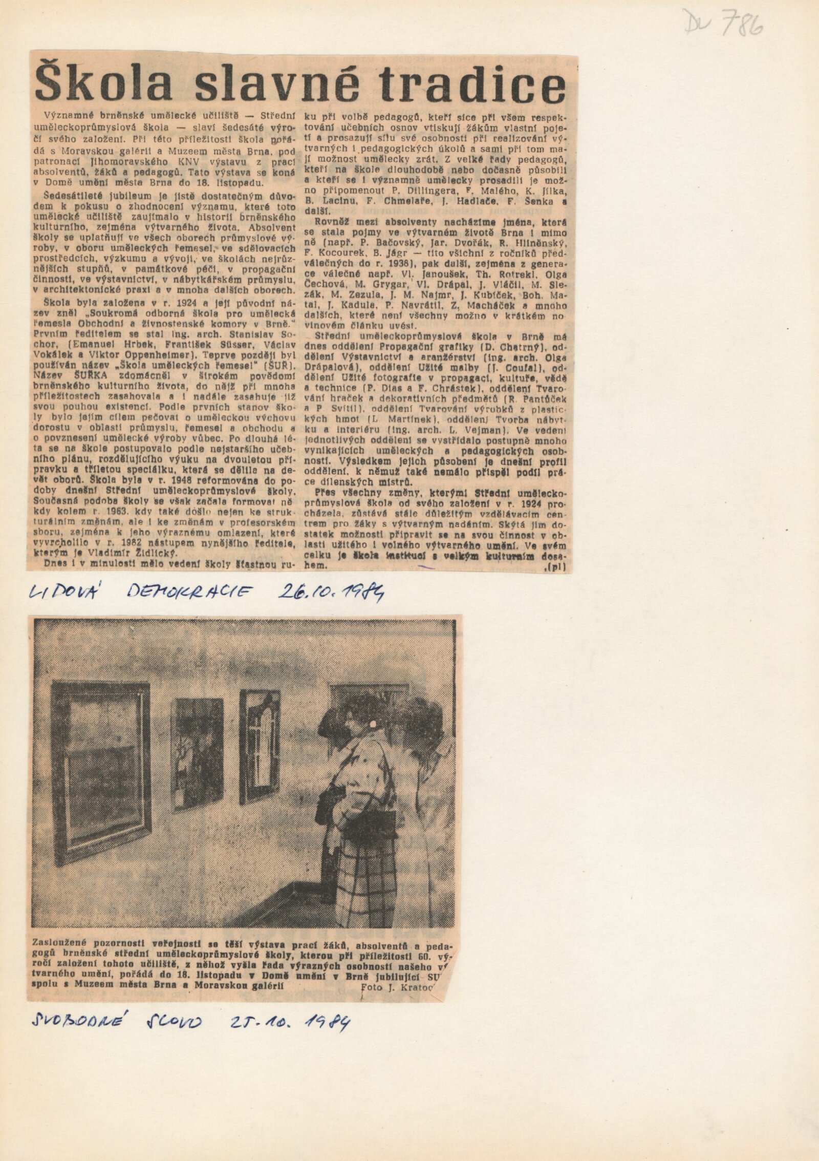 Výstava 60 let Střední uměleckoprůmyslové školy v Brně, kolektivu 50. výročí vzniku KSČ, 1924–1984: Dům umění města Brna, 1. patro, 16. 10. – 18. 11. 1984 / Texty: Vladimír Židlický, Alena Konečná. – Brno: Moravská galerie, – 55 s., obr., DU 786. – MZK; MG