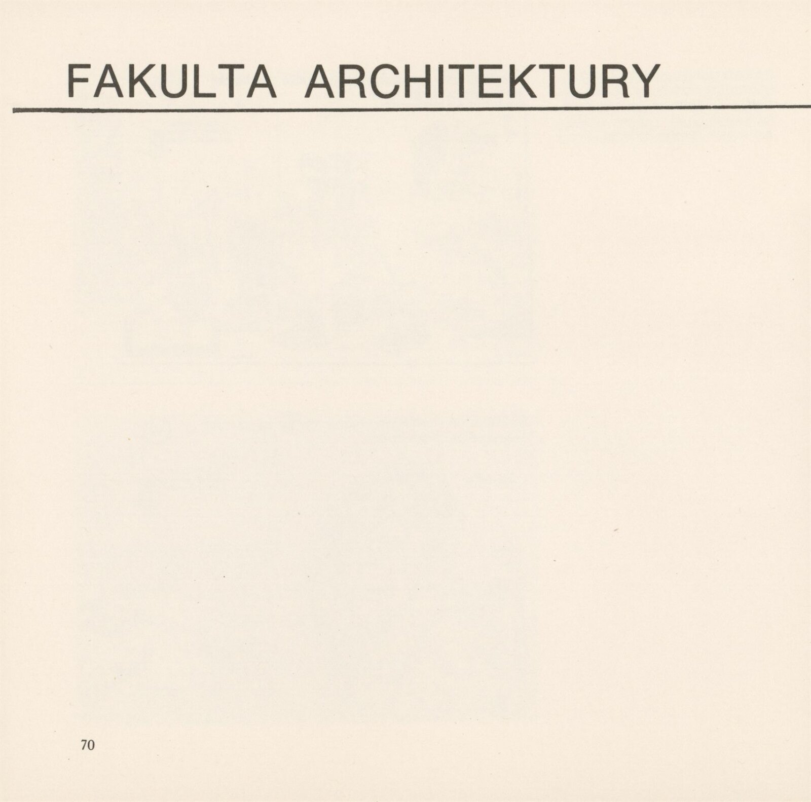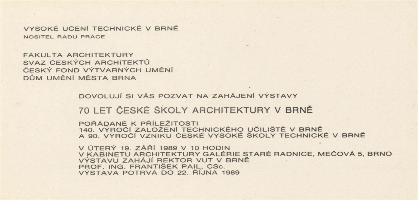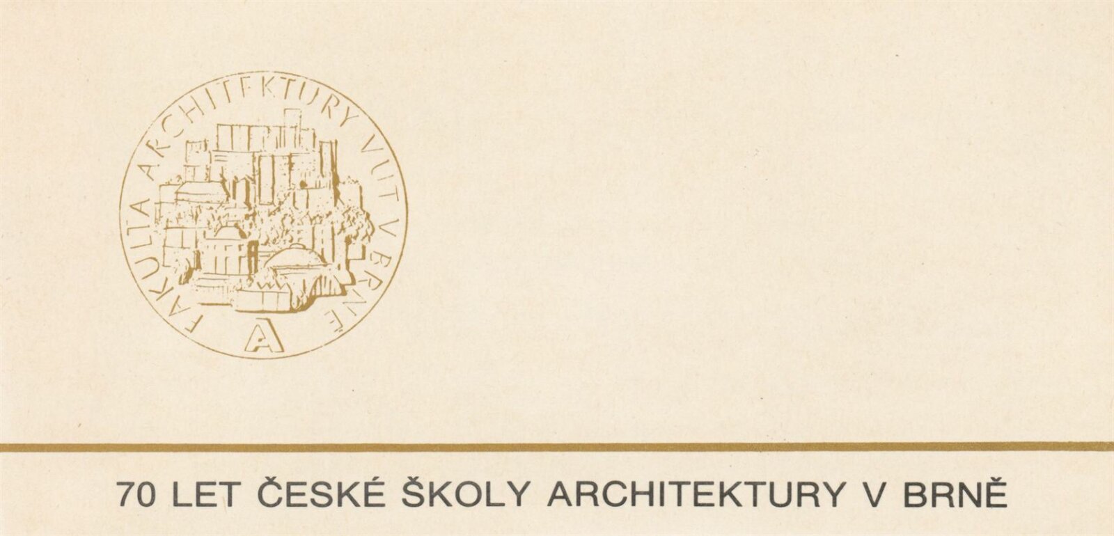 70 let české školy architektury v Brně. Vysoké učení technické v Brně. Fakulta architektury: Galerie Stará radnice, 2 a 3. patro, 19. 9. – 22. 10. 1989 / Texty: anonymní. – Brno: fakulta architektury VUT, 1989. – 84 s., obr., GSR 55