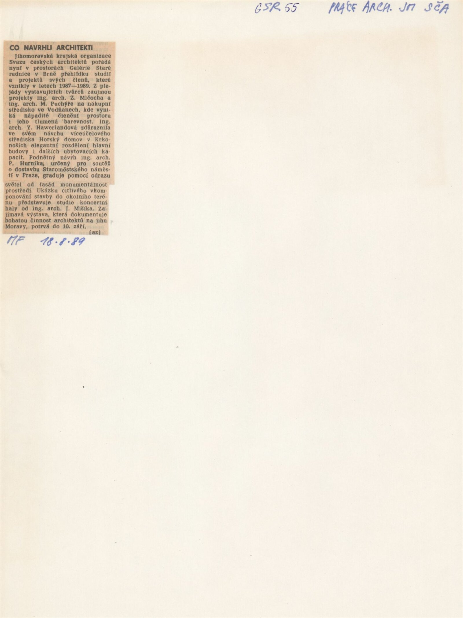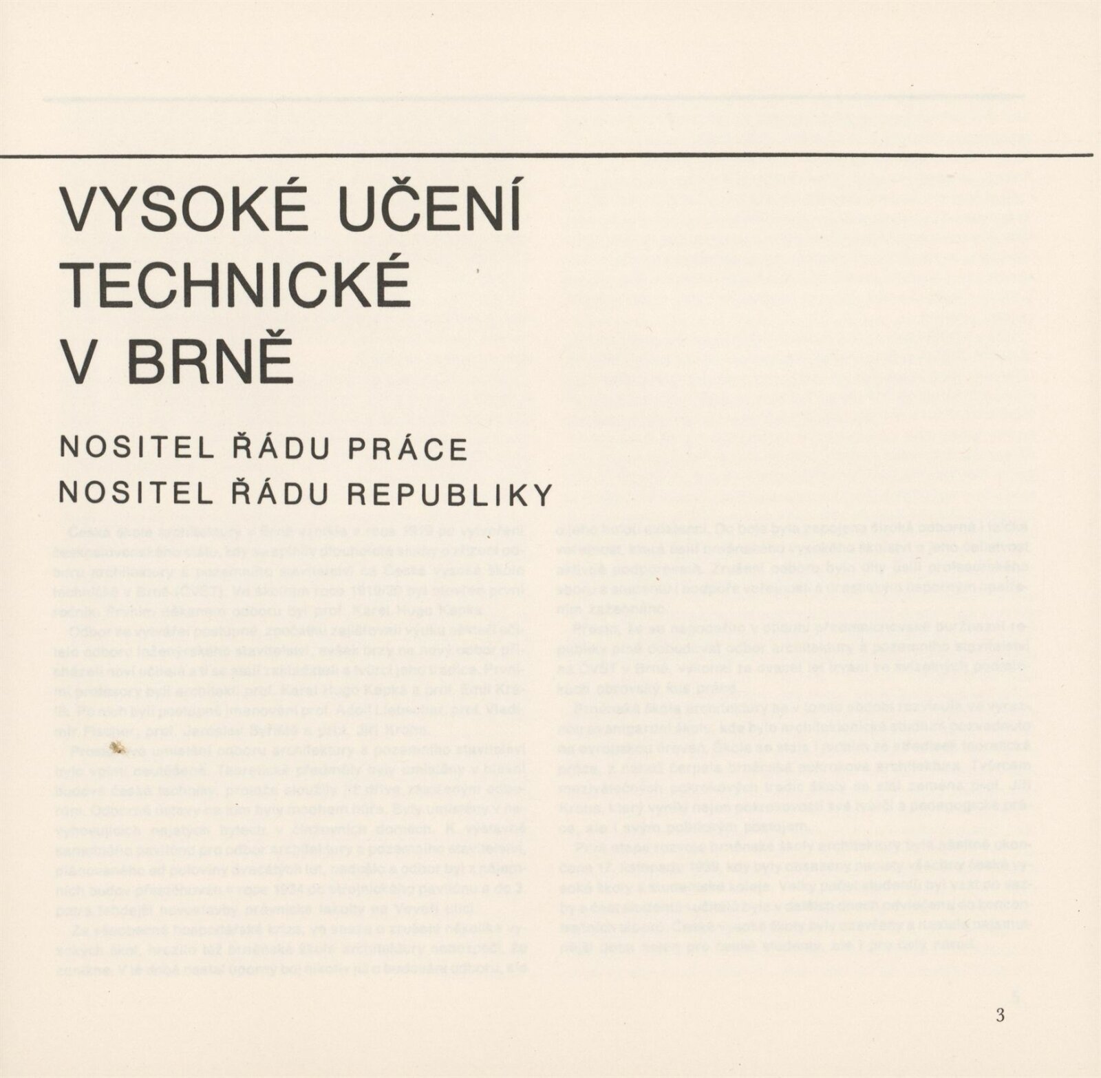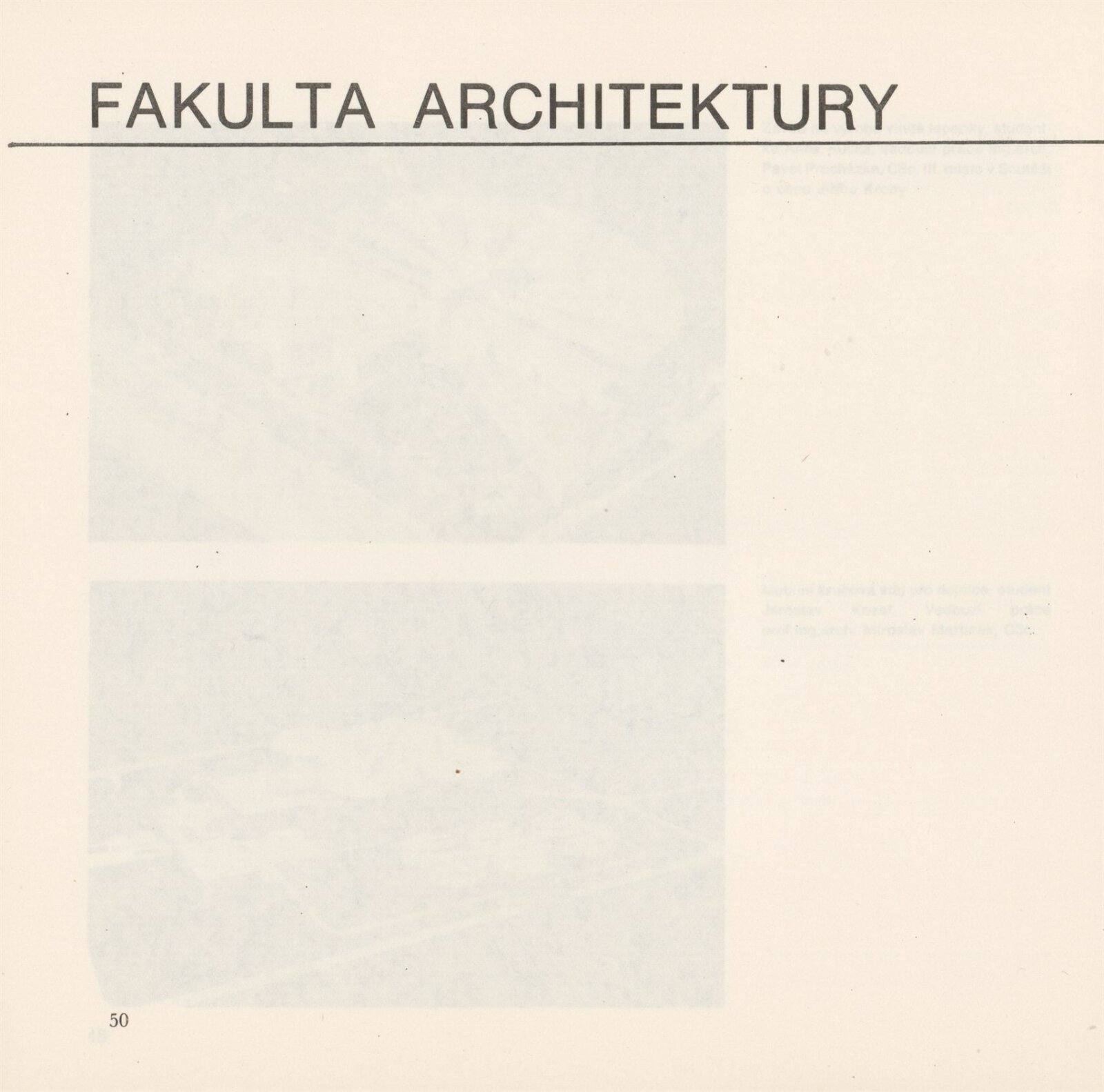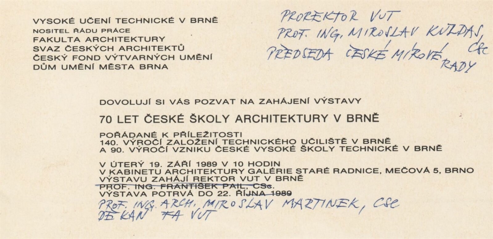 70 let české školy architektury v Brně. Vysoké učení technické v Brně. Fakulta architektury: Galerie Stará radnice, 2 a 3. patro, 19. 9. – 22. 10. 1989 / Texty: anonymní. – Brno: fakulta architektury VUT, 1989. – 84 s., obr., GSR 55