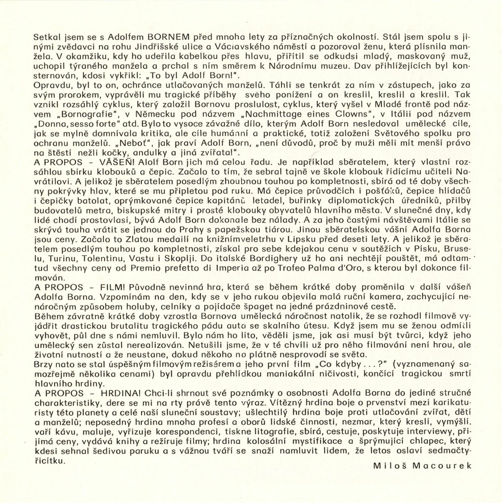 Adolf Born. Grafika a kresby: Dům umění / Dům pánů z Kunštátu, Kabinet grafiky, 21. 1. – 27. 2. 1977 / Text: Miloš Macourek. – Brno: DUmB, 1972. – 18 s., obr., životní data, výstavy, ceny, DPK 641. – MZK; MMB
