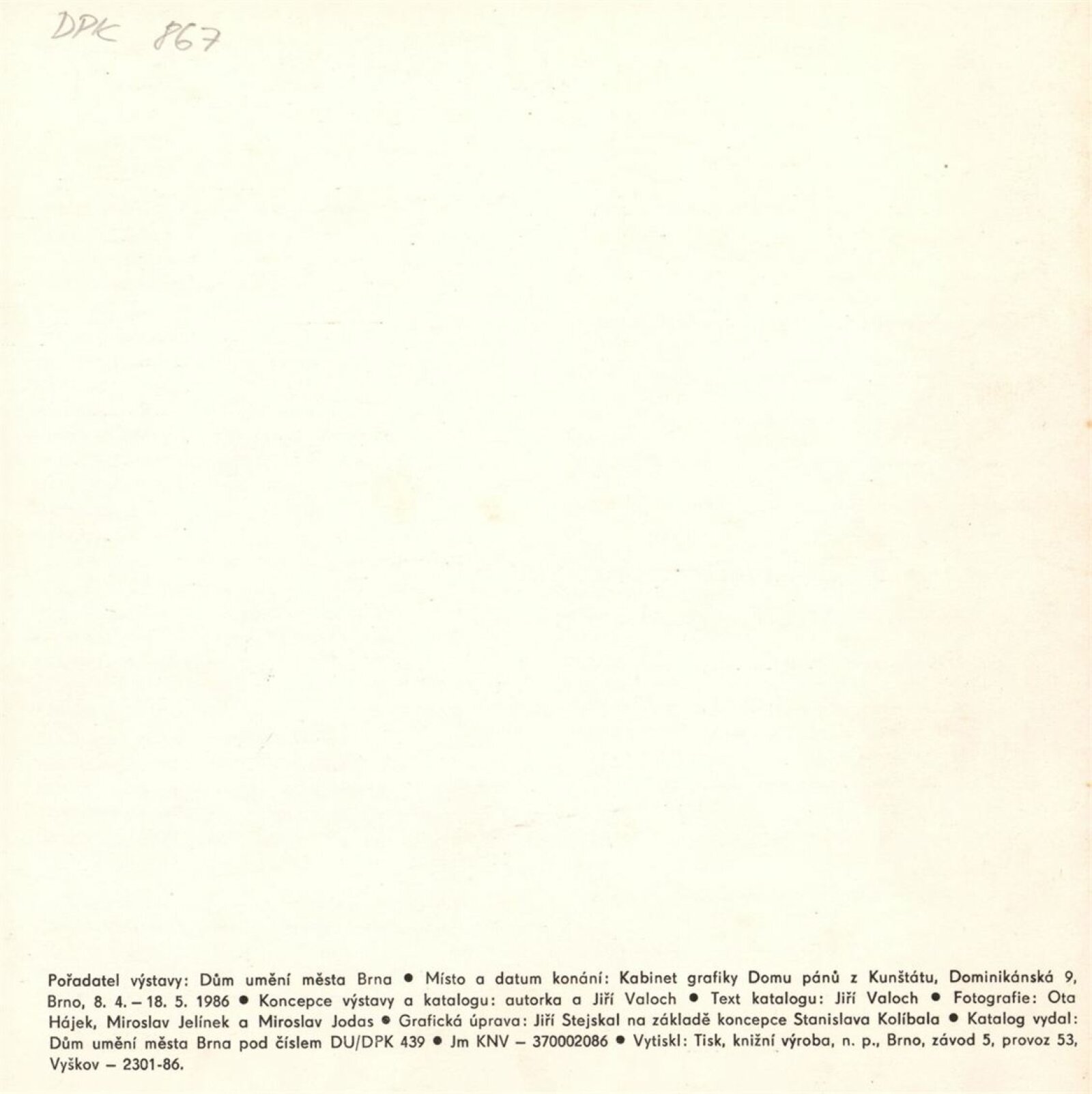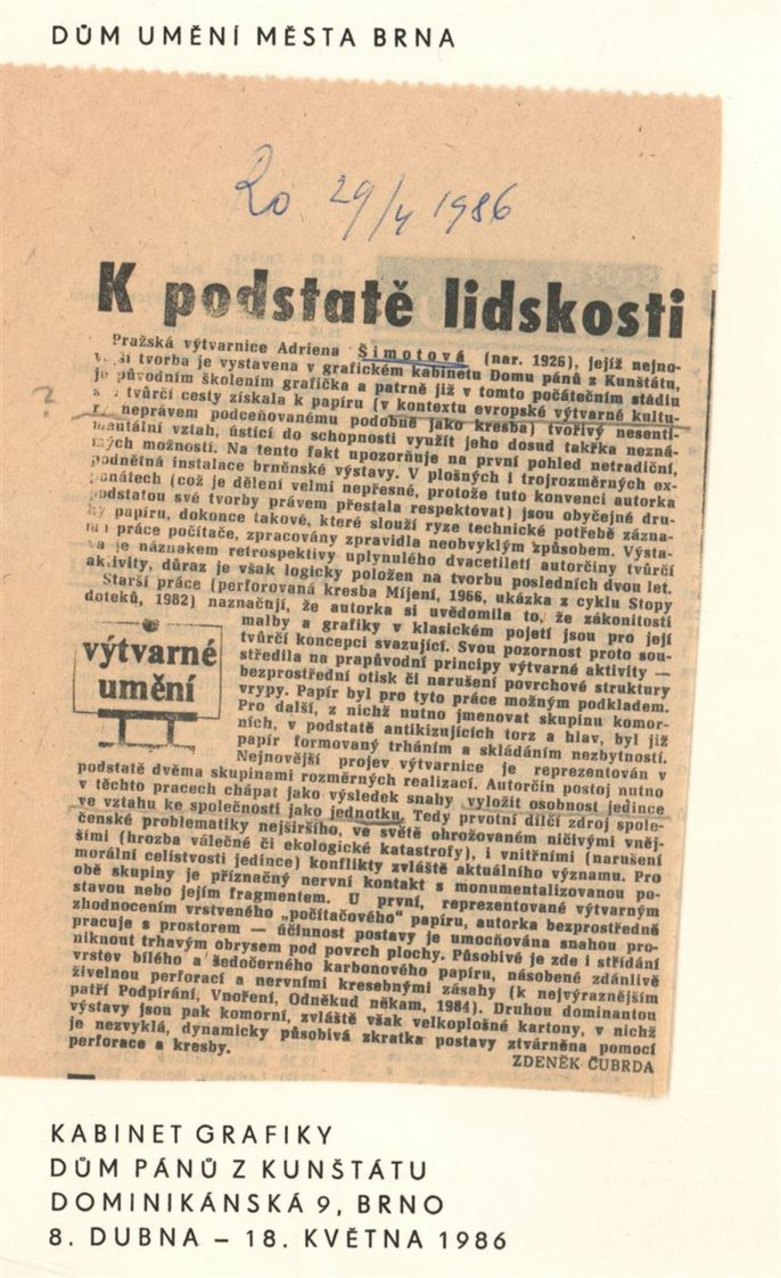 Adriena Šimotová. Práce na papíře: Dům umění / Dům pánů z Kunštátu, Kabinet grafiky, 8. 4. – 18. 5. 1986 / Text: Jiří Valoch. – Brno: DUmB, 1986. – [28] s., obr., životní data, výstavy, ceny, zastoupení ve sbírkách, DPK 867. – MZK; MG; MMB