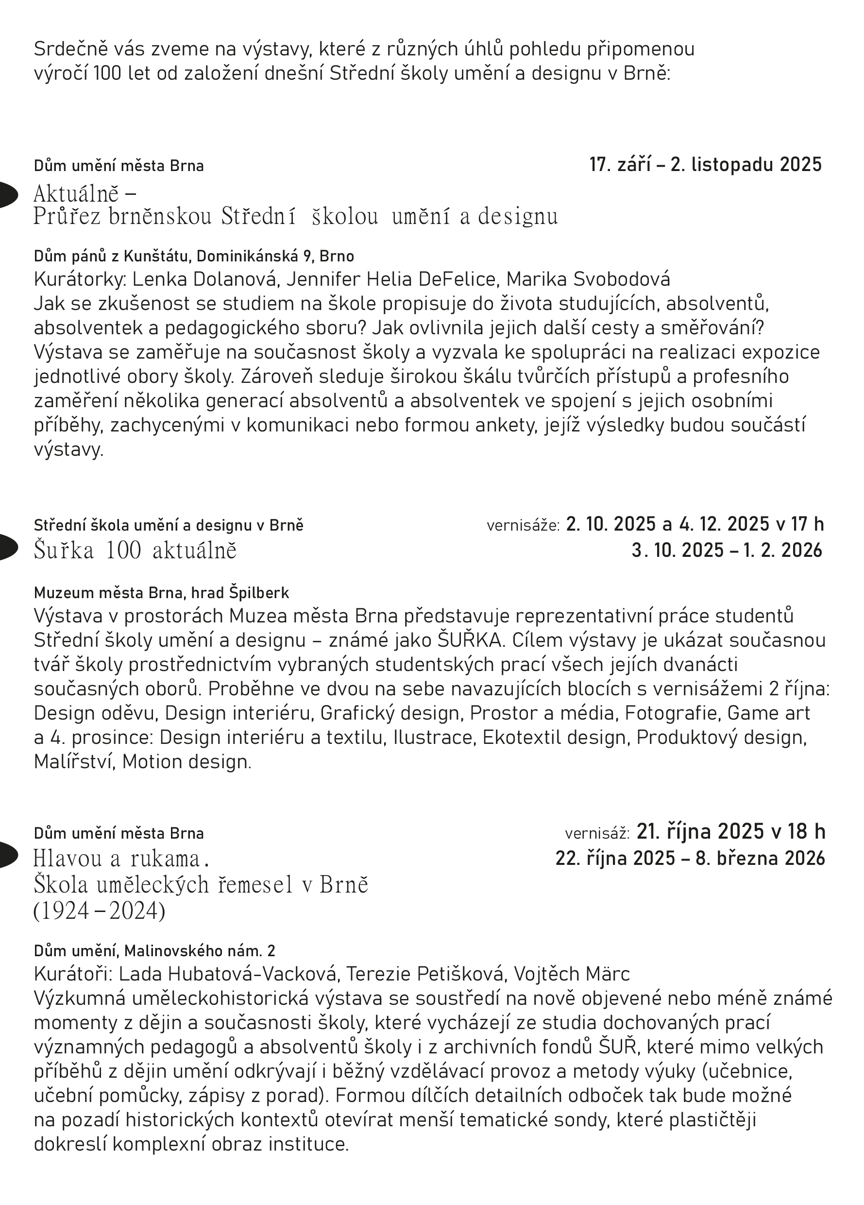 Naším cílem je představit široké spektrum tvůrčích přístupů a ukázat, jak různorodě může škola formovat uměleckou tvorbu i životní směřování každého jednotlivce. Na přípravě výstavy se podílejí ateliéry Prostor a média, Produktový design, Design interiéru, Fotografie, Game art a Eko textil design. Grafické řešení zpracovávají studentky Laura Bínová (Grafický design) a Anna Hainová (Motion design). Průběh instalace dokumentuje Marián Faltičko z ateliéru Fotografie. Projekt zaměřený na mimoškolní aktivity připravuje Julie Novotná z Eko textil designu. Videoportrét o škole tvoří absolventka Běla Beránková, zatímco návrh výstavní architektury má na starosti Monika Přikrylová, rovněž absolventka školy.