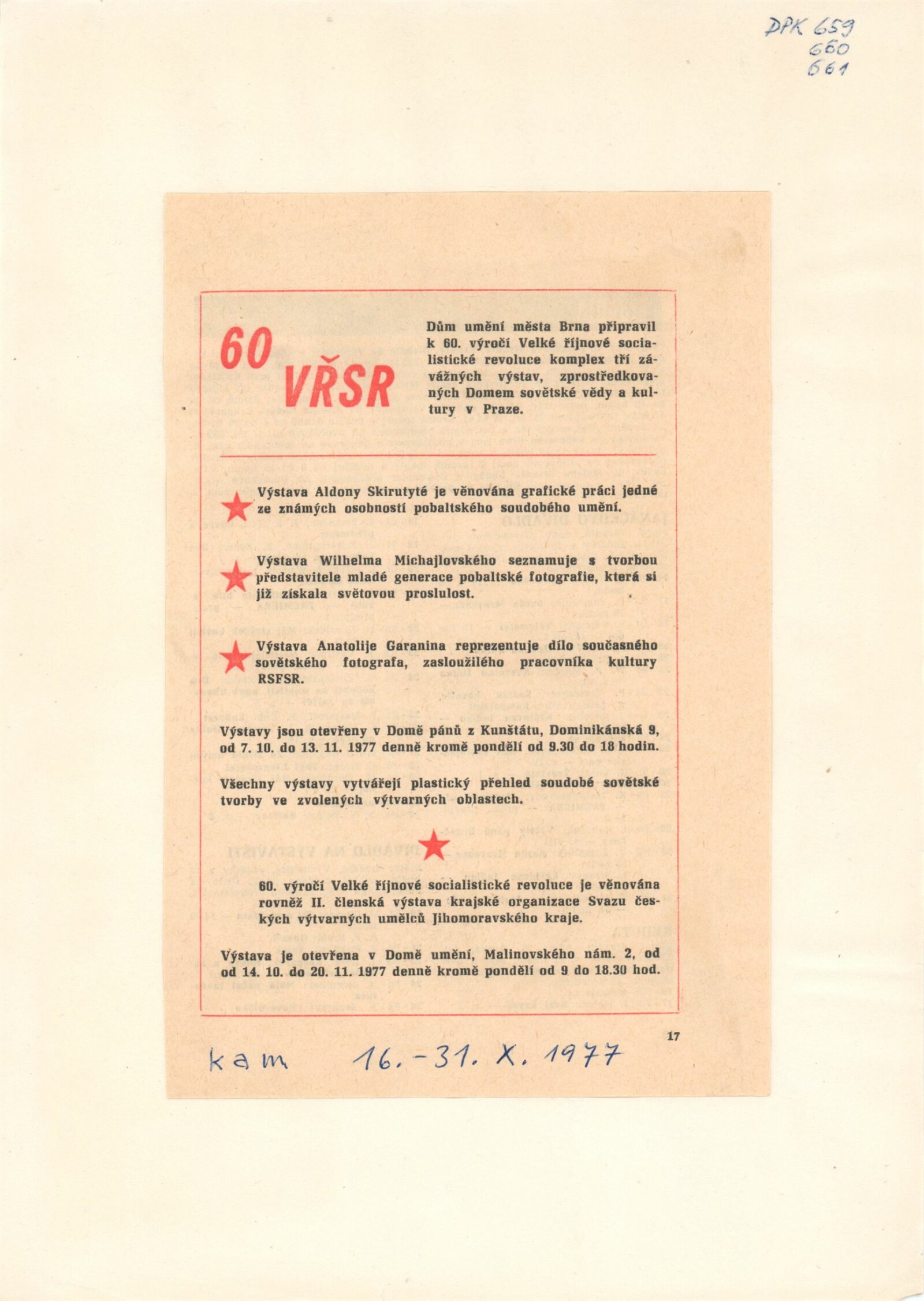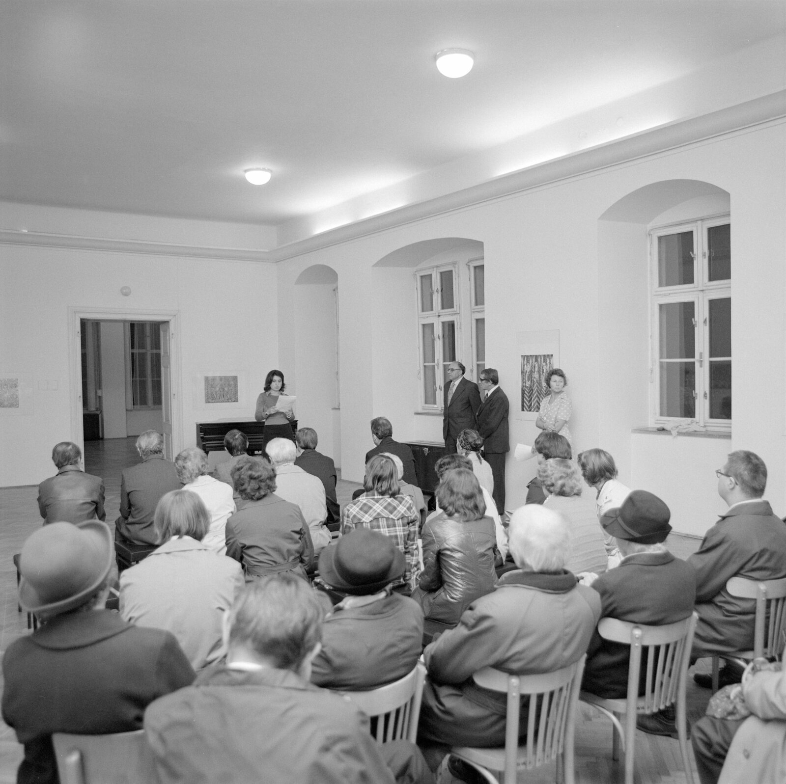 pozvánky, katalogy, fotografie z vernisáže, strojopis úvodního slova, seznam děl, prezenční listina, strojopis textu pro katalog, ručně psané poznámky, provozní korespondence, dopis (13. 7. 1977, ředitel DU), recenze v tisku, pohledy