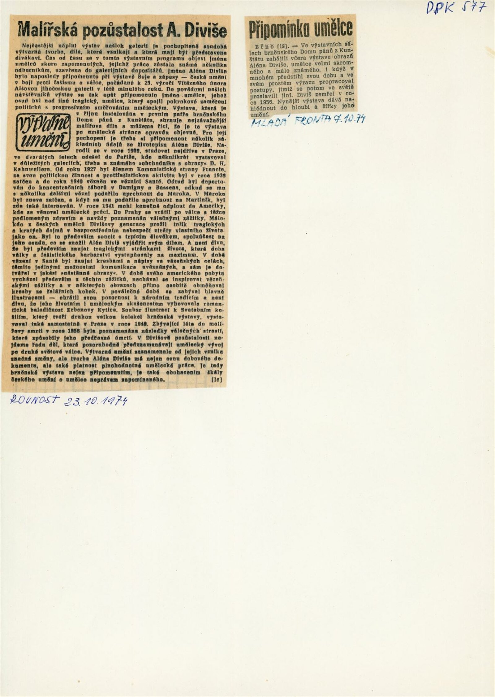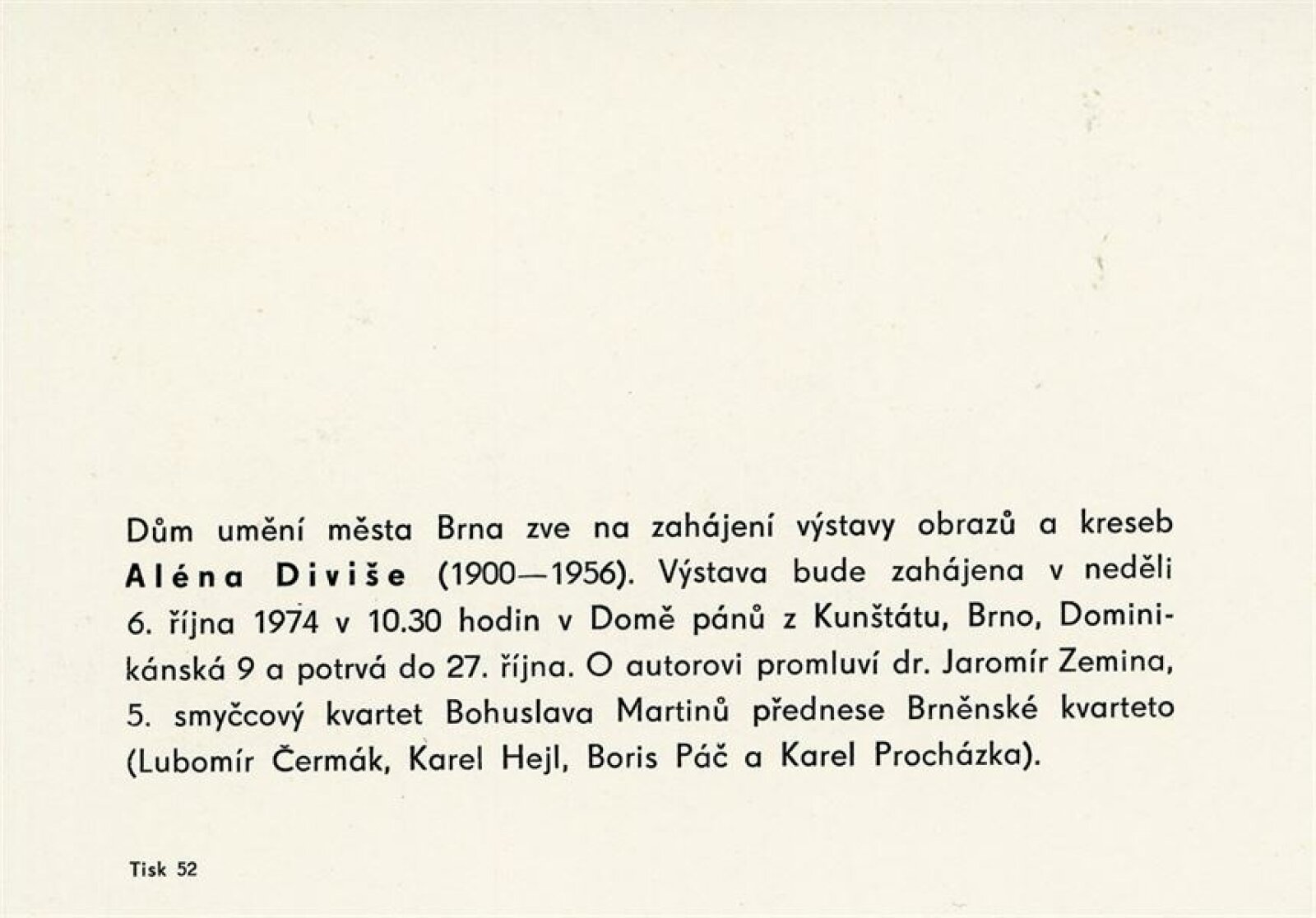 Alén Diviš: Dům umění / Dům pánů z Kunštátu, 6. 10. – 27. 10. 1974 / Text: Jaromír Zemina. – Brno: Jan Svoboda, 1974. – 32 s., 4 l. obr. příl. / Alén Diviš / Texty: Jaromír Zemina, Bohuslav Martinů. – 4 s., obr., životopis, DPK 577. – UPM