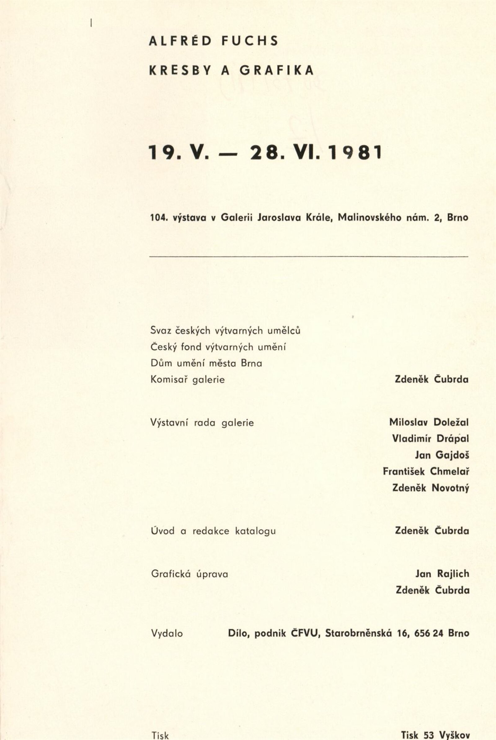Alfréd Fuchs. Kresby a grafika: Dům umění, 104. výstava v Galerii Jaroslava Krále, 19. 5. – 28. 6. 1981 / Text: Zdeněk Čubrda. – Brno: ČFVU, 1981. – 10 s., obr., portrét, životní data, ceny, DU 731. – MZK; MG