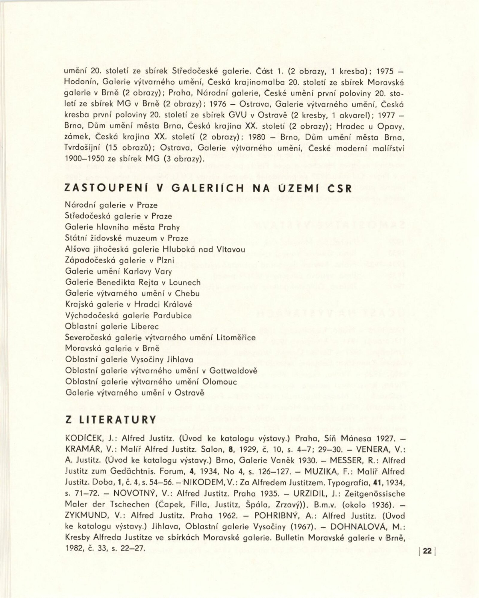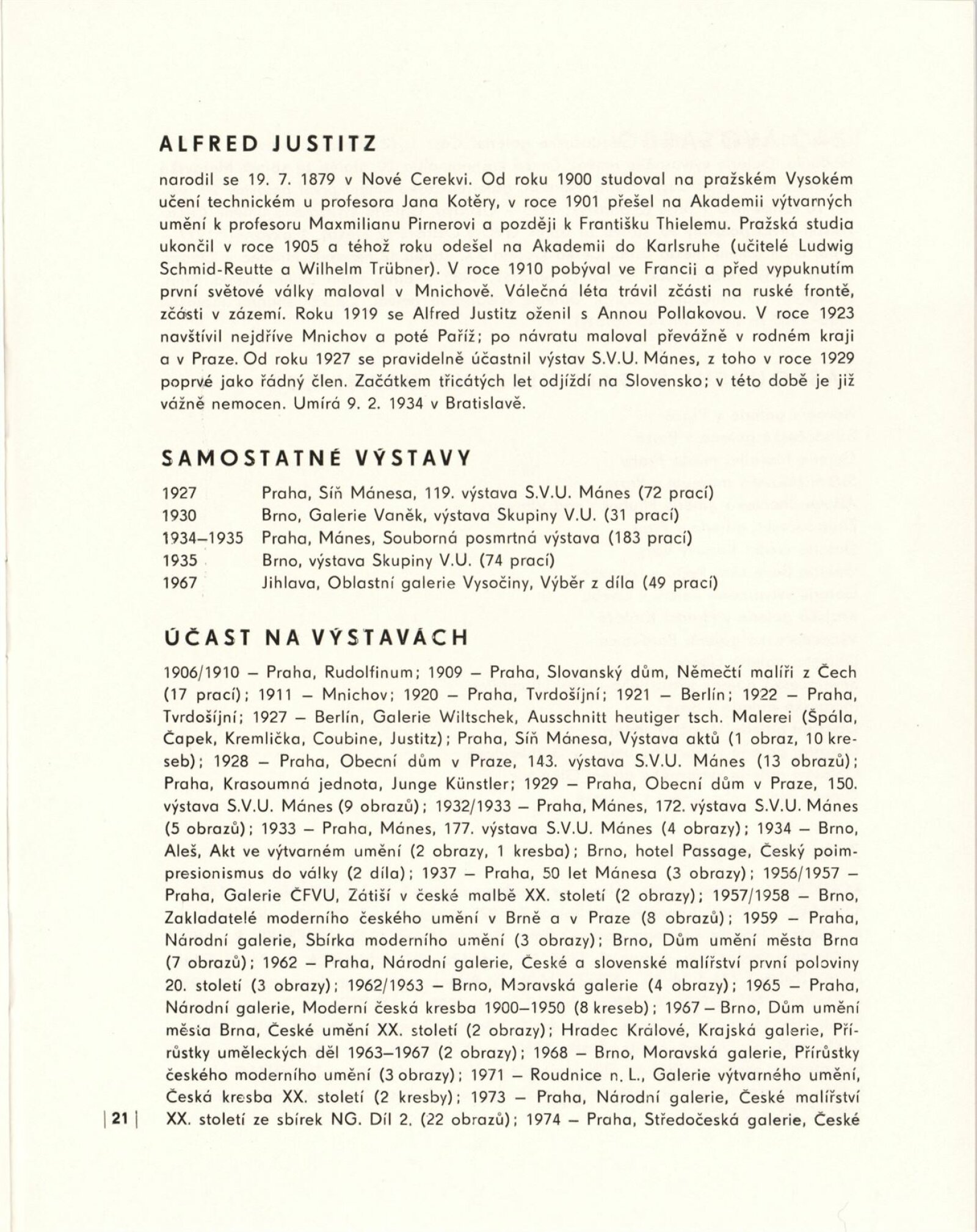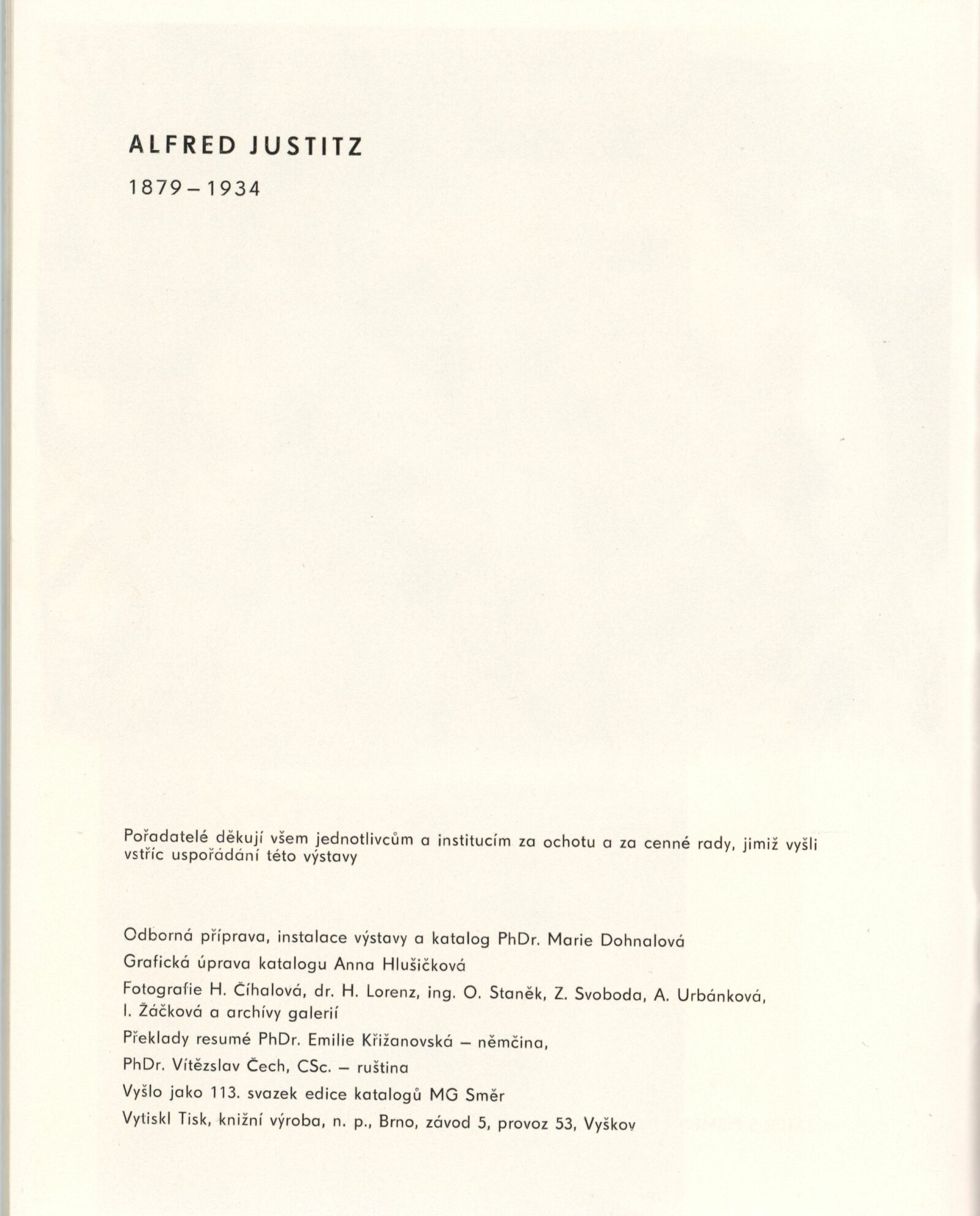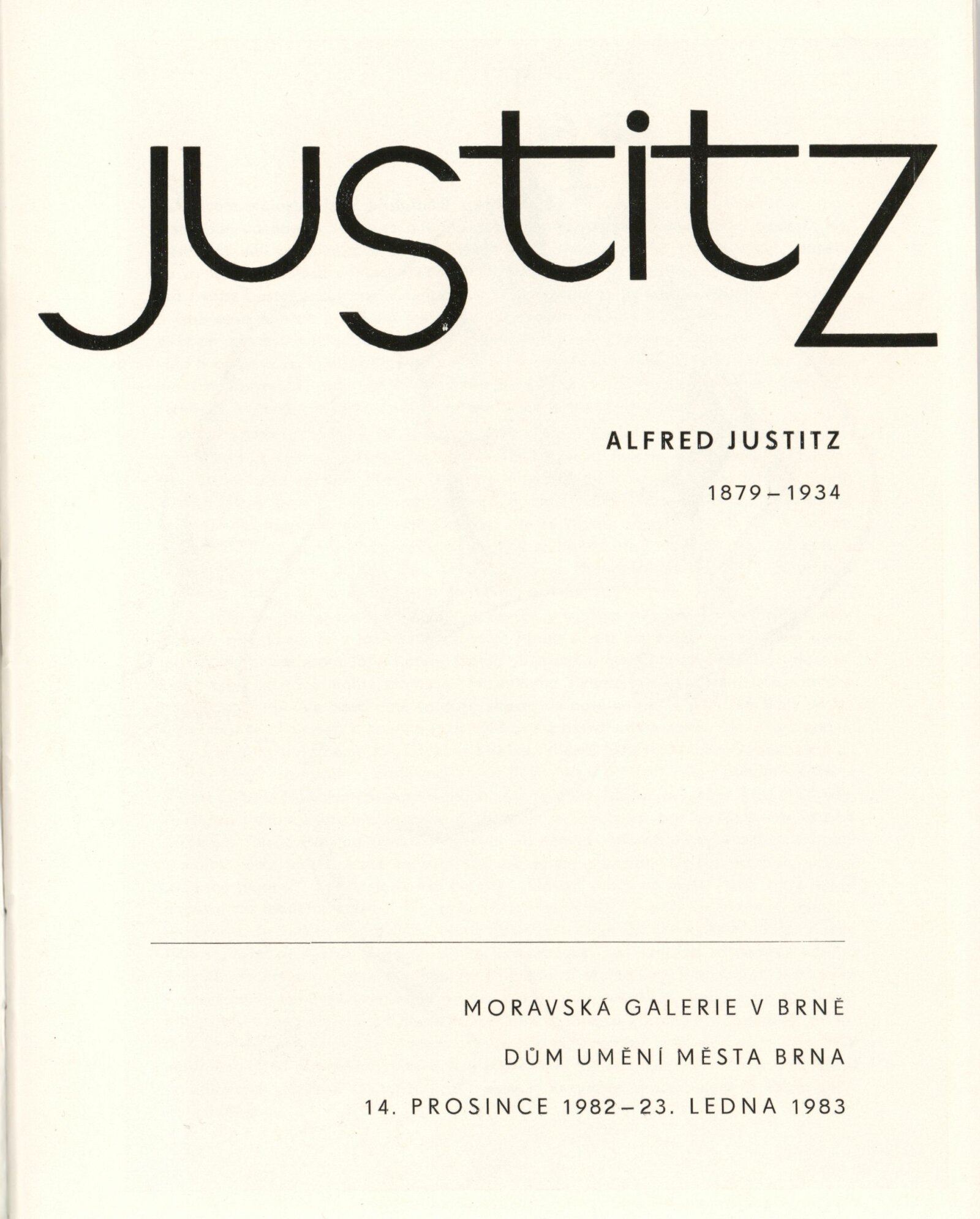 Alfred Justitz. 1879–1934: Dům umění města Brna, 1. patro, 14. 12. 1982 – 23. 1. 1983 / Text: Marie Dohnalová. – Brno: Moravská galerie, 1982. – 22 s., 24 s. obr. příl., portrét, životopis, výstavy, zastoupení v galeriích, bibliografie, DU 752. – MZK; MG
