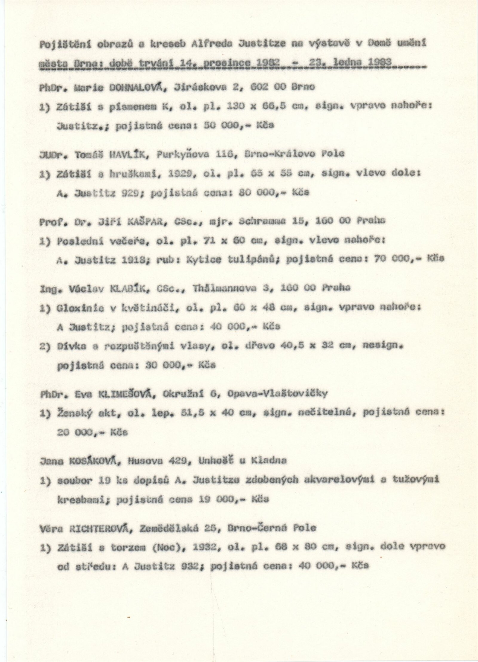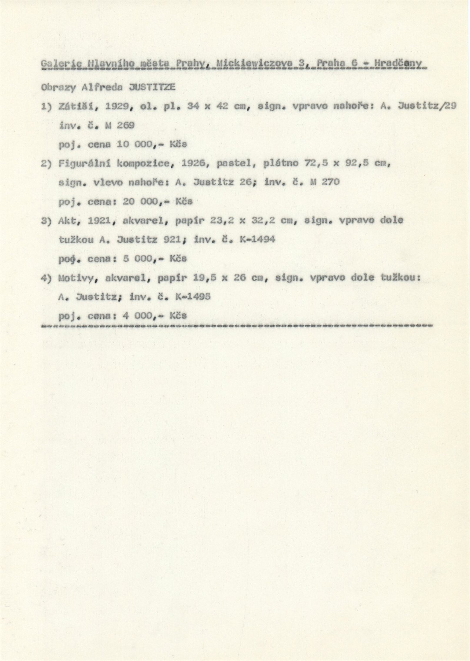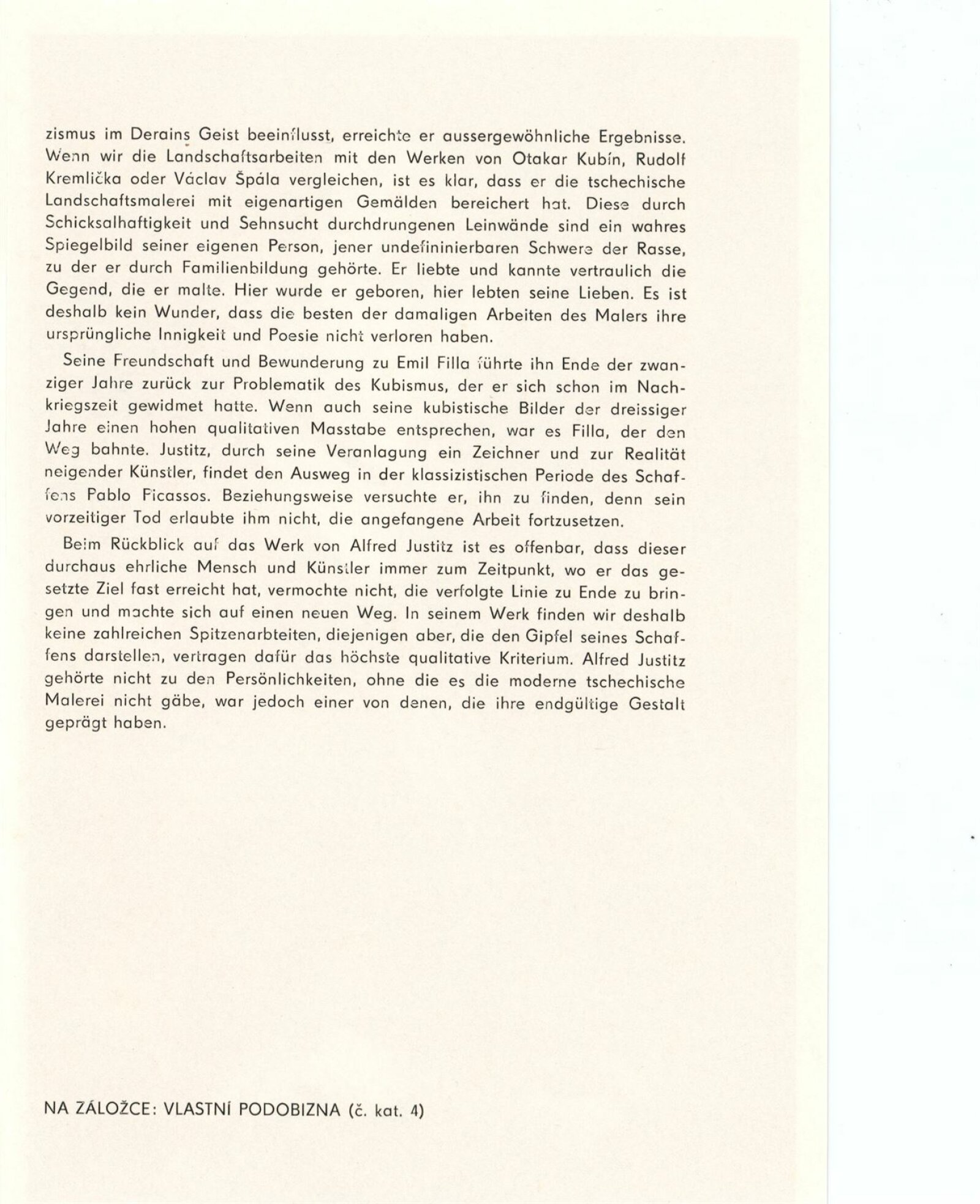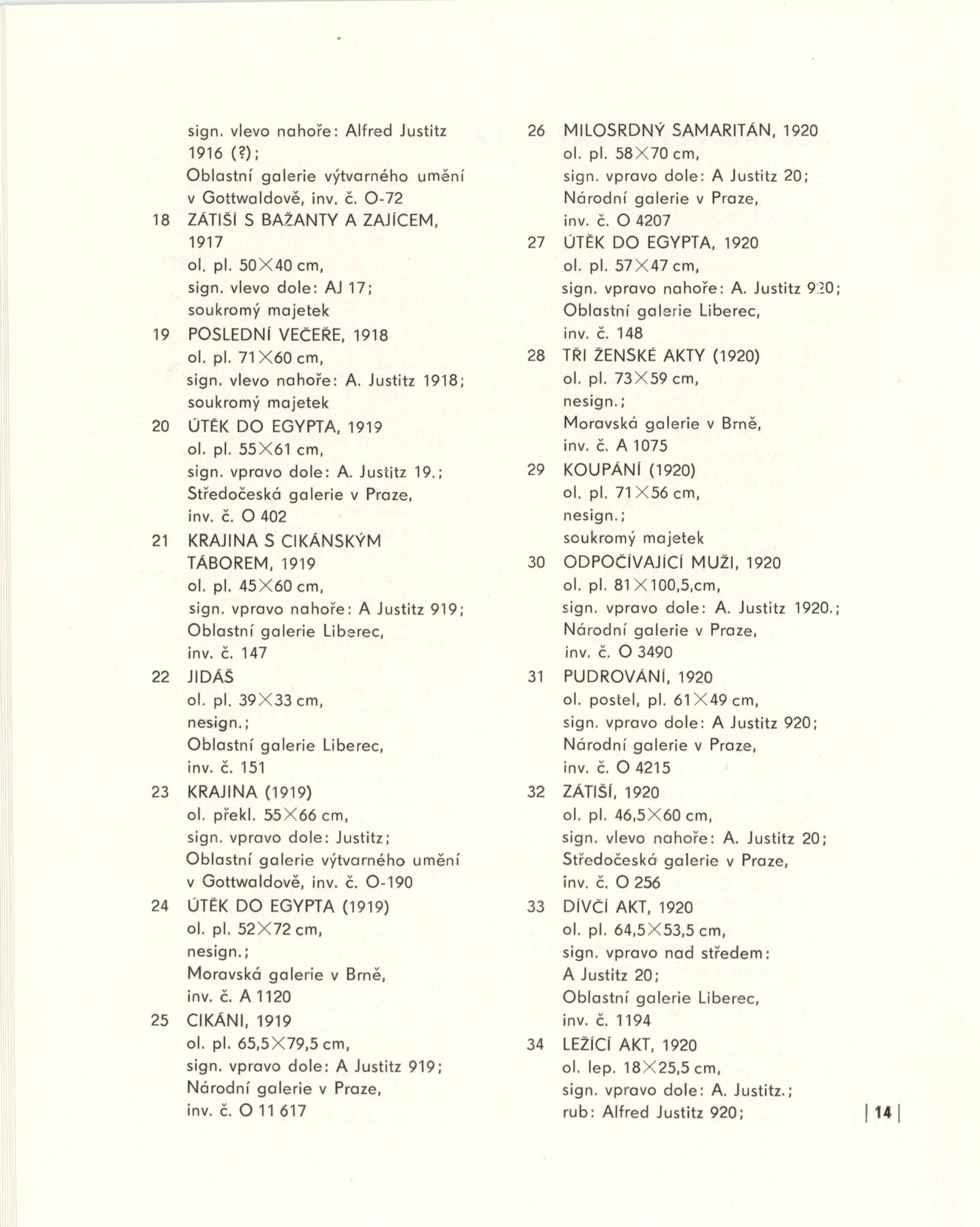 Alfred Justitz. 1879–1934: Dům umění města Brna, 1. patro, 14. 12. 1982 – 23. 1. 1983 / Text: Marie Dohnalová. – Brno: Moravská galerie, 1982. – 22 s., 24 s. obr. příl., portrét, životopis, výstavy, zastoupení v galeriích, bibliografie, DU 752. – MZK; MG