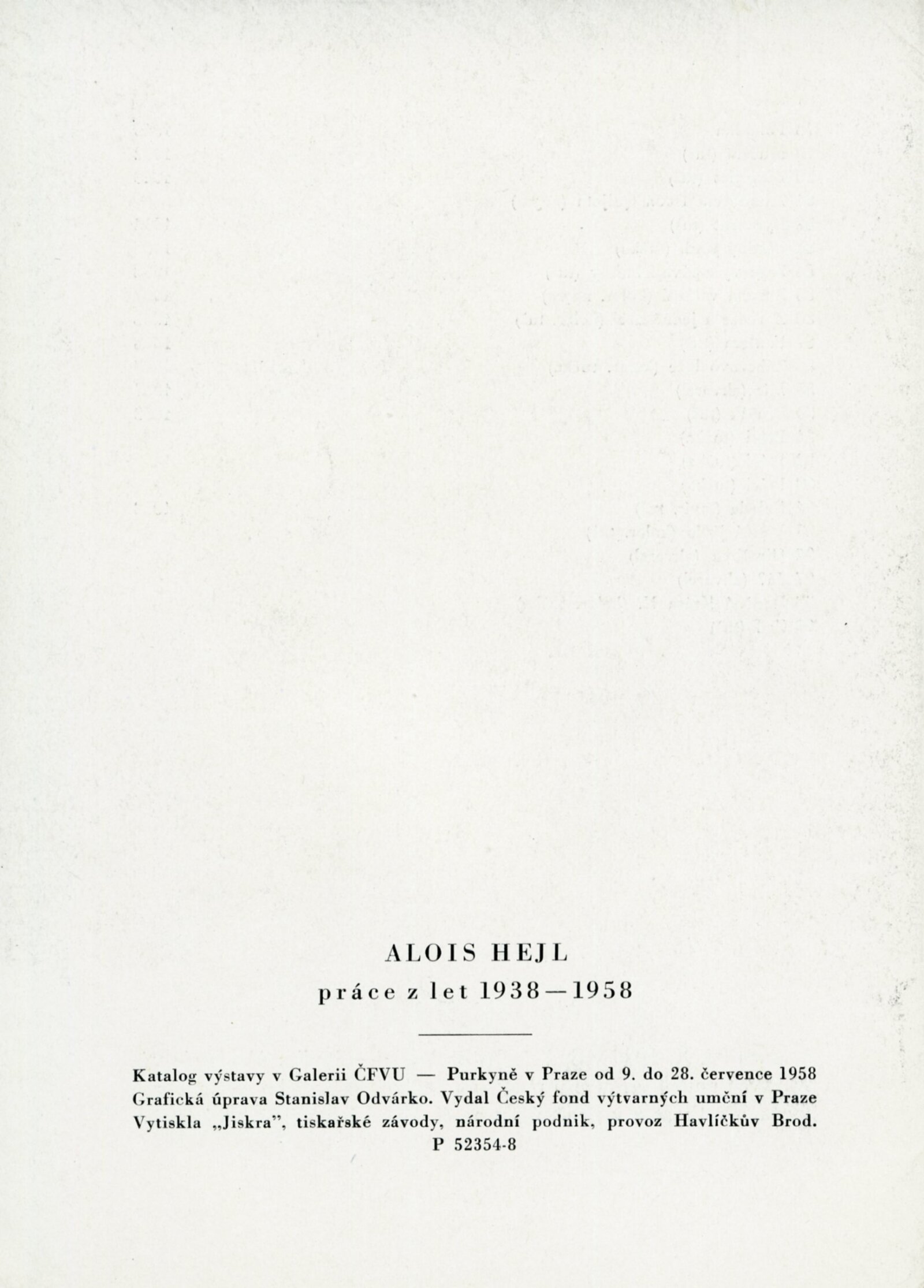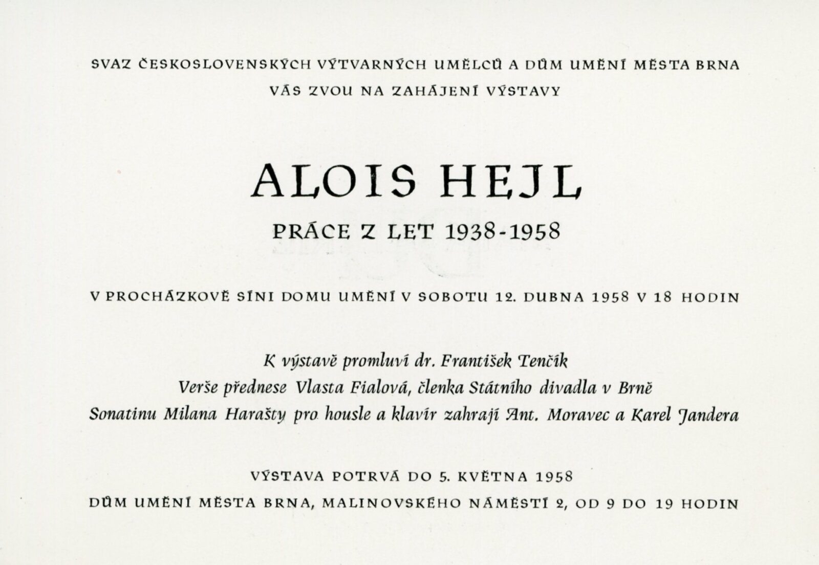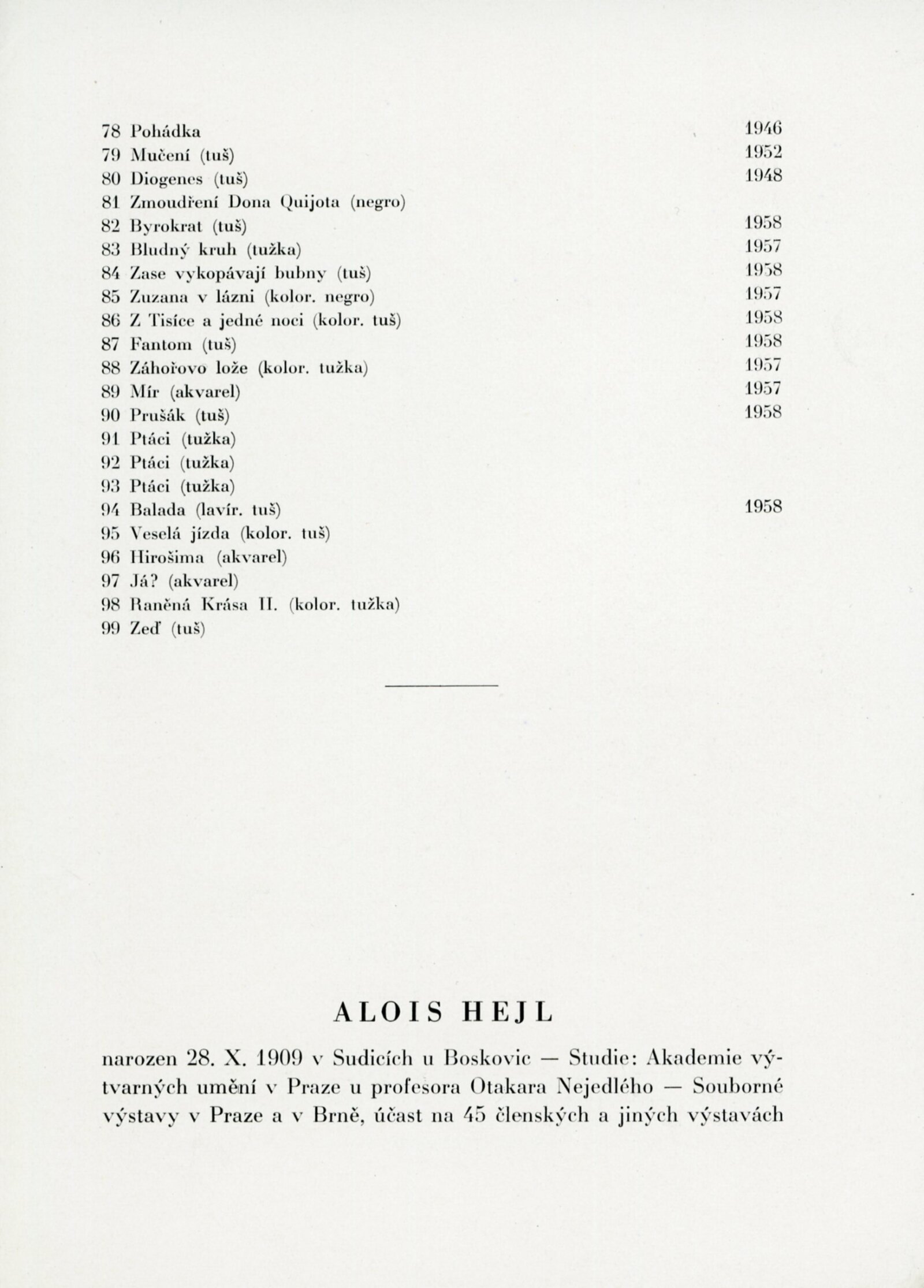 Alois Hejl. Práce z let 1938–1958: Dům umění, Malá galerie, 12. 4. – 4. 5. 1958 / Text: František Tenčík. – Brno: DUmB, 1958. – skládačka, 8 s., obr., DU 309