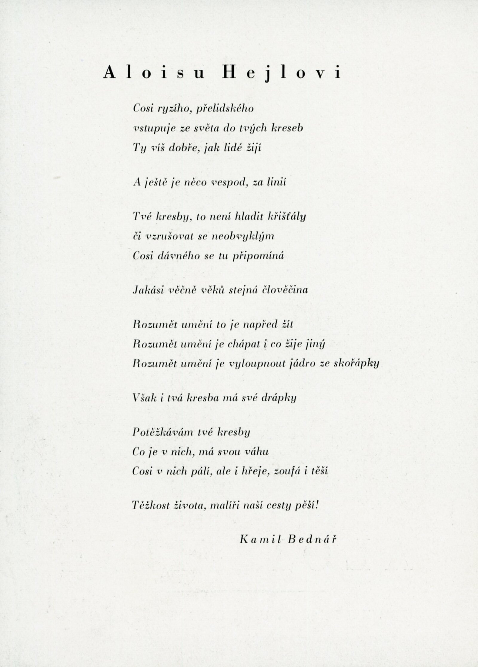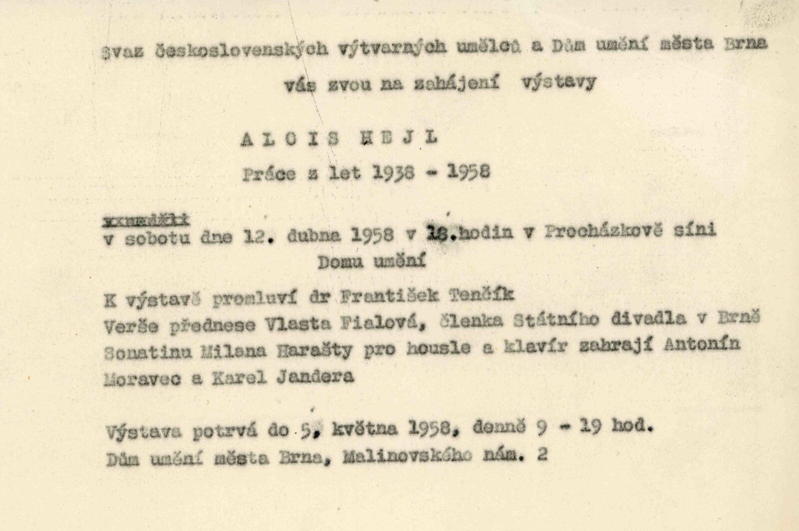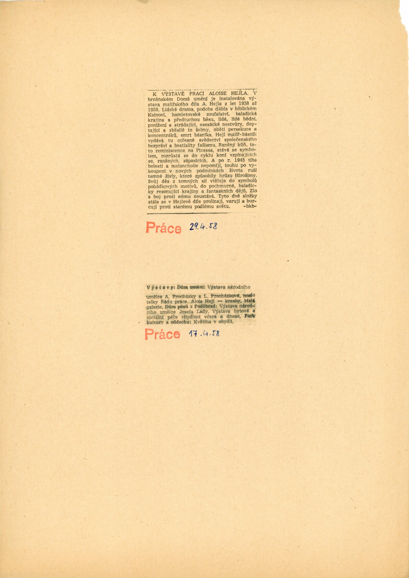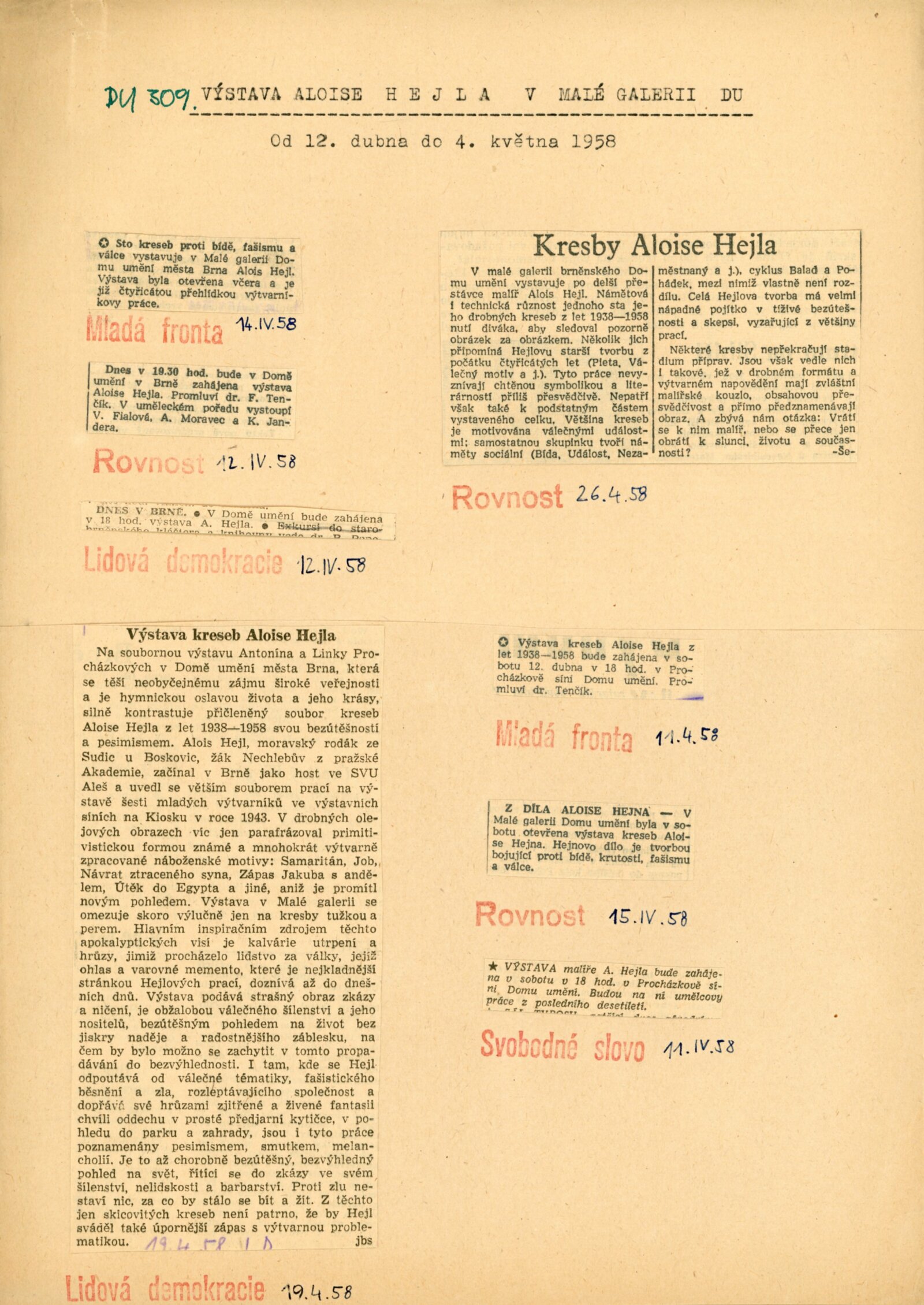 Alois Hejl. Práce z let 1938–1958: Dům umění, Malá galerie, 12. 4. – 4. 5. 1958 / Text: František Tenčík. – Brno: DUmB, 1958. – skládačka, 8 s., obr., DU 309