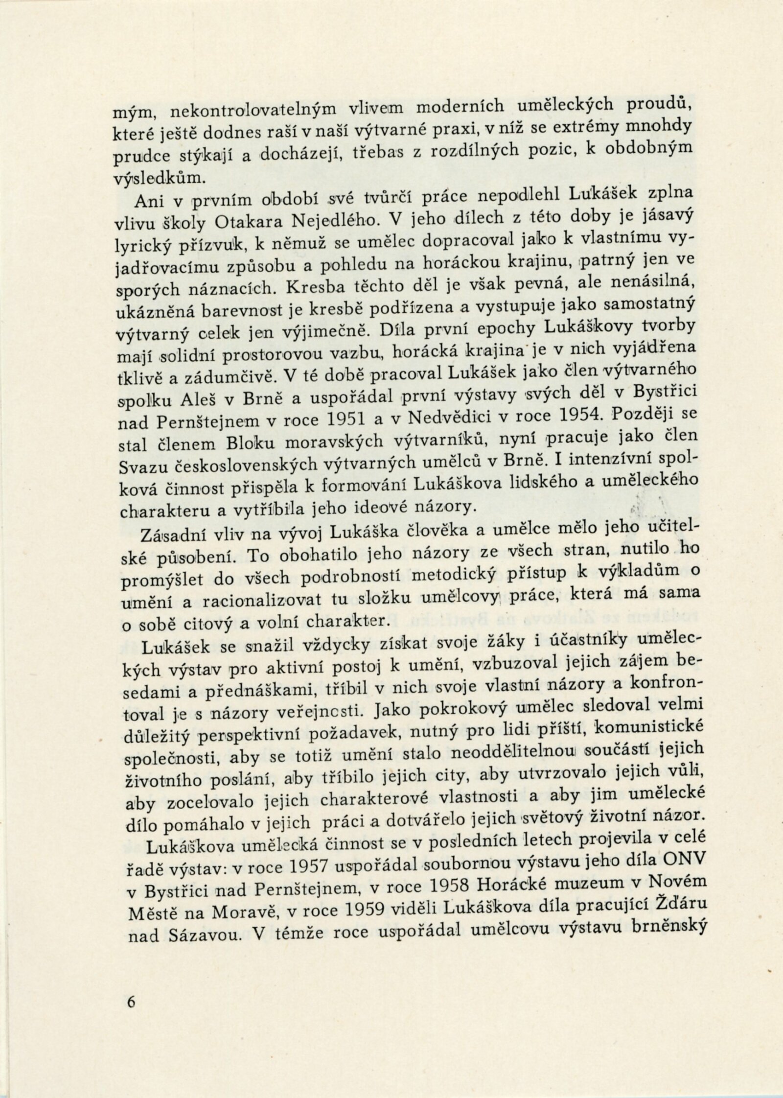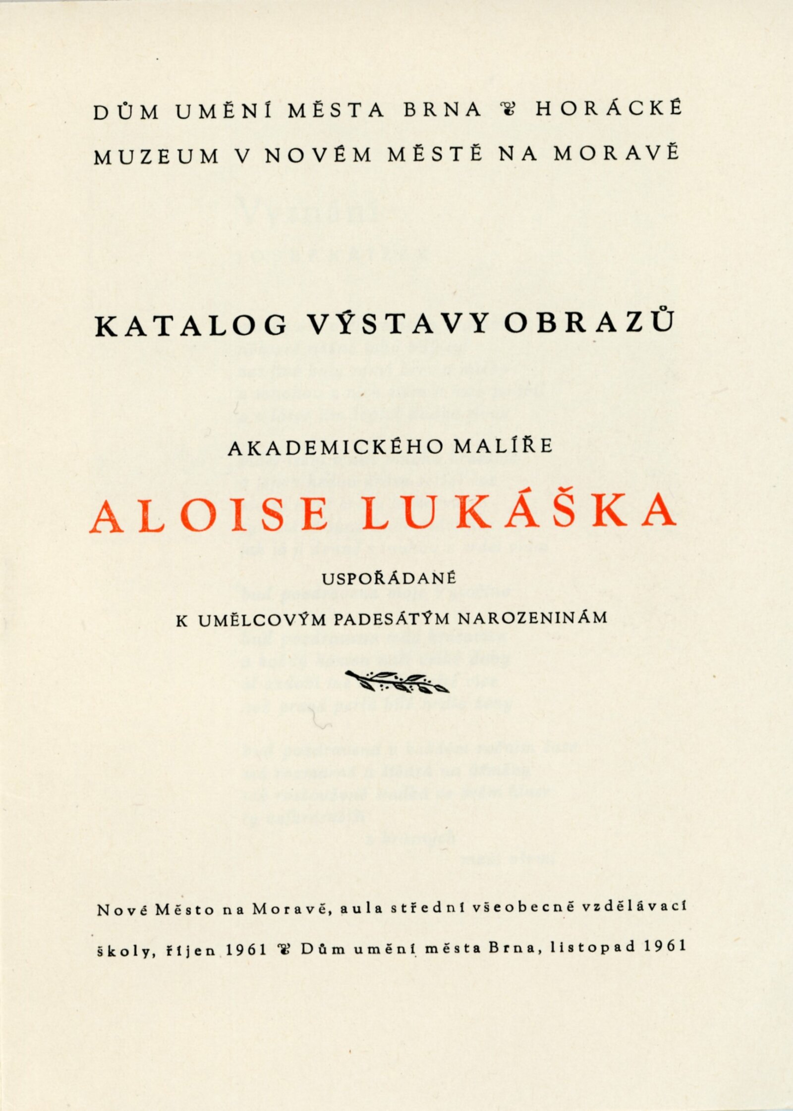 Alois Lukášek. Obrazy z Vysočiny: Dům umění, Malá galerie, 28. 2. – 30. 3. 1959 / Text: Leopold Pospíšil. – Brno: DUmB, 1959. – skládačka, 6 s., obr., báseň Petr Křička, životopis, DU 326. – MG; MMB