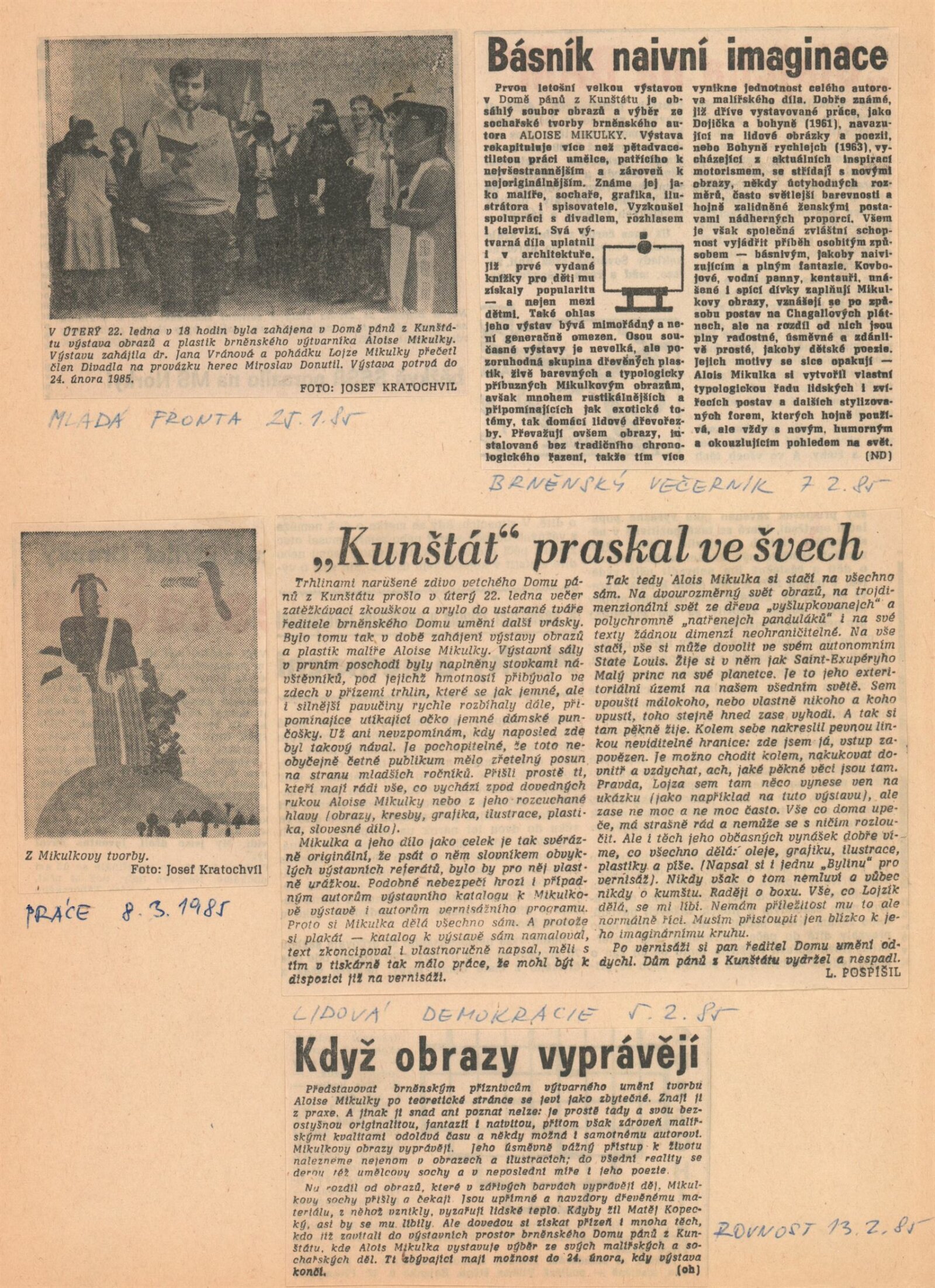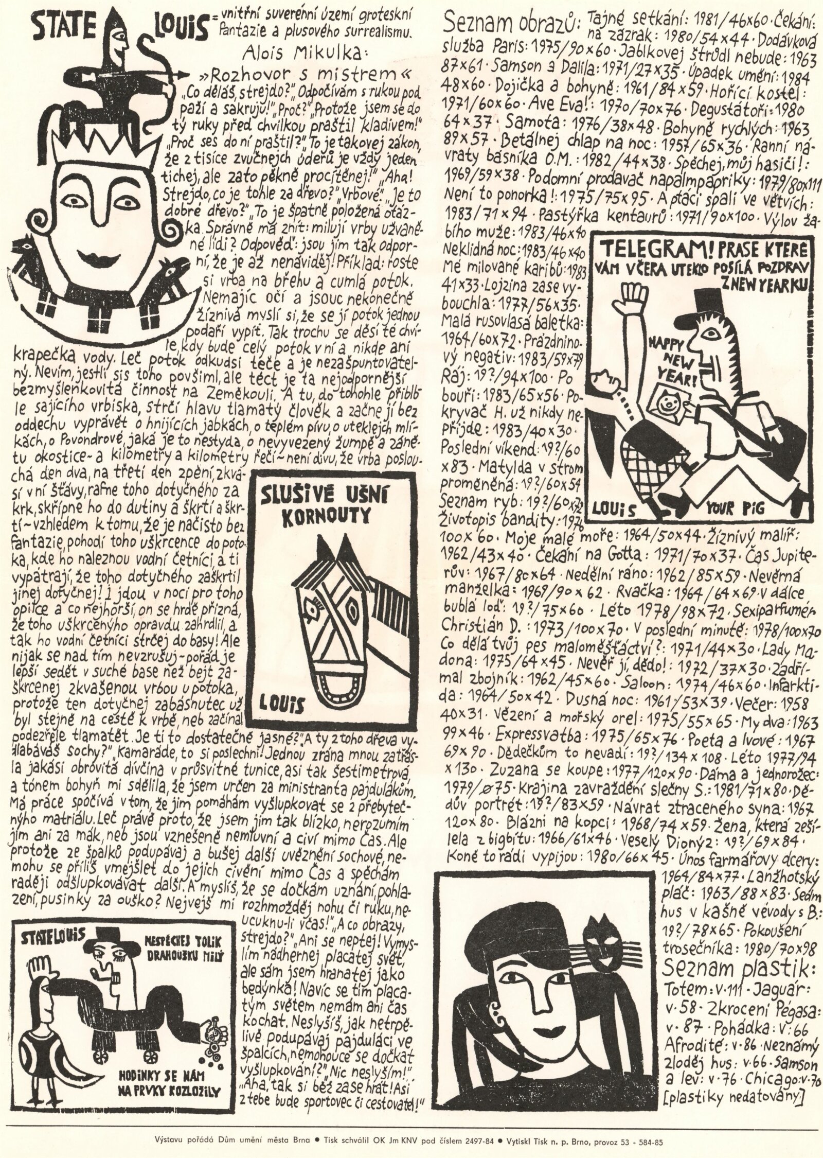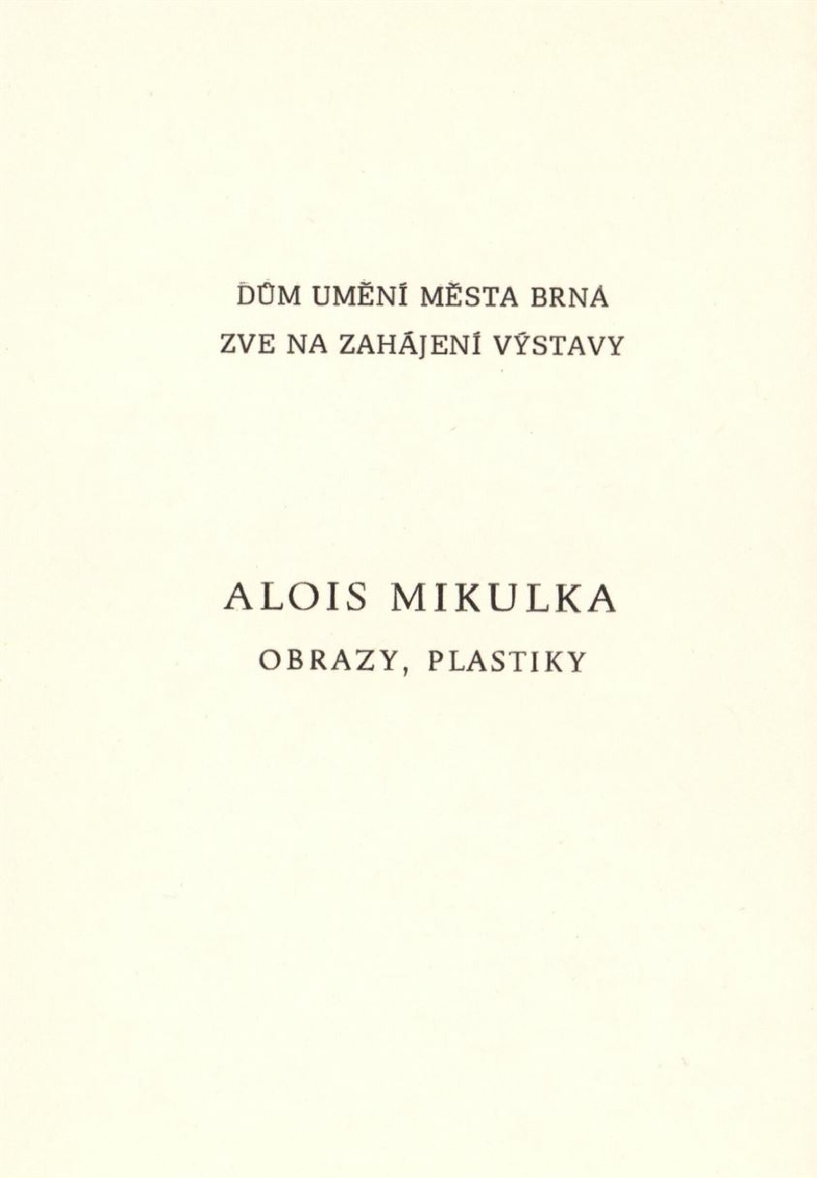 Alois Mikulka. Výstavy obrazů a plastik 1958–1984: Dům umění / Dům pánů z Kunštátu, 1. patro, 22. 1. – 24. 2. 1985 / Text: autor. – Brno: DUmB, 1985. – složený list s kaligrafickým textem autora, DPK 836