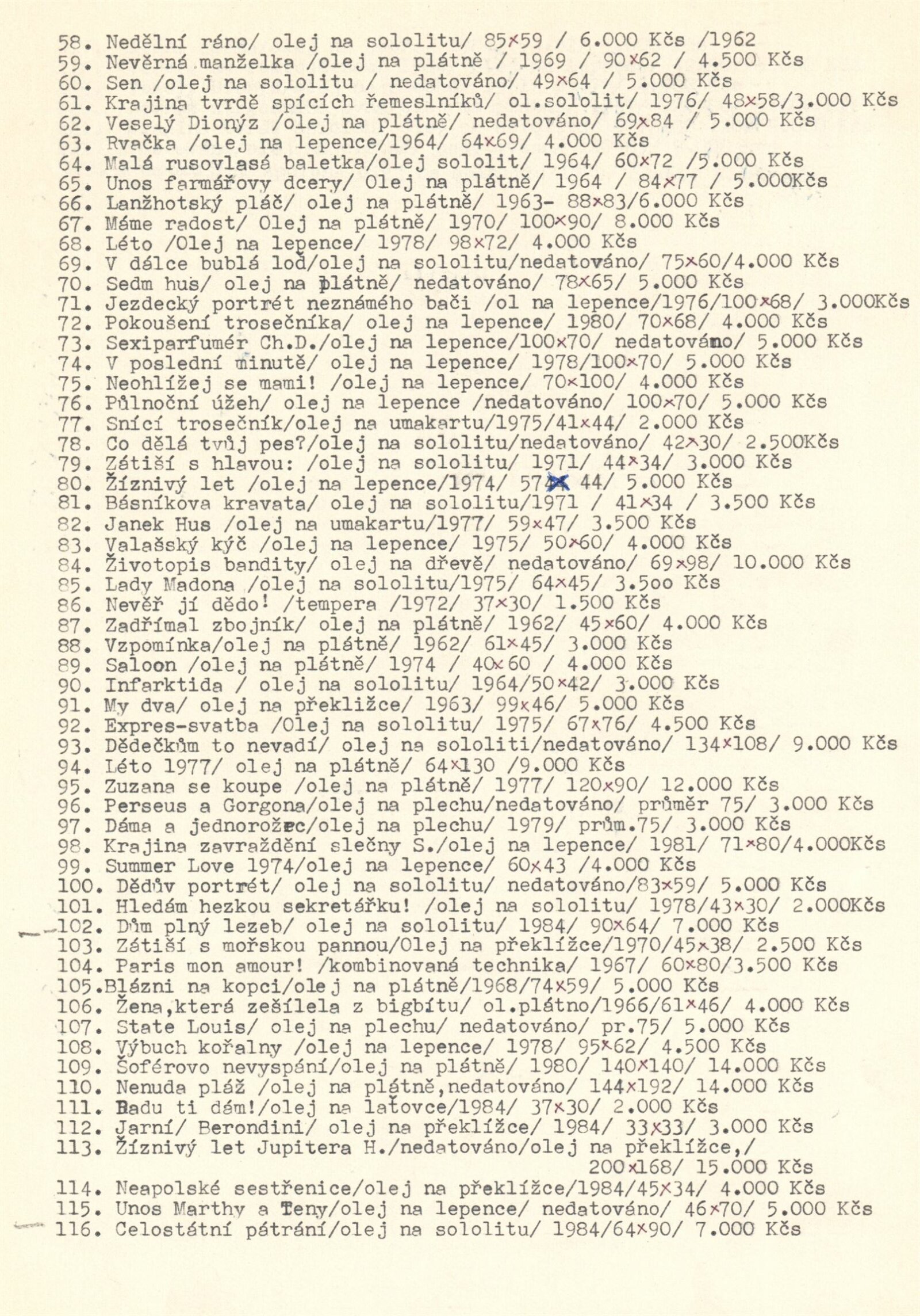 pozvánka, pozvánka na setkání v rámci výstavy Hudba mezi obrazy, plakát na výstavu s textem od Aloise Mikulky, úvodní slovo na vernisáži Jana Vránová, seznam vystavených děl a pojistný seznam, žádost o povolení výstavy a dohoda o výstavě, recenze v tisku