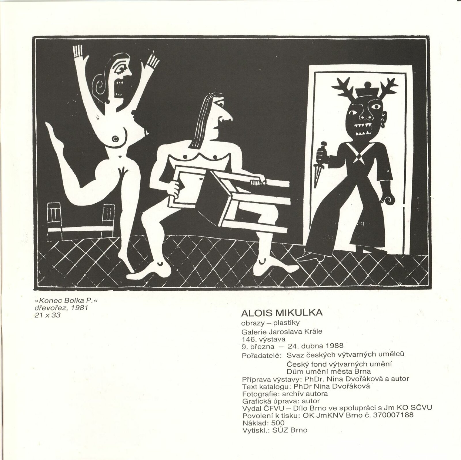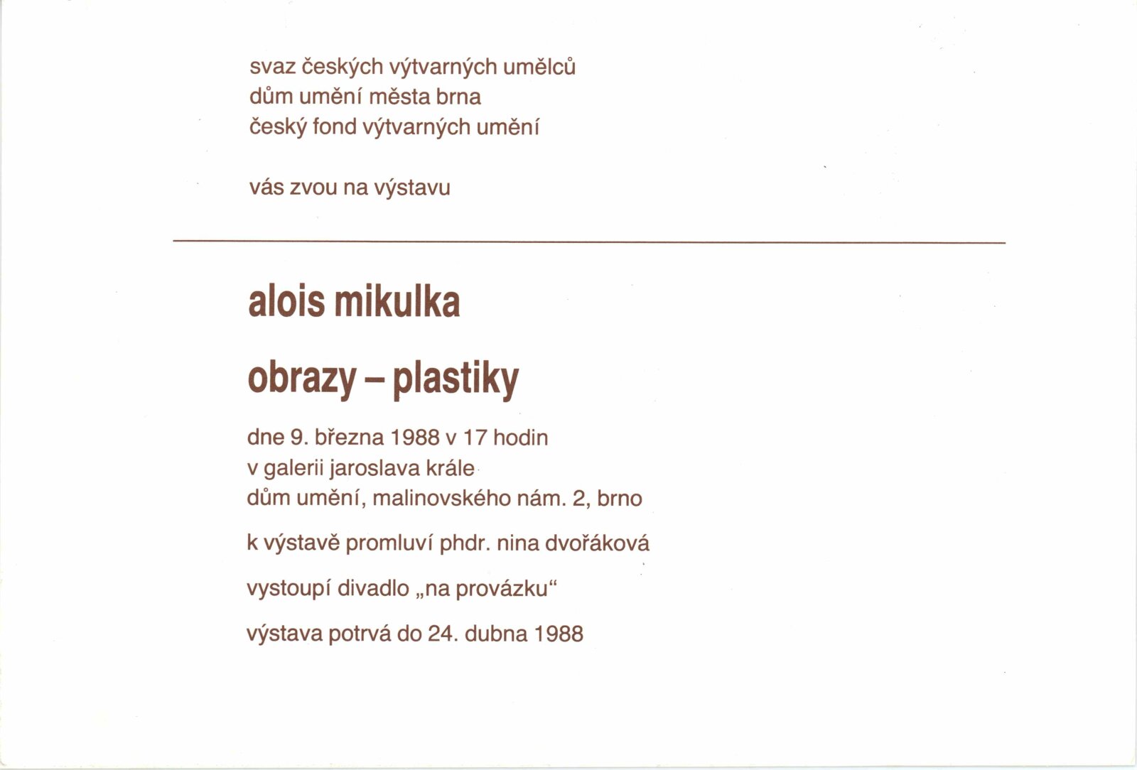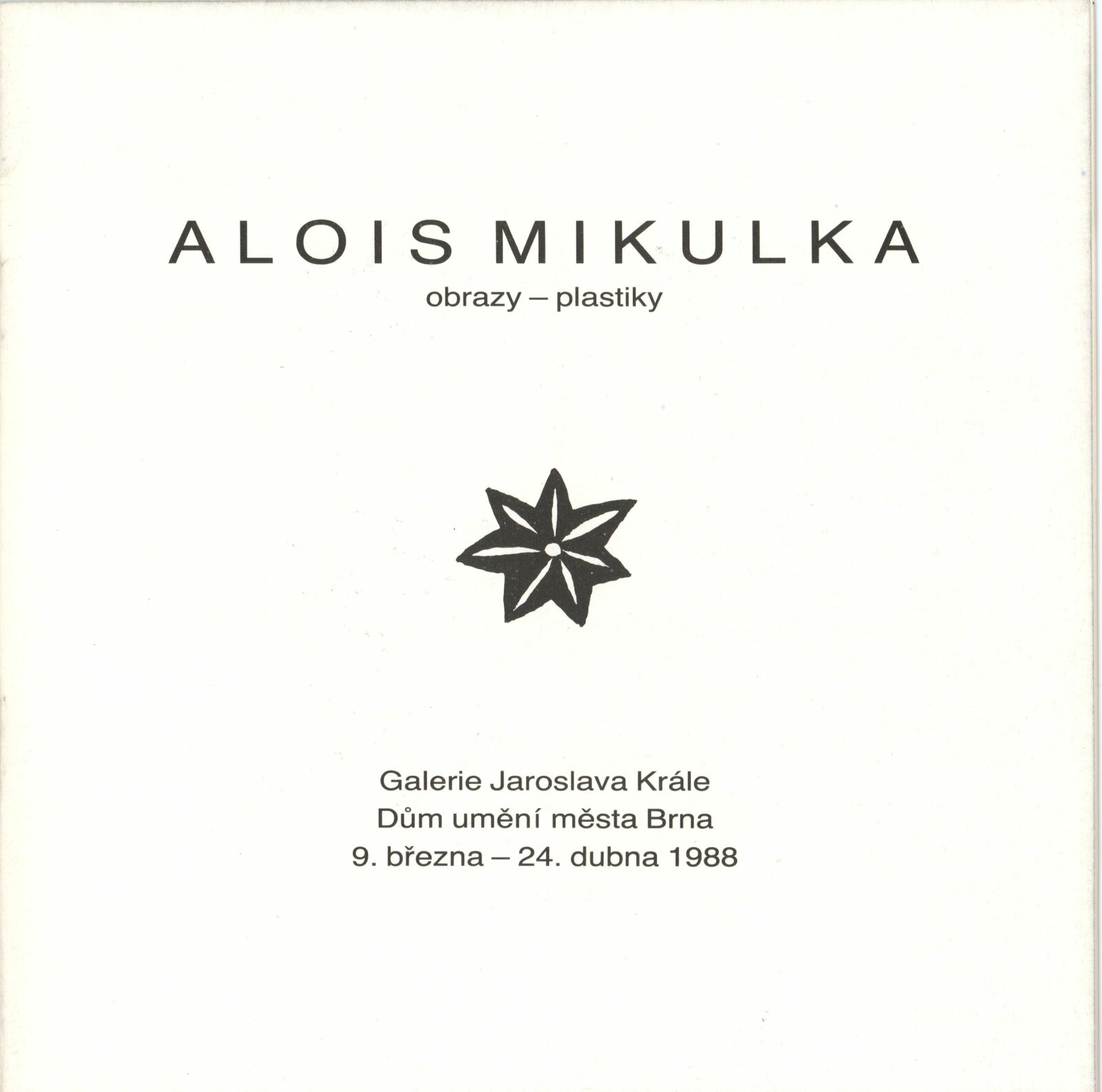 Alois Mikulka. Obrazy, plastiky: Dům umění, 146. výstava v Galerii Jaroslava Krále, 9. 3. – 24. 4. 1988 / Text: Nina Dvořáková. – Brno: ČFVU, 1988. – [16] s., obr., životní data, výstavy, realizace v architektuře, DU 852. – MZK; MG