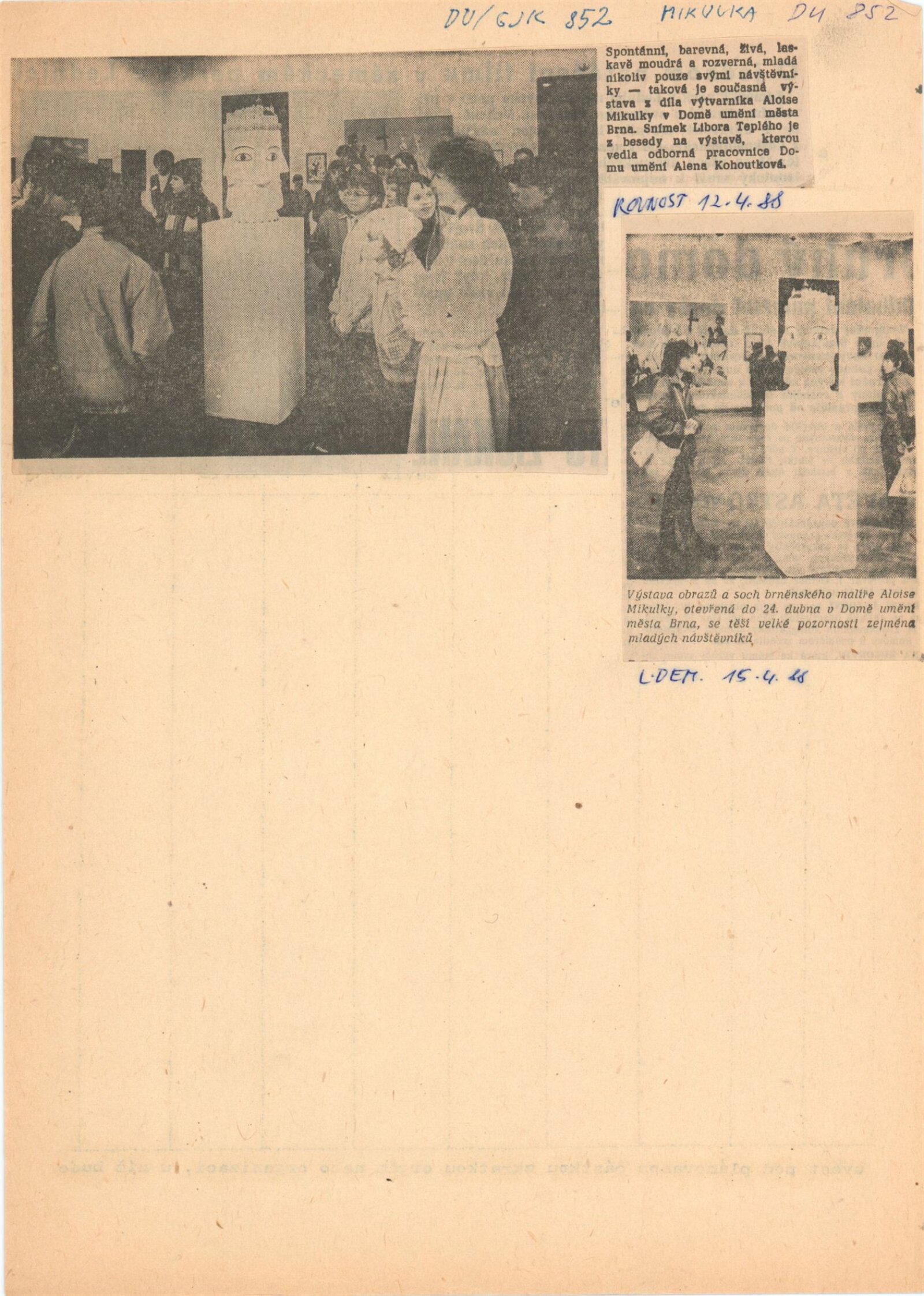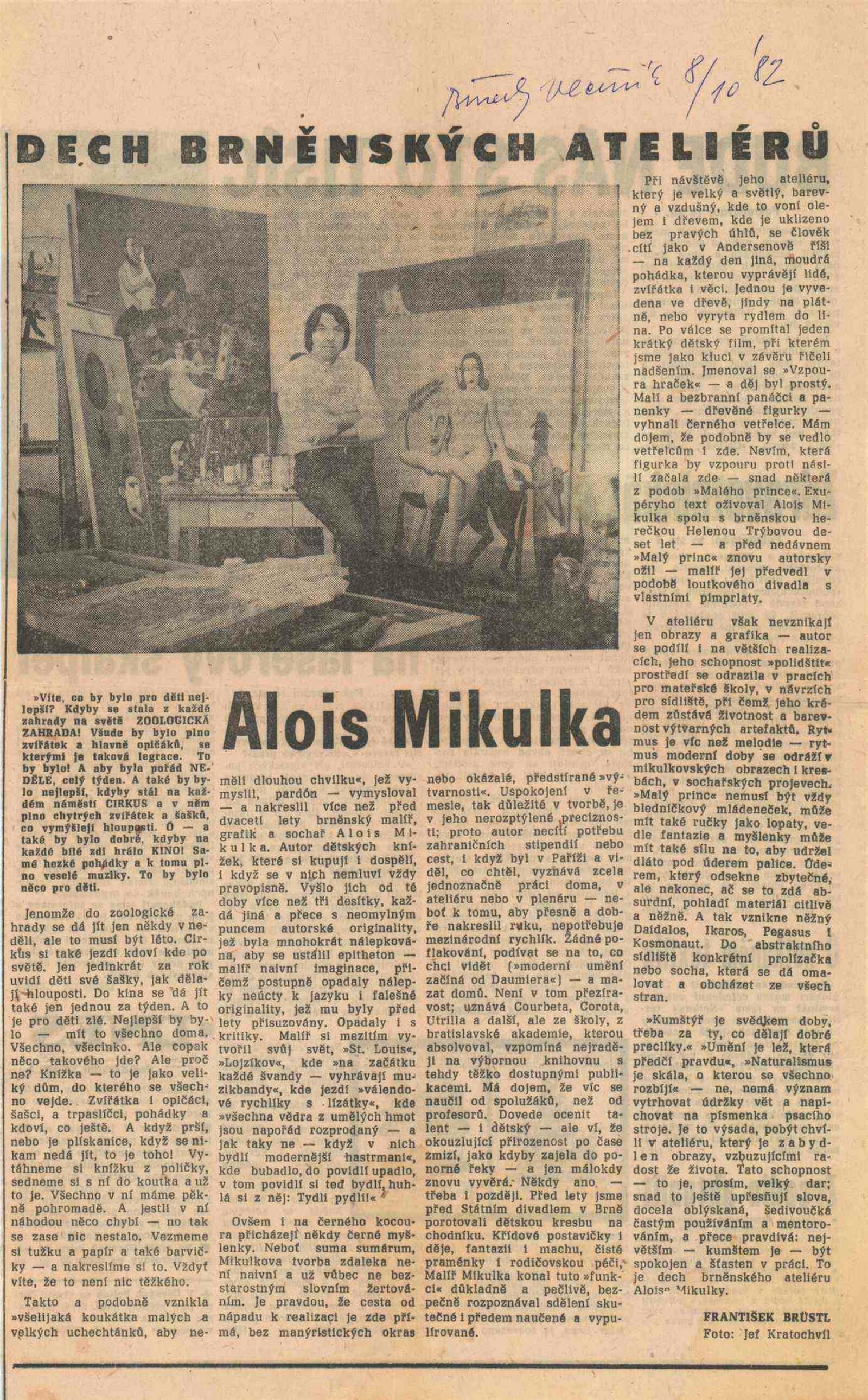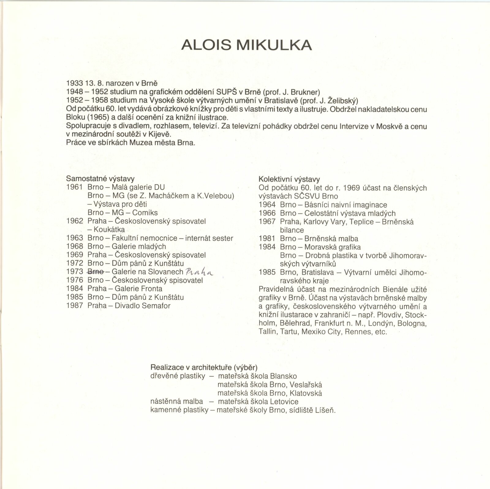 pozvánka, katalog, fotografie výstavy a z besedy na výstavě, recenze v tisku, recenze díla a výstavy Aloise Mikulky (1973-1985), katalog k hromadné výstavě v UPM v Brně (1961), pozvánka na výstavu Aloise Mikulky v Brně (1963), pozvánka a katalog k výstavě Aloise Mikulky v Galerii mladých v Brně (1968), pozvánka na výstavu A. Mikulky v DPK v Brně (1972), v MG KČSS v Brně (1976), v MG KČSS v Brně (1981), tisk - přání od A. Mikulky (1988)