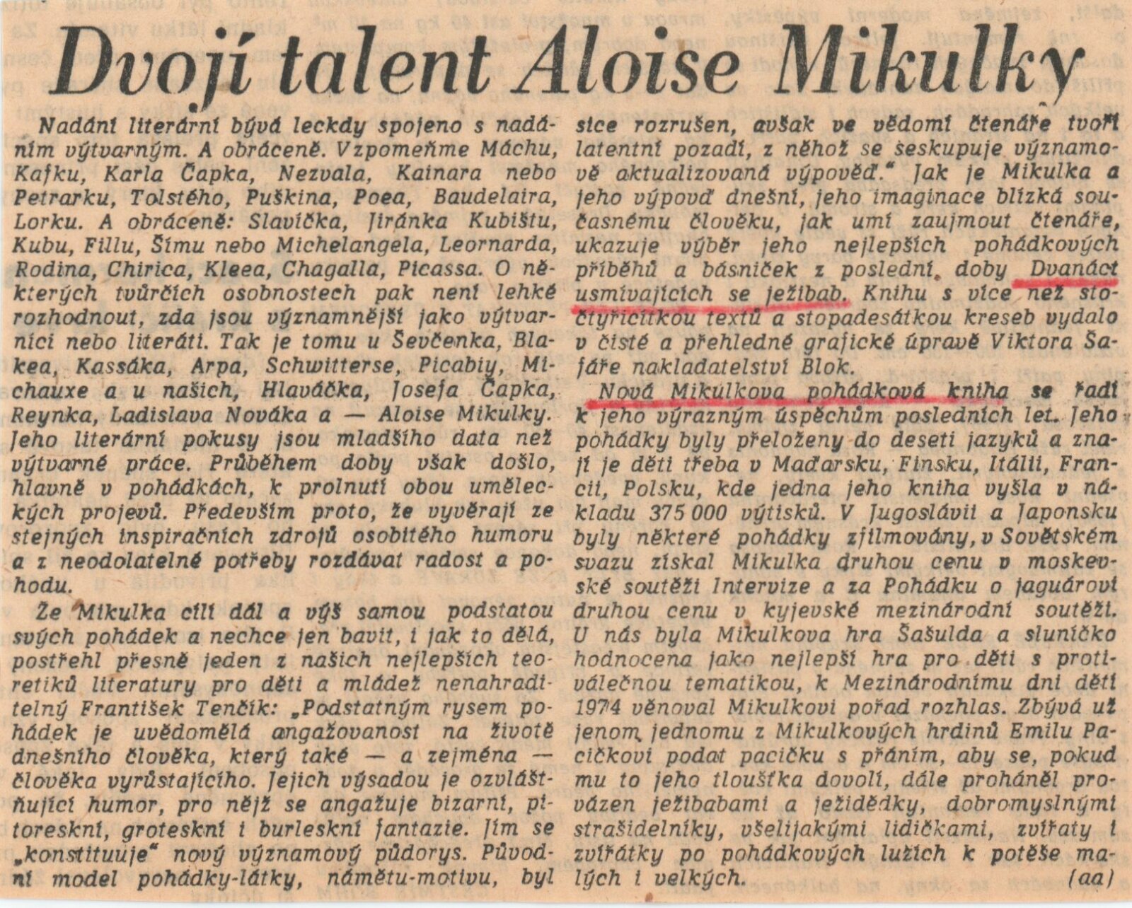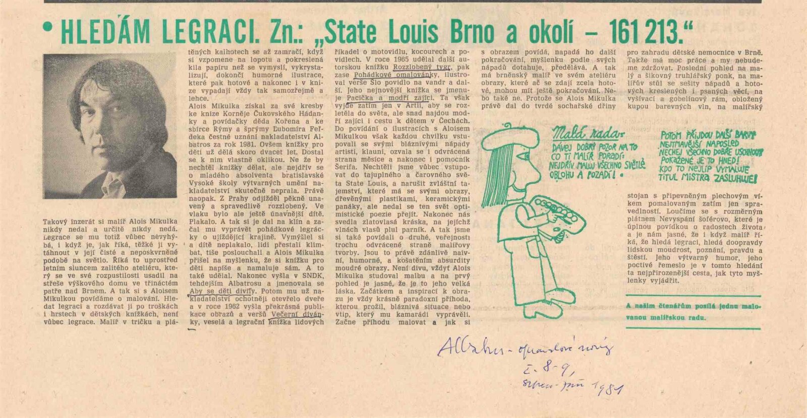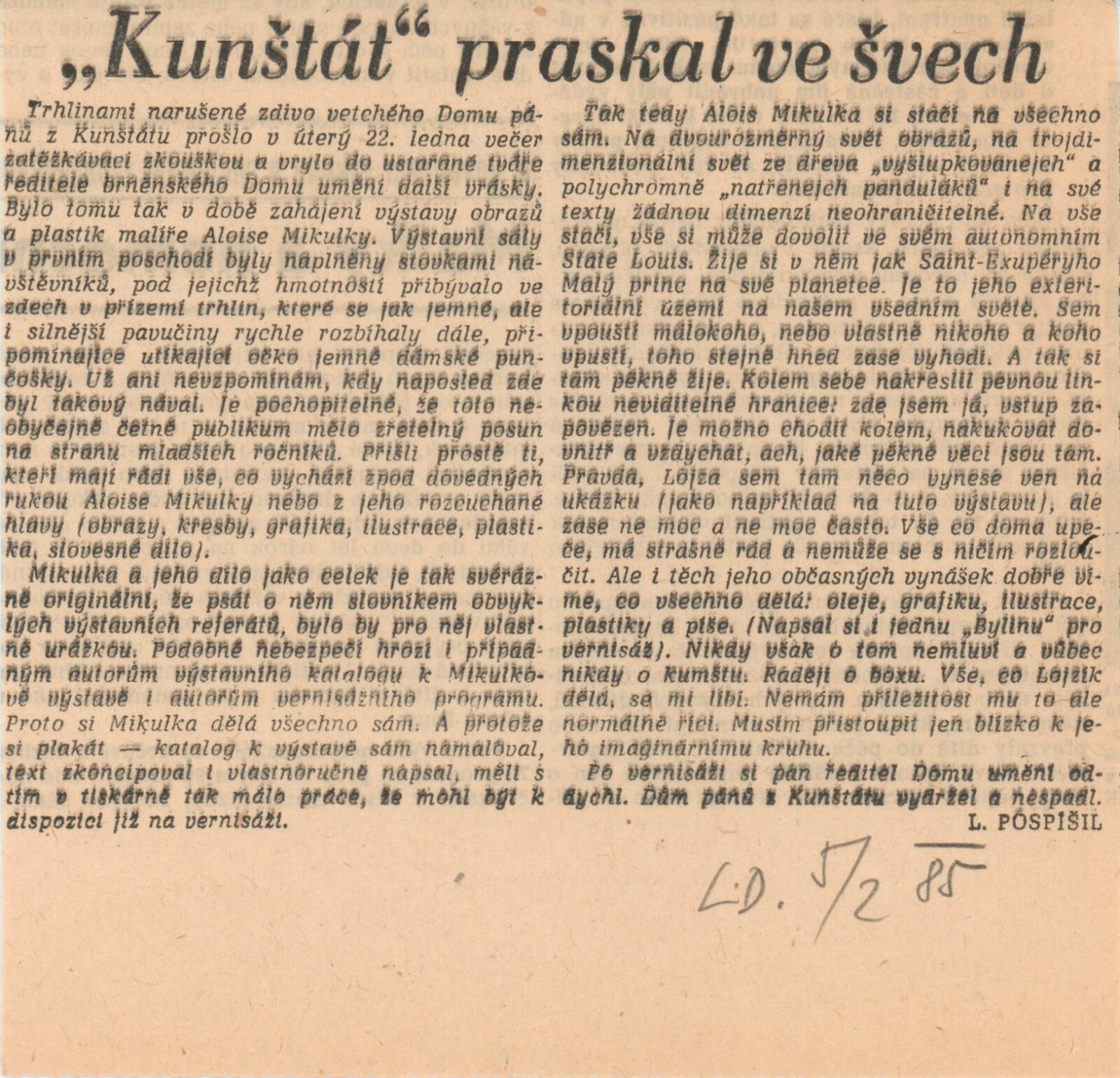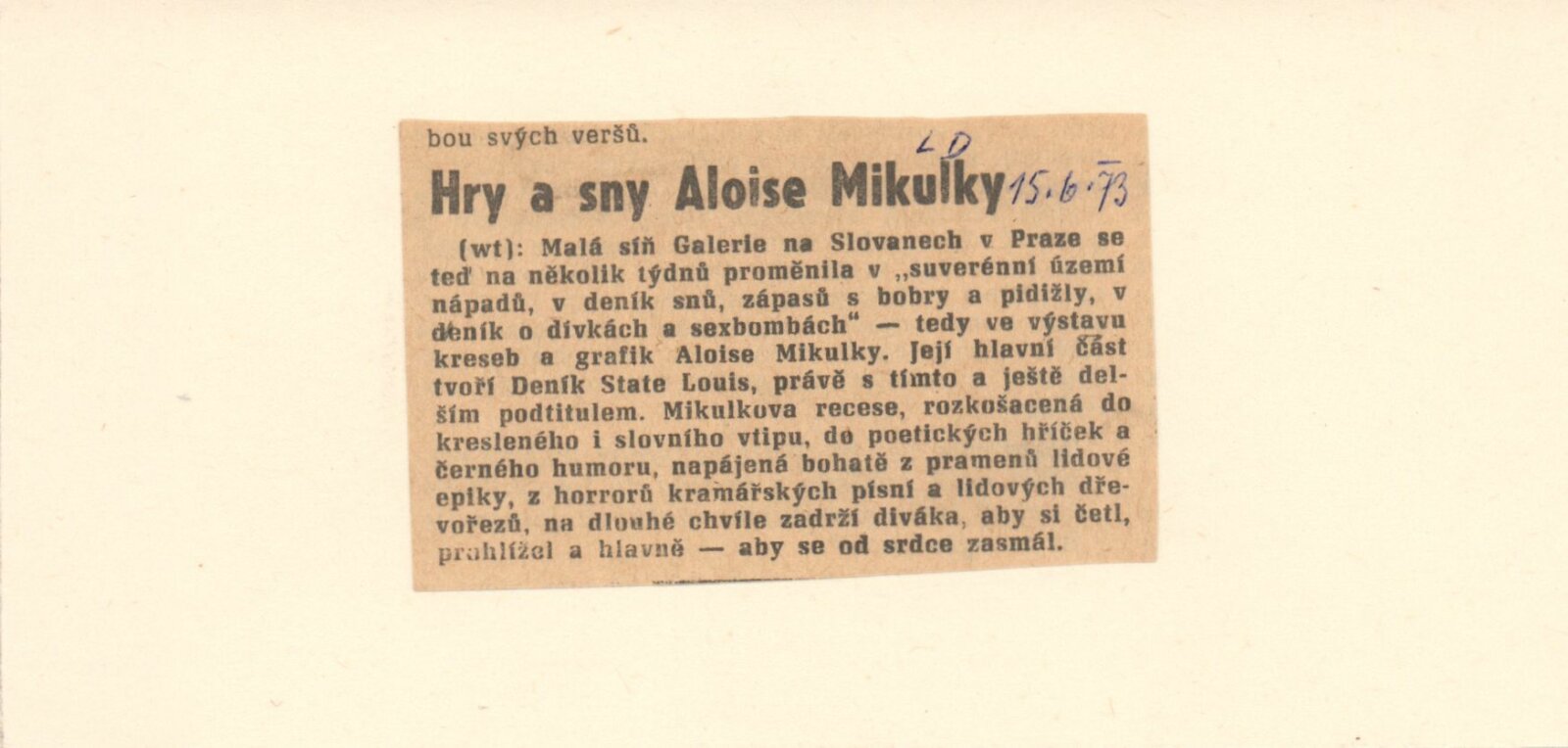 pozvánka, katalog, fotografie výstavy a z besedy na výstavě, recenze v tisku, recenze díla a výstavy Aloise Mikulky (1973-1985), katalog k hromadné výstavě v UPM v Brně (1961), pozvánka na výstavu Aloise Mikulky v Brně (1963), pozvánka a katalog k výstavě Aloise Mikulky v Galerii mladých v Brně (1968), pozvánka na výstavu A. Mikulky v DPK v Brně (1972), v MG KČSS v Brně (1976), v MG KČSS v Brně (1981), tisk - přání od A. Mikulky (1988)