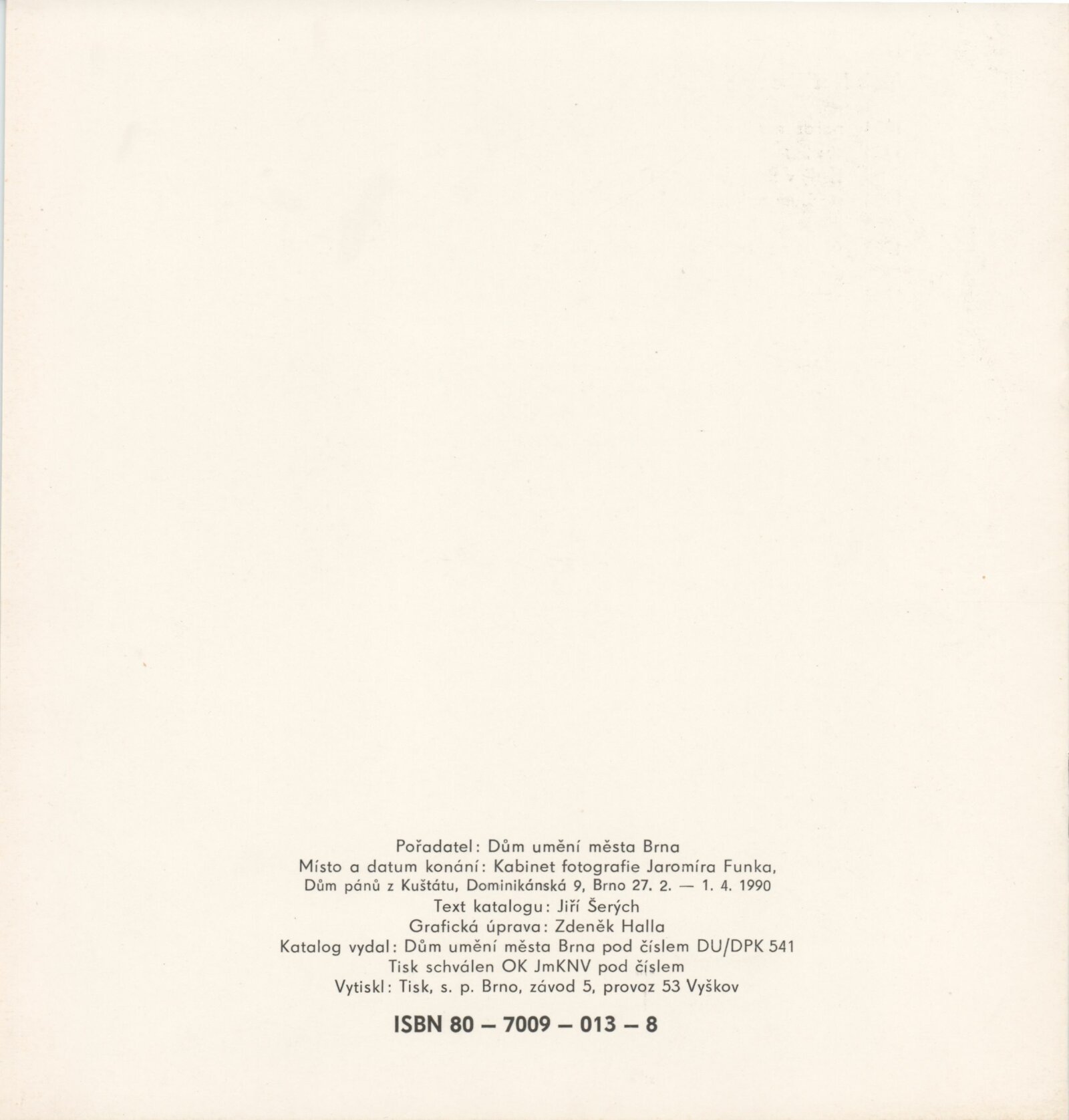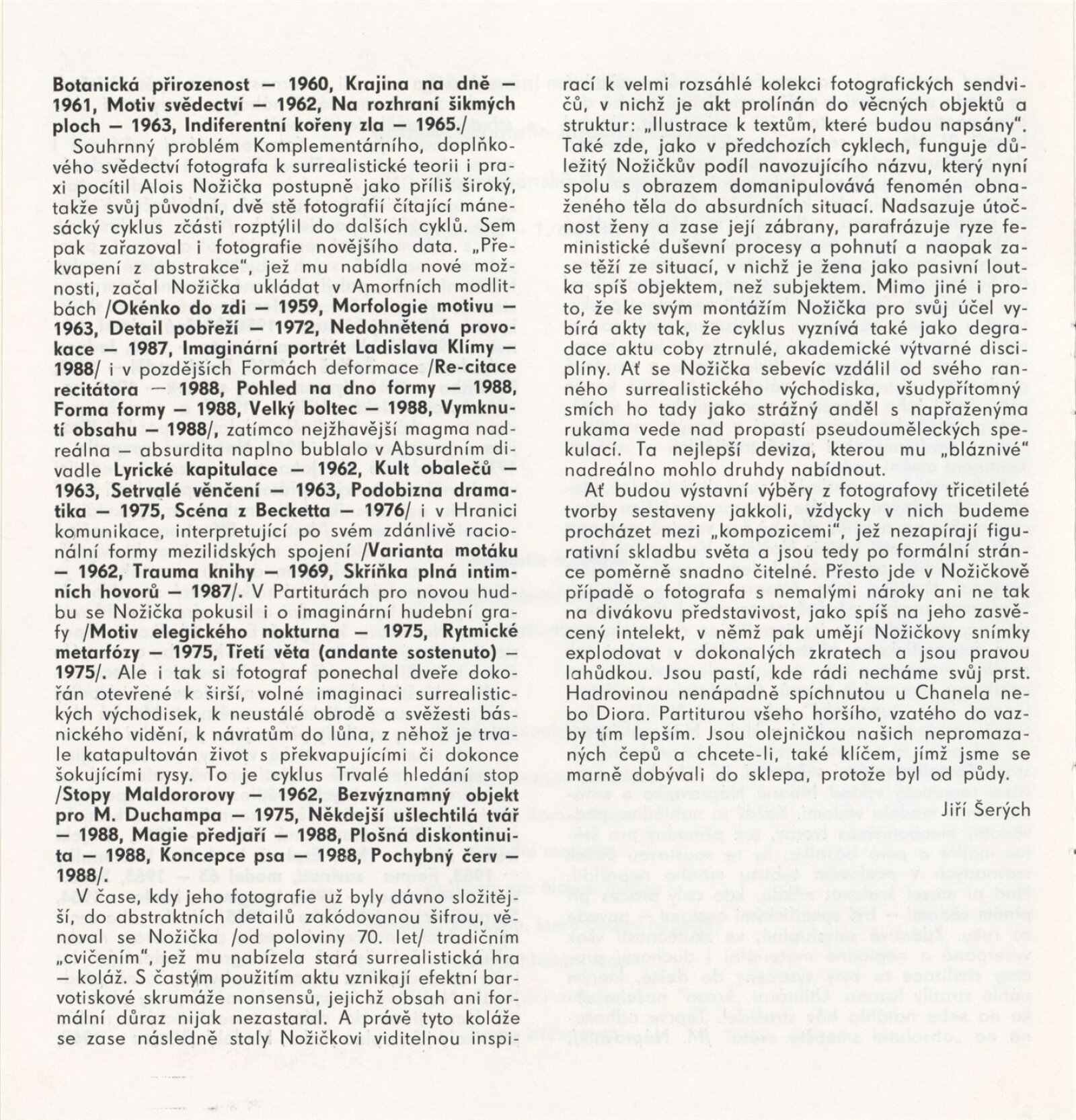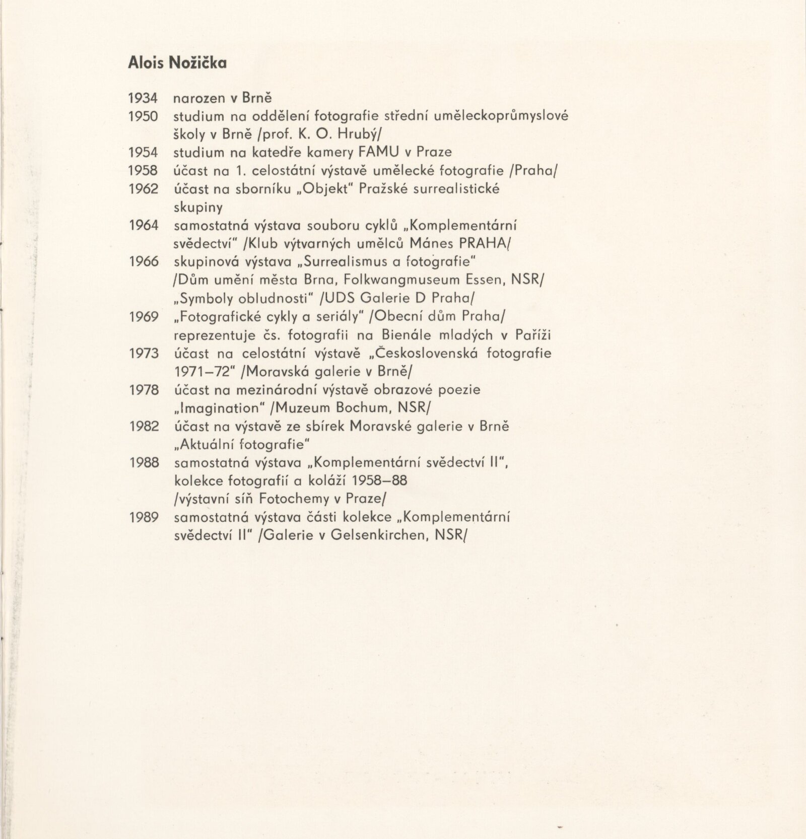 Alois Nožička. Fotografie a koláže. Komplementární svědectví II. 1959–1989: Dům umění města Brna / Dům pánů z Kunštátu, Kabinet fotografie Jaromíra Funka, 27. 2. – 1. 4. 1990 / Text: Jiří Šerých. – Brno: DUmB, 1990. – [9] s., obr., životní data, DPK 933. – MZK; MG