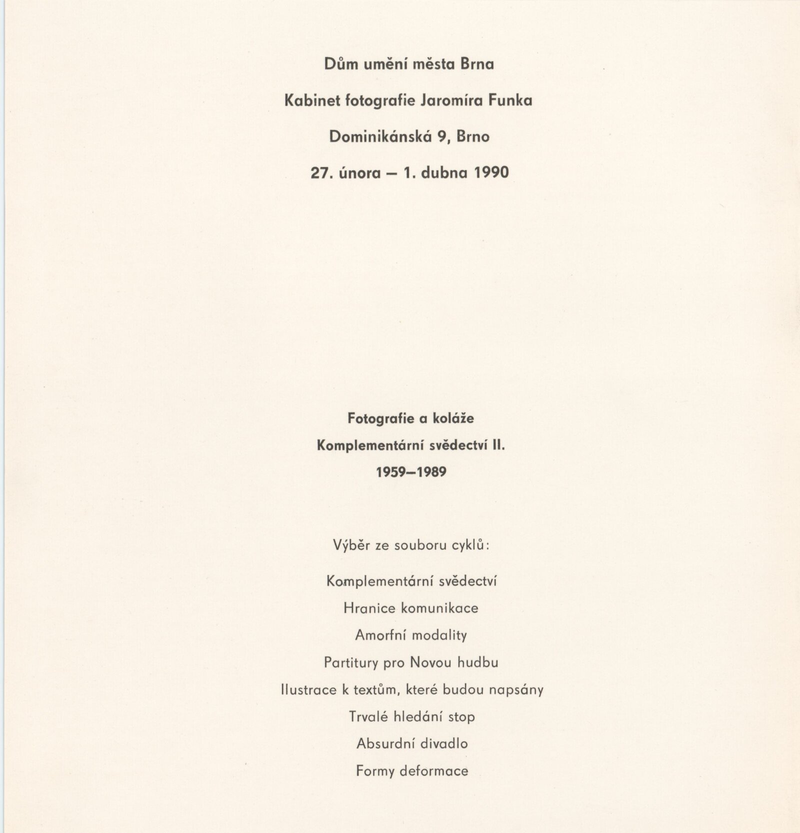 pozvánka, katalog, podklady pro katalog, provozní korespondence, pozvánka (A. N., Komplementární svědectví II., 1988, Fotochema Praha)
