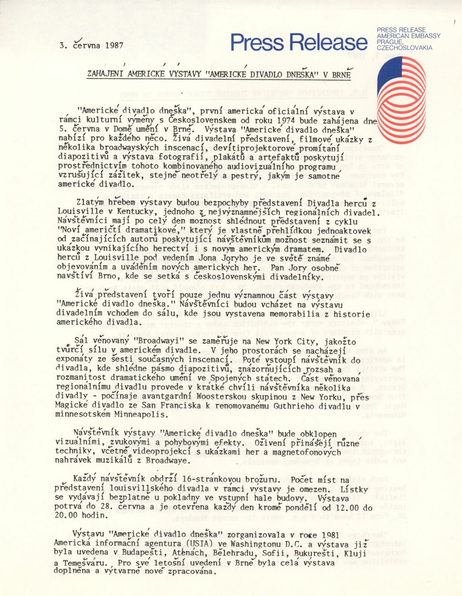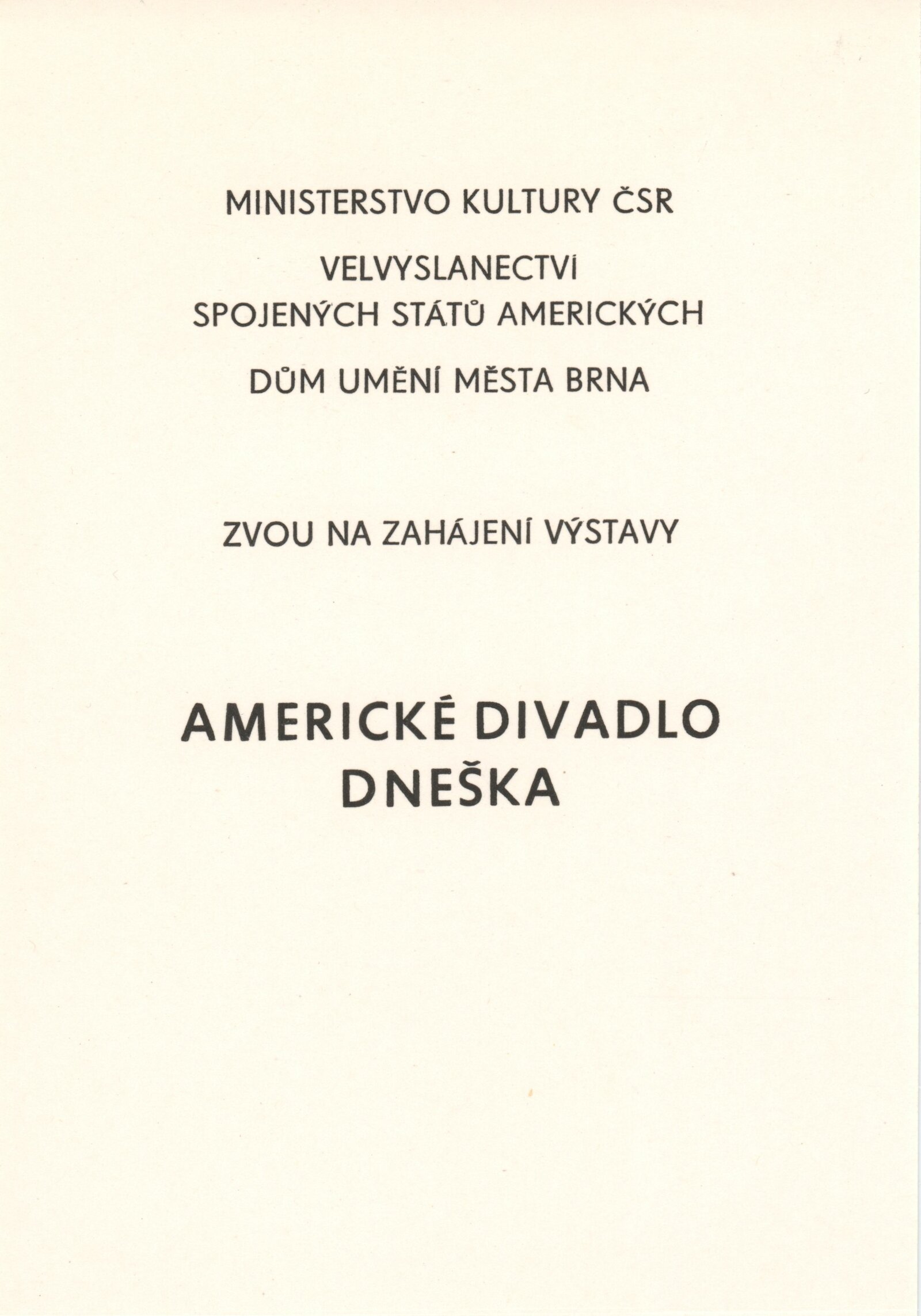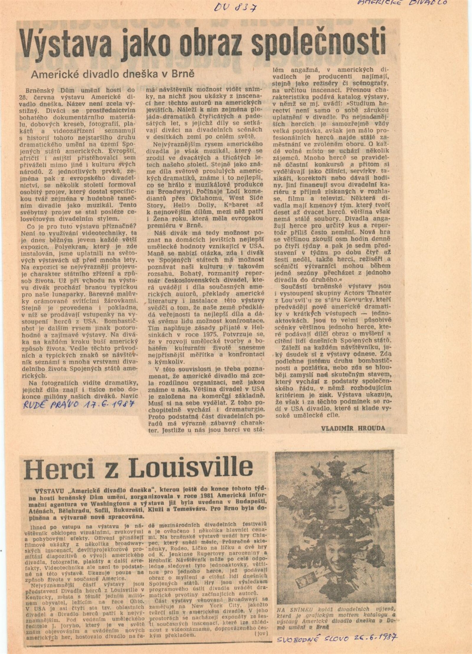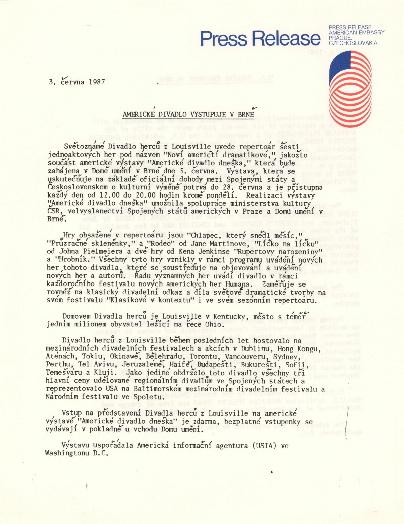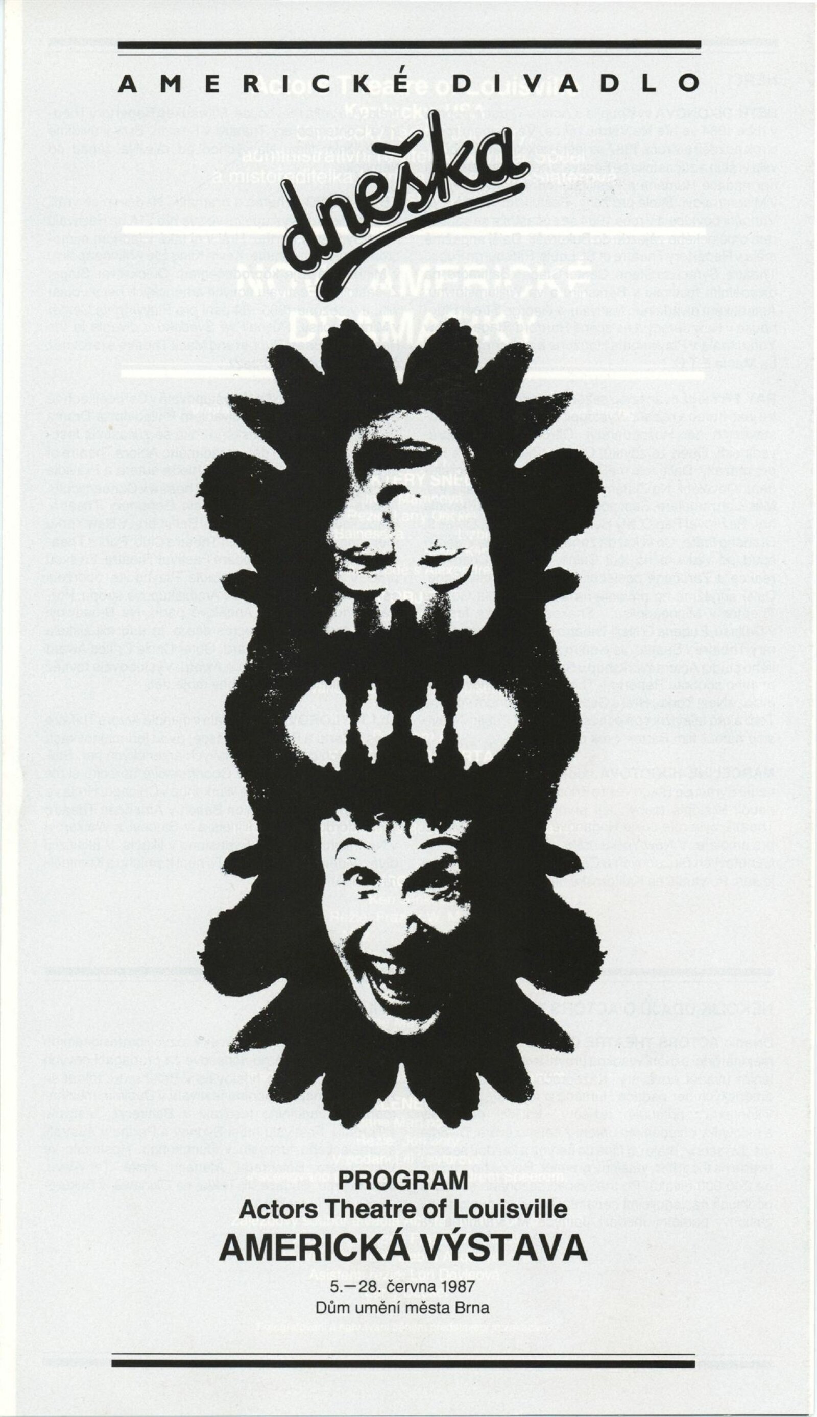 Americké divadlo dneška: Dům umění města Brna, 4. 6. – 28. 6. 1987 / Převzatý katalog. Americké divadlo dneška / Text: David Copelin. – B.m., U. S. Information Agency, [1987 ?]. – [20] s., obr. / K doprovodnému programu vydán program. “Actors Theater of Louisville” Americká výstava: Dům umění města Brna, 5. 6. – 28. 6. 1987 / Brno: DUmB, 1987. – skládačka (6 s.), DU 837. – MG