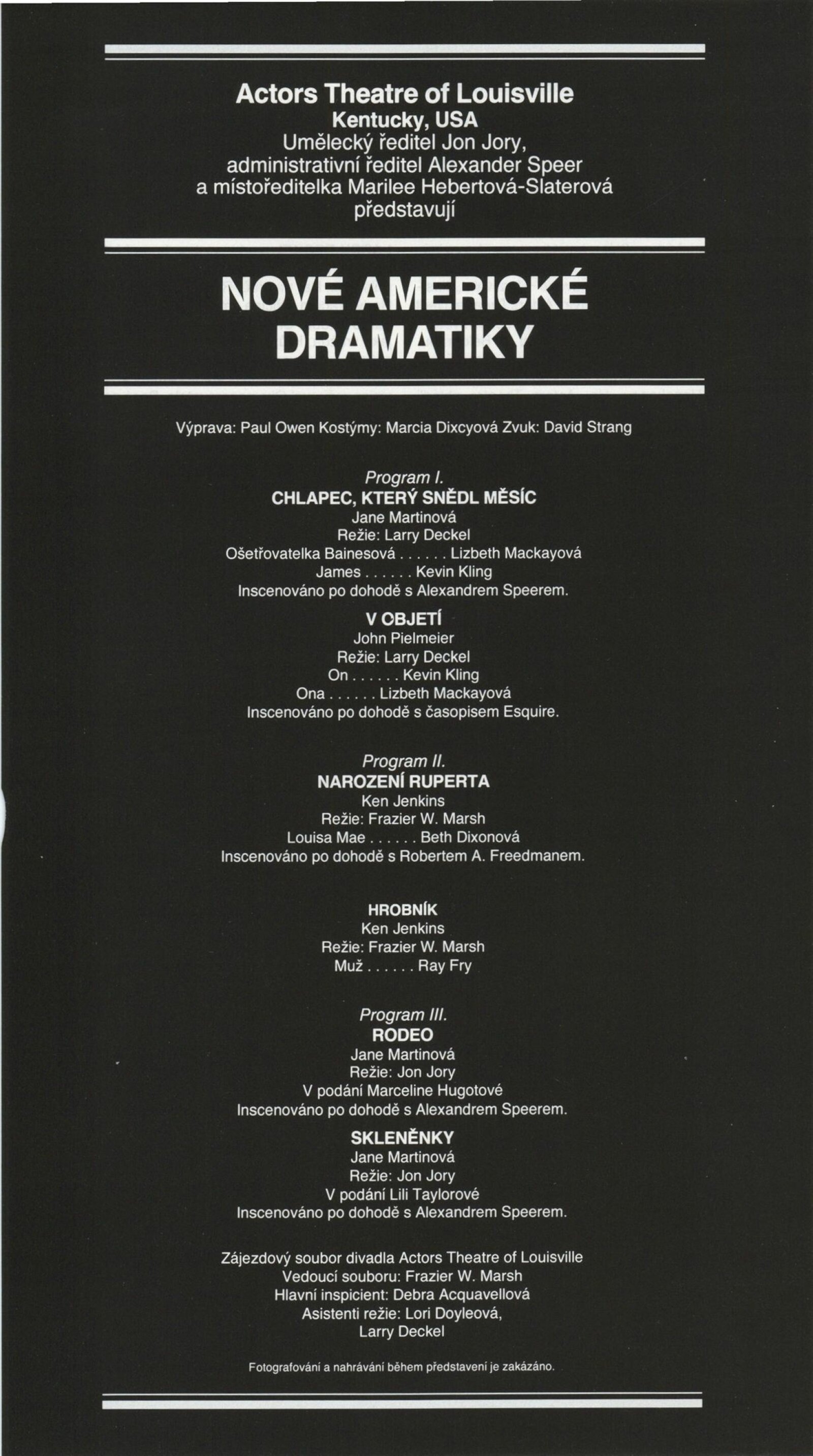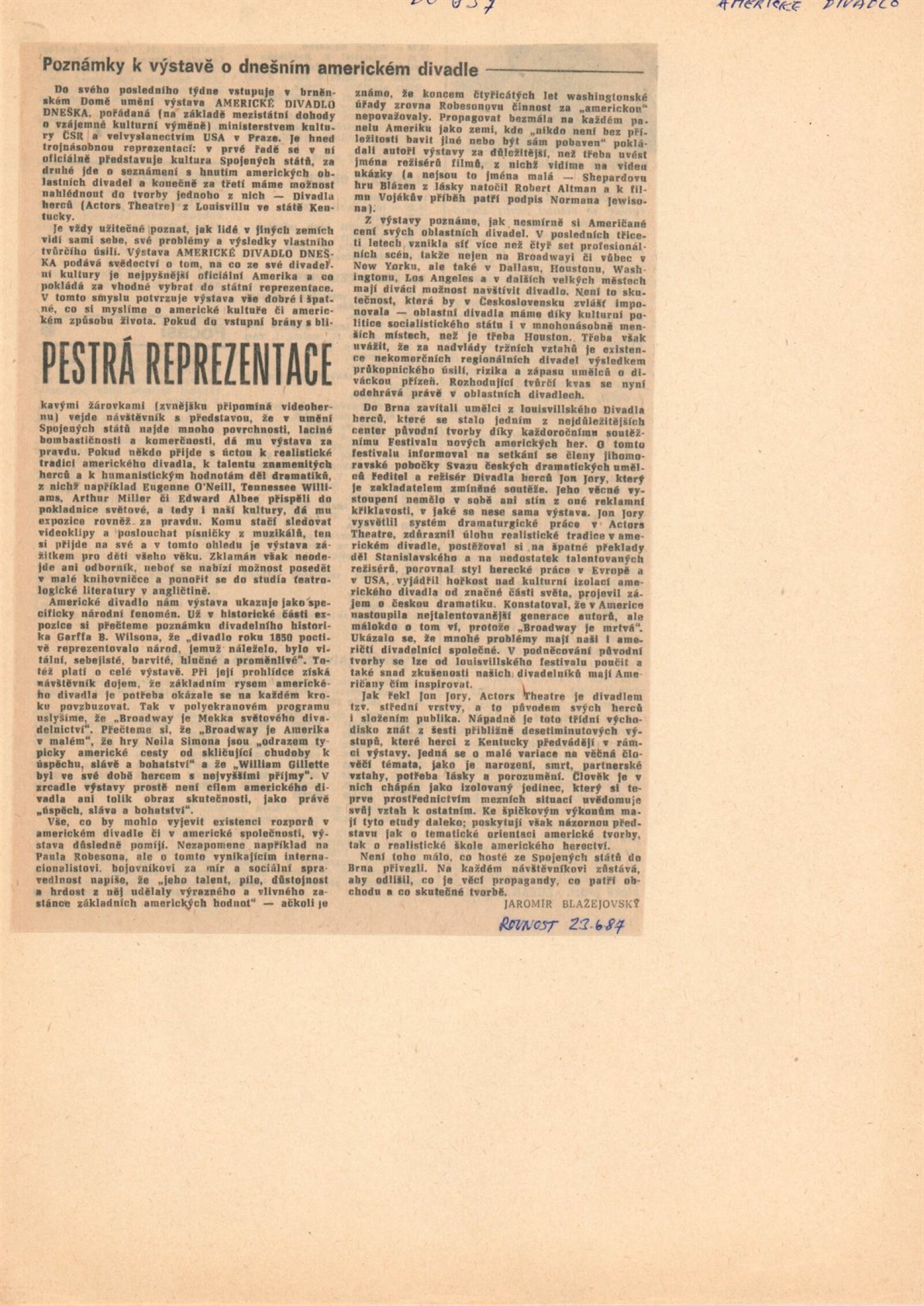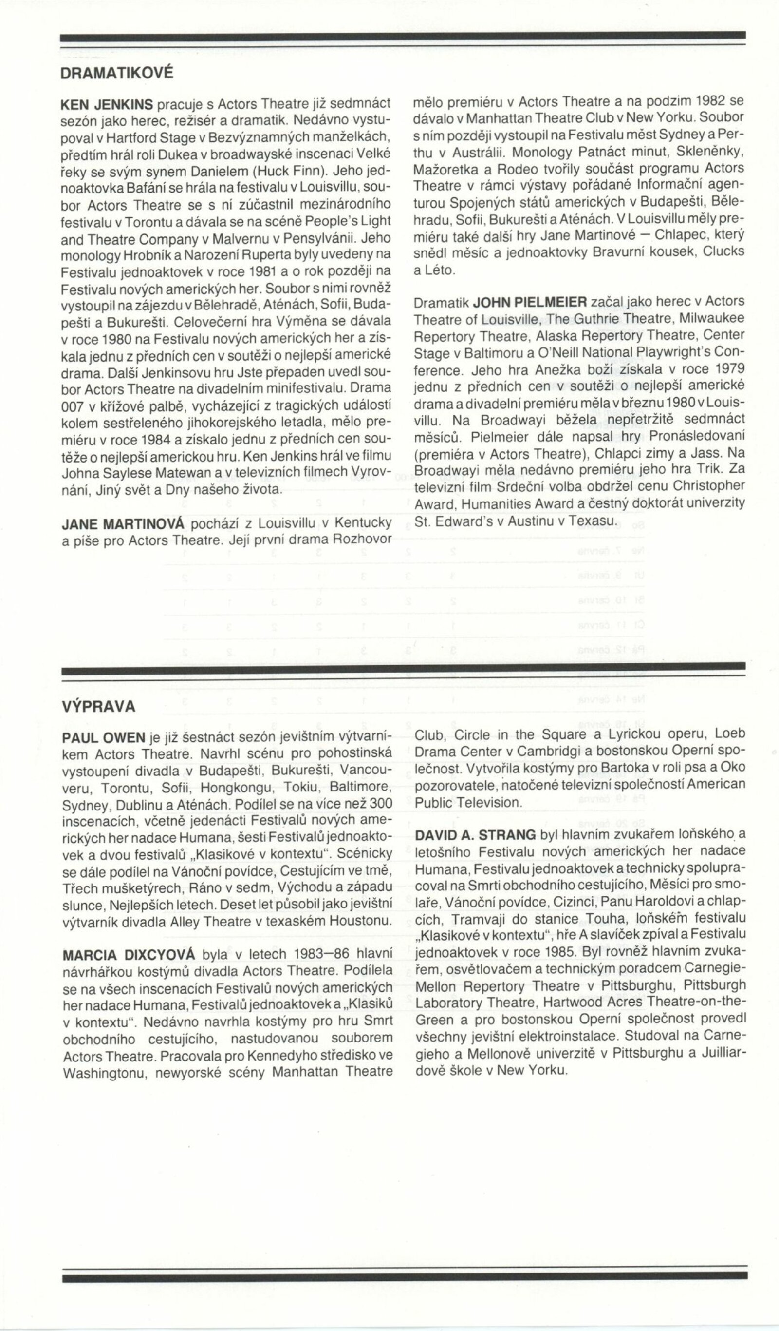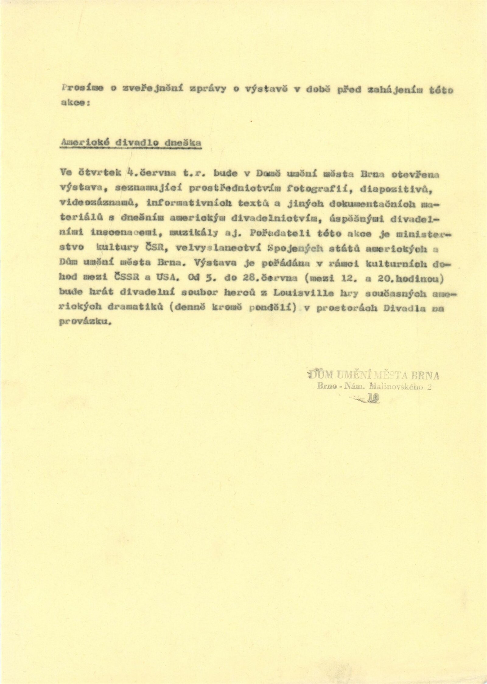 Americké divadlo dneška: Dům umění města Brna, 4. 6. – 28. 6. 1987 / Převzatý katalog. Americké divadlo dneška / Text: David Copelin. – B.m., U. S. Information Agency, [1987 ?]. – [20] s., obr. / K doprovodnému programu vydán program. “Actors Theater of Louisville” Americká výstava: Dům umění města Brna, 5. 6. – 28. 6. 1987 / Brno: DUmB, 1987. – skládačka (6 s.), DU 837. – MG