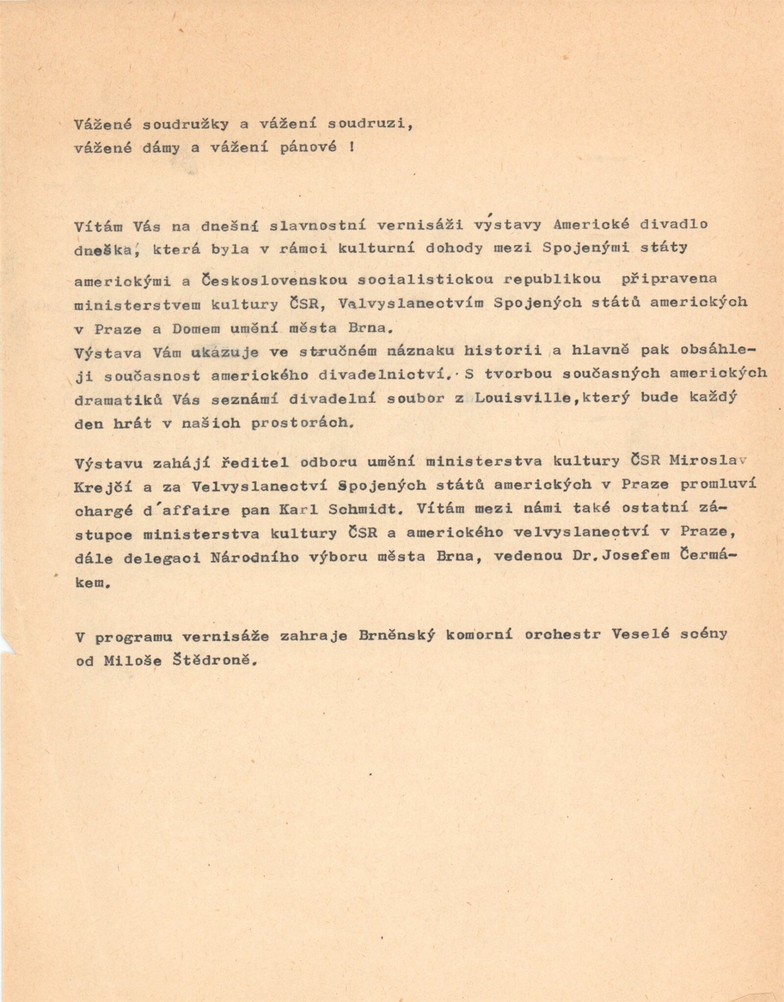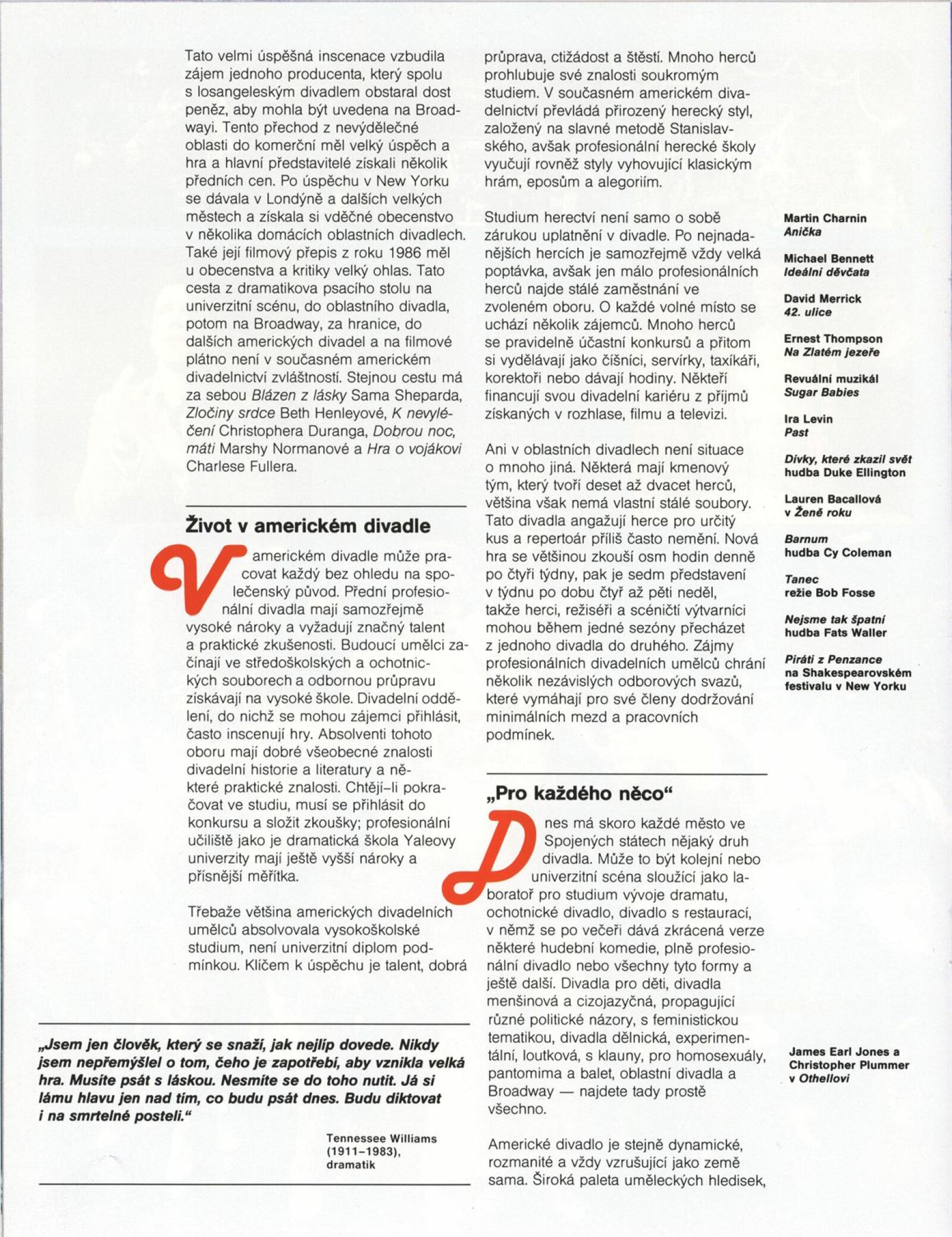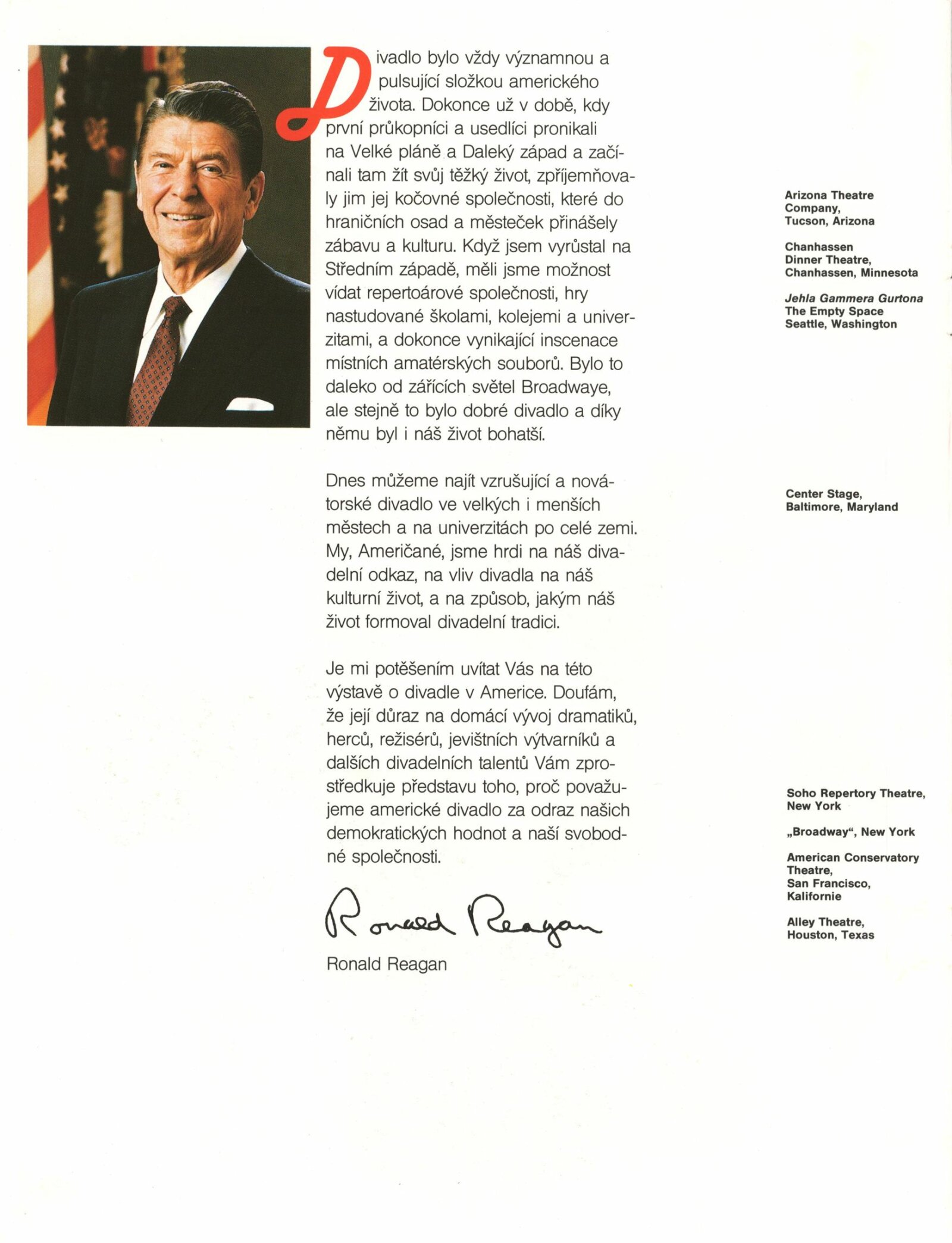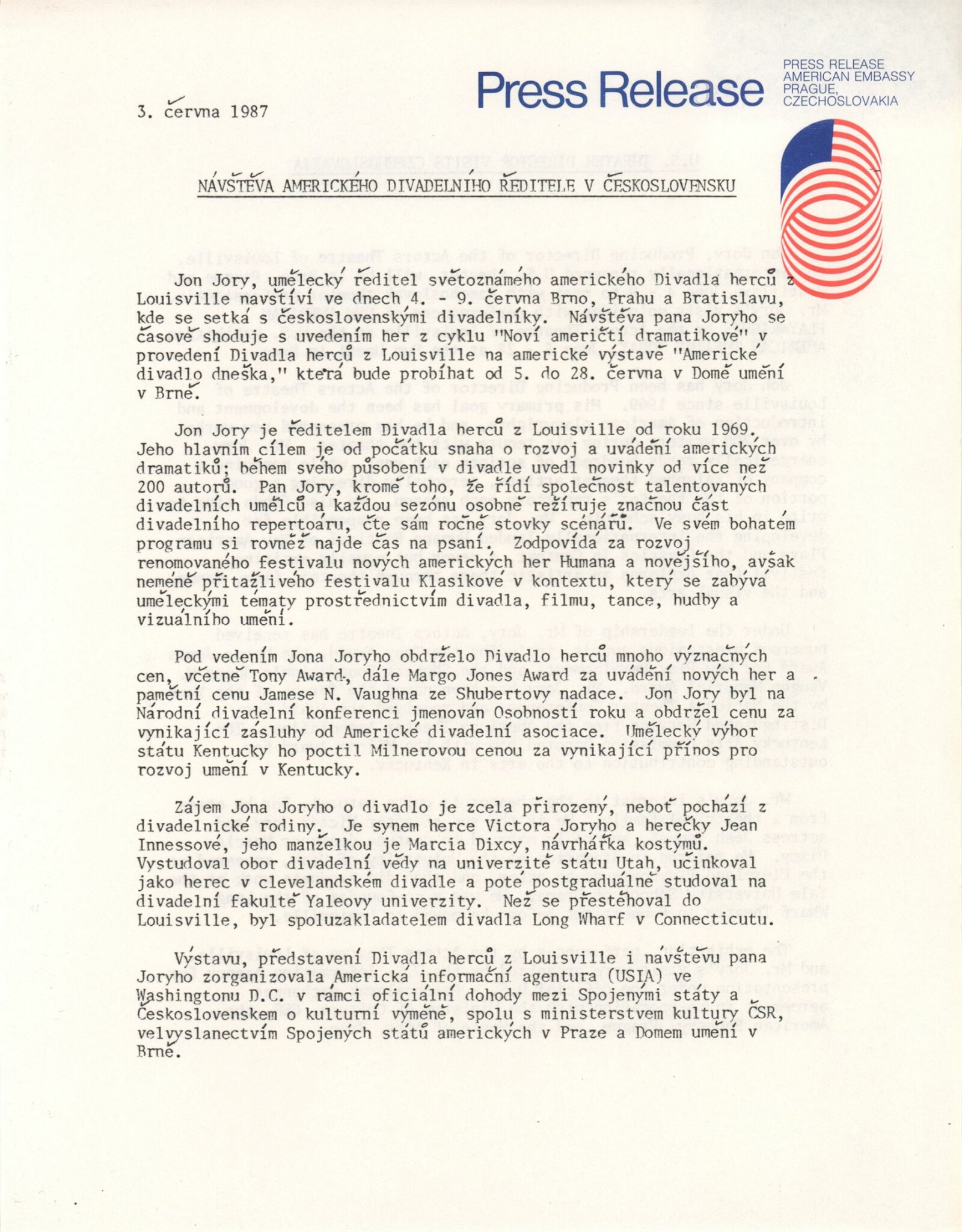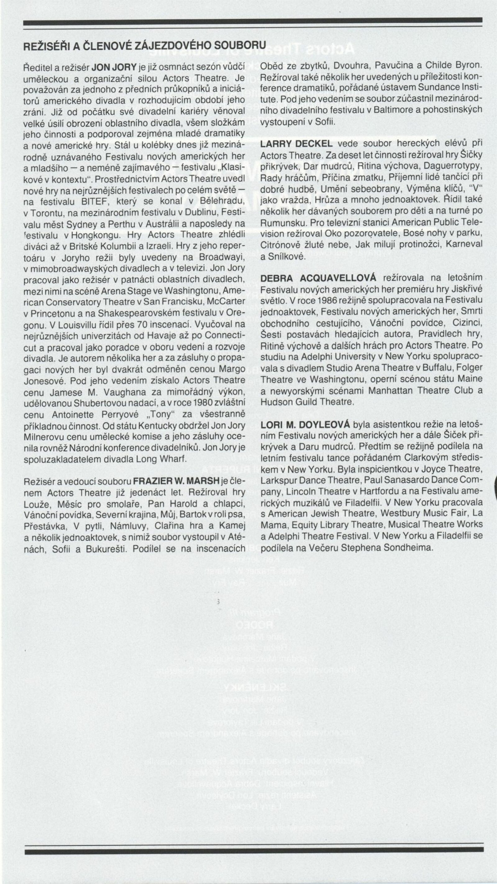 Americké divadlo dneška: Dům umění města Brna, 4. 6. – 28. 6. 1987 / Převzatý katalog. Americké divadlo dneška / Text: David Copelin. – B.m., U. S. Information Agency, [1987 ?]. – [20] s., obr. / K doprovodnému programu vydán program. “Actors Theater of Louisville” Americká výstava: Dům umění města Brna, 5. 6. – 28. 6. 1987 / Brno: DUmB, 1987. – skládačka (6 s.), DU 837. – MG