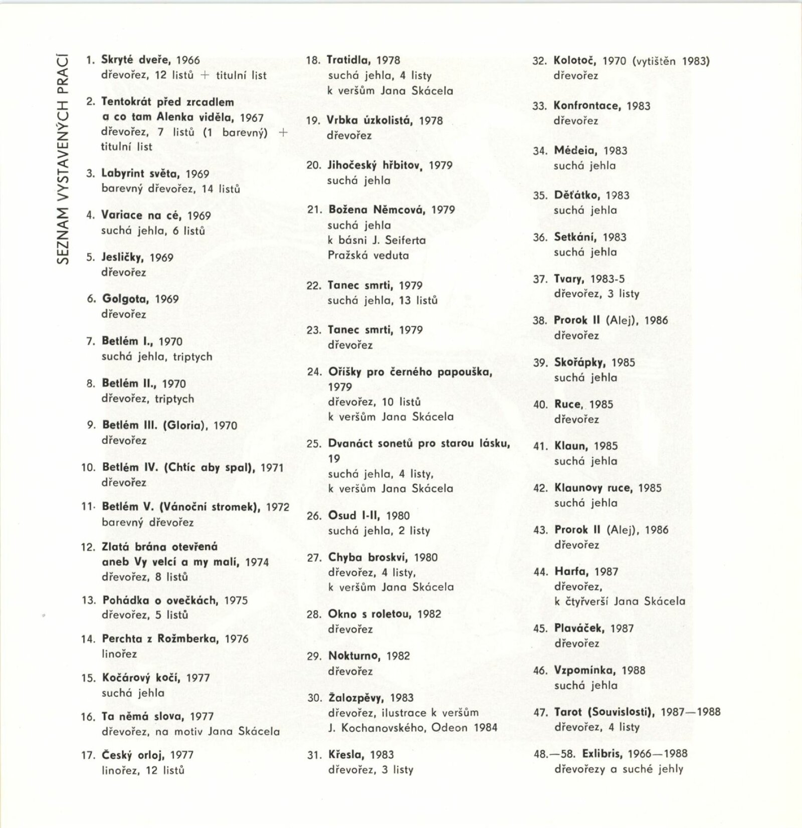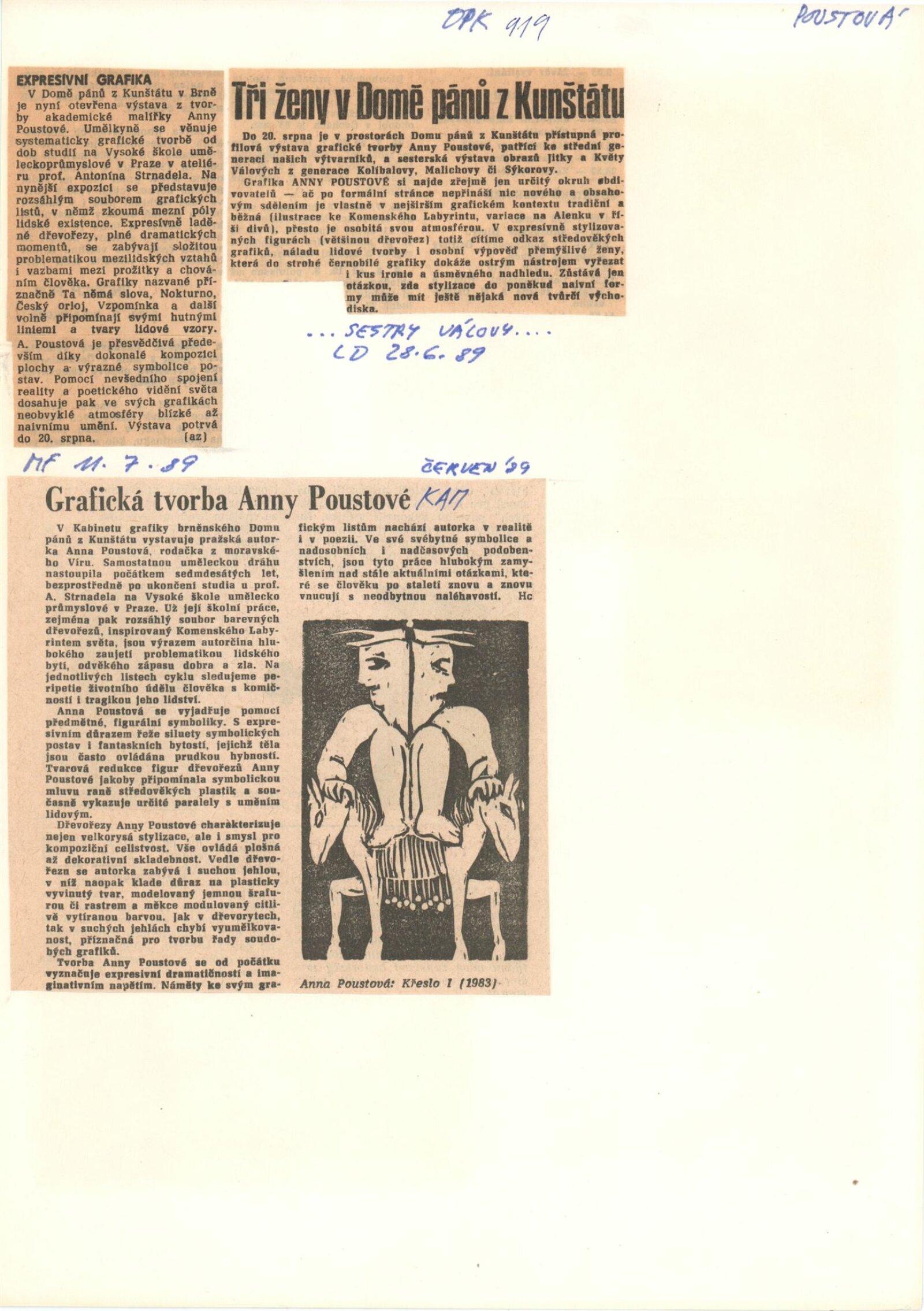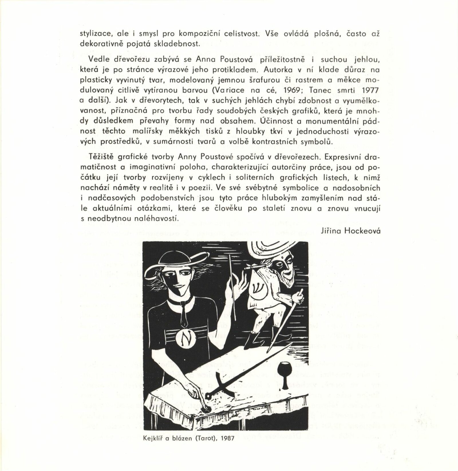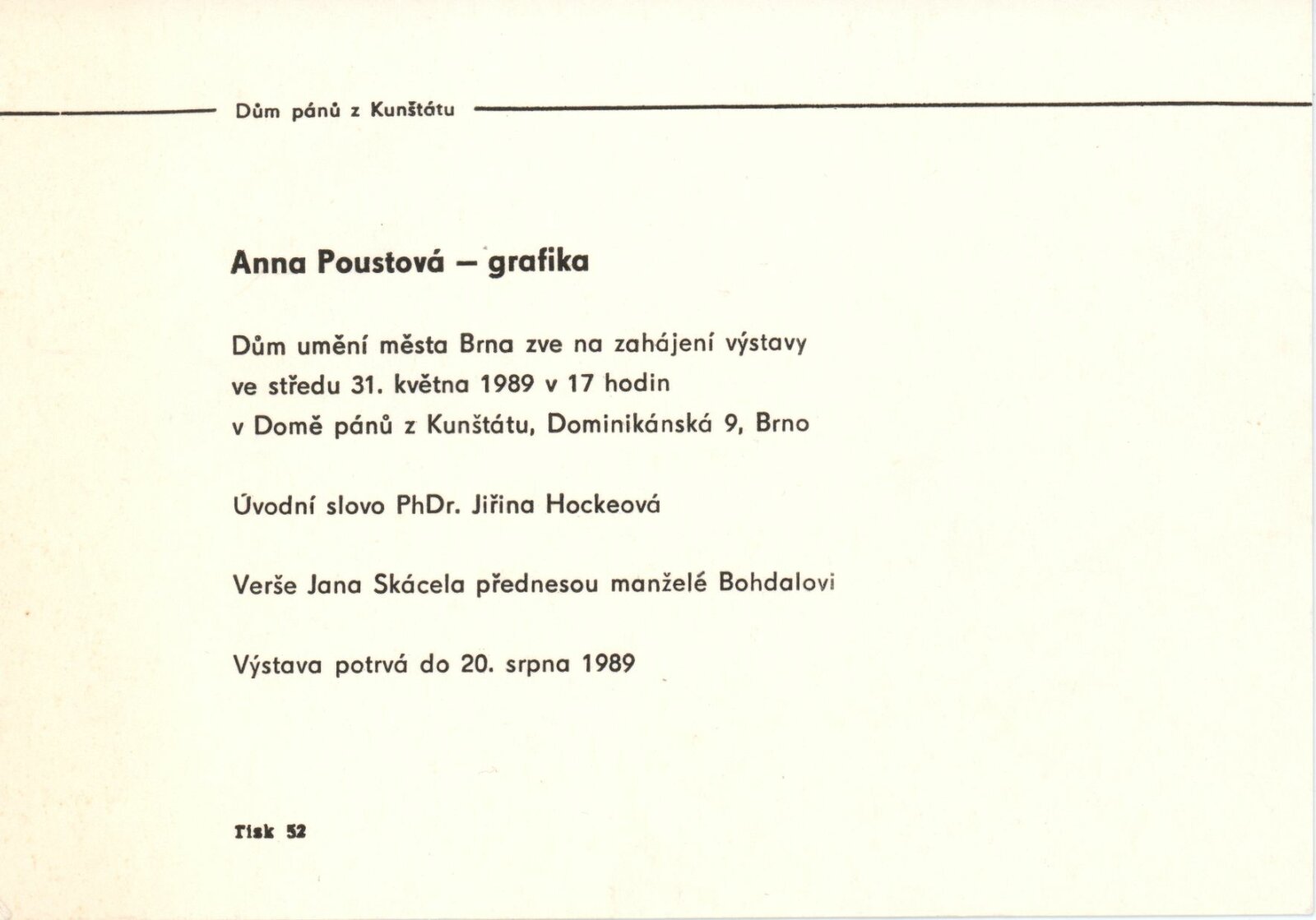 Anna Poustová. Grafika: Dům umění / Dům pánů z Kunštátu, Kabinet grafiky, 31. 5. – 20. 8. 1989 / Text: Jiřina Hockeová. – Brno: DUmB, 1989. – [13] s., obr., životní data, výstavy, DPK 919. – MZK; MG; MMB