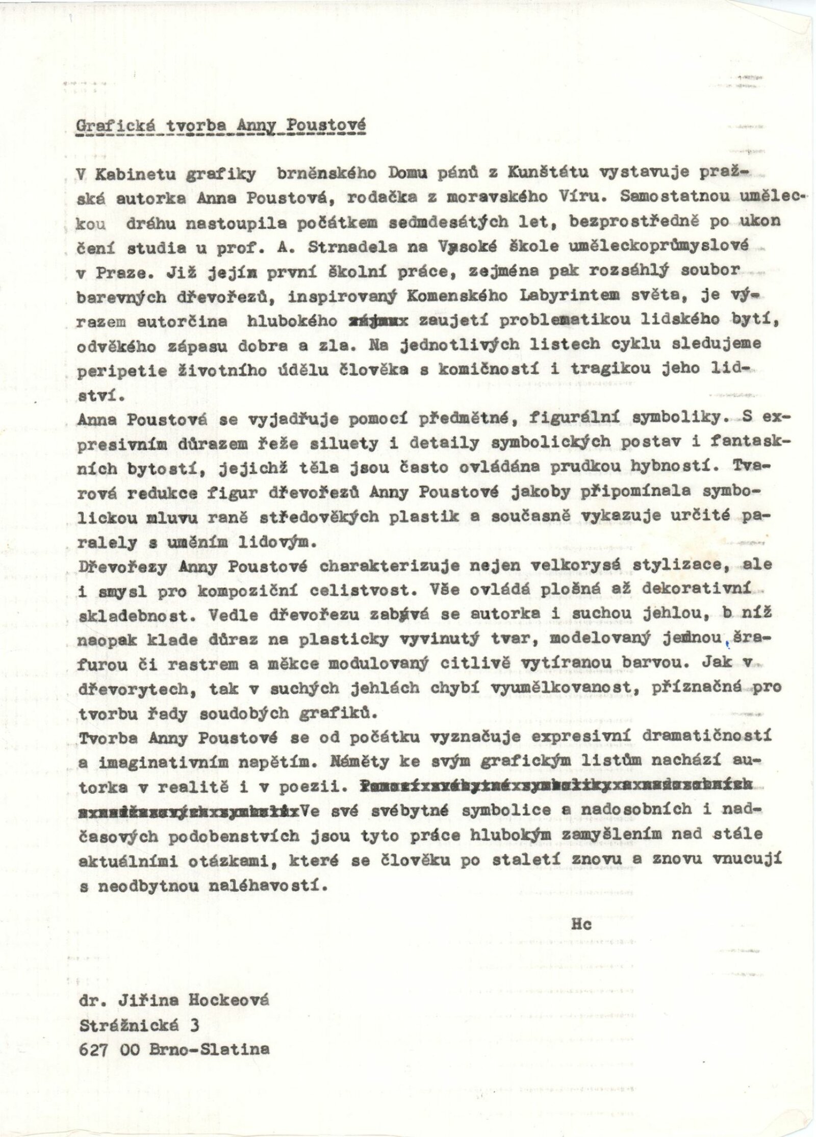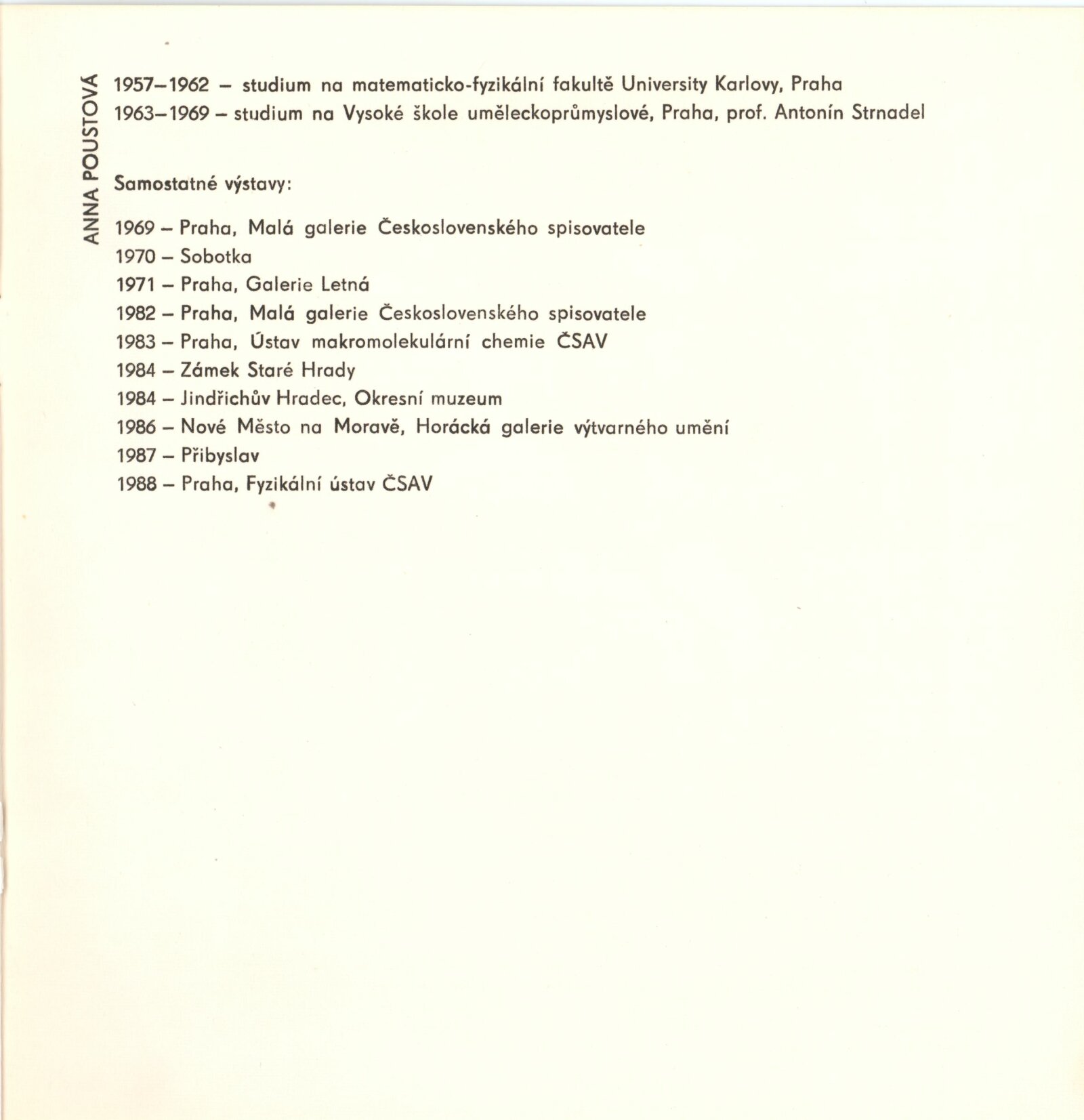 pozvánka, katalog, strojopis a podklady pro katalog, text pro KAM (Jiřina Hockeová), fotografie výstavy a vernisáže, seznam vystavených děl, pojistný seznam, provozní korespondence, žádost a potvrzení o konání výstavy, recenze v tisku, texty o Anně Poustové, pozvánka (Anna Poustová, Obrazy a grafika, Zámek Staré Hrady, 1984; Anna Poustová, Koloběh života, Okresní muzeum J. Hradec, 1984; Anna Poustová, Obrazy a grafika, Kulturní dům Přibyslav, 1987; Anna Poustová, Labyrint světa, Horácká galerie výtvarného umění v Novém Městě na Moravě, 1987; Anna Poustová, Obrazy a grafiky, FÚ ČSAV, 1988)