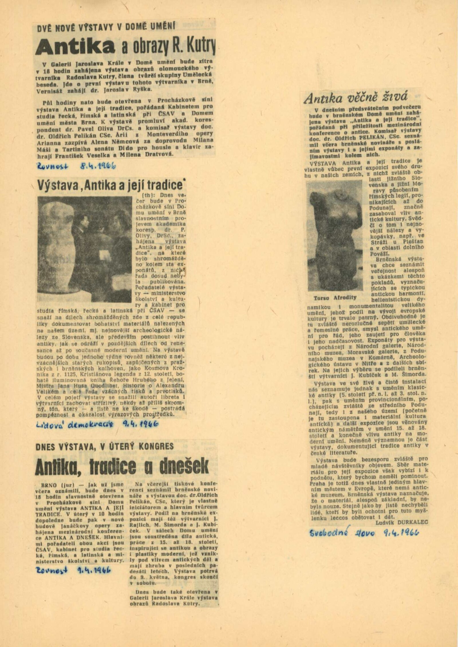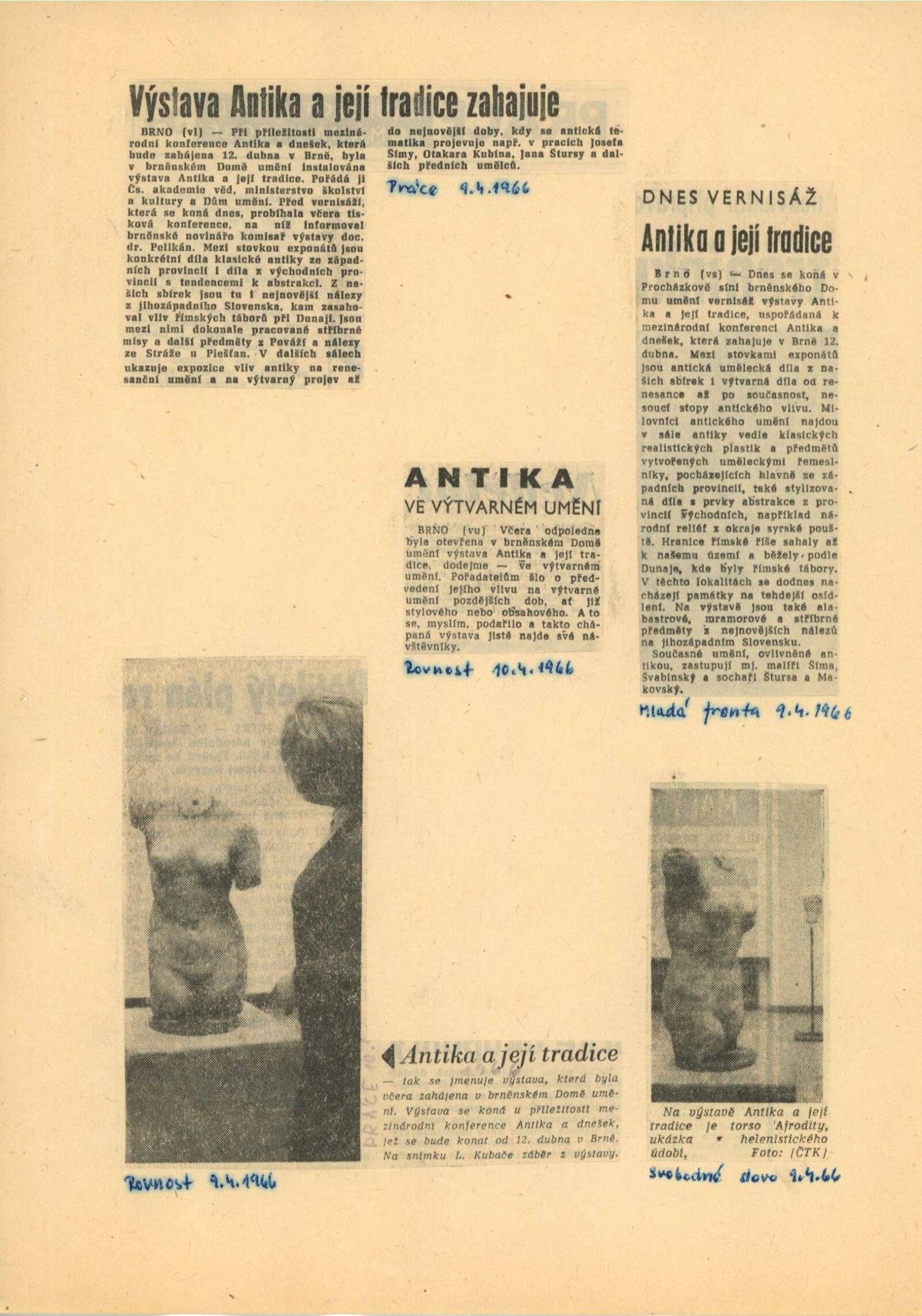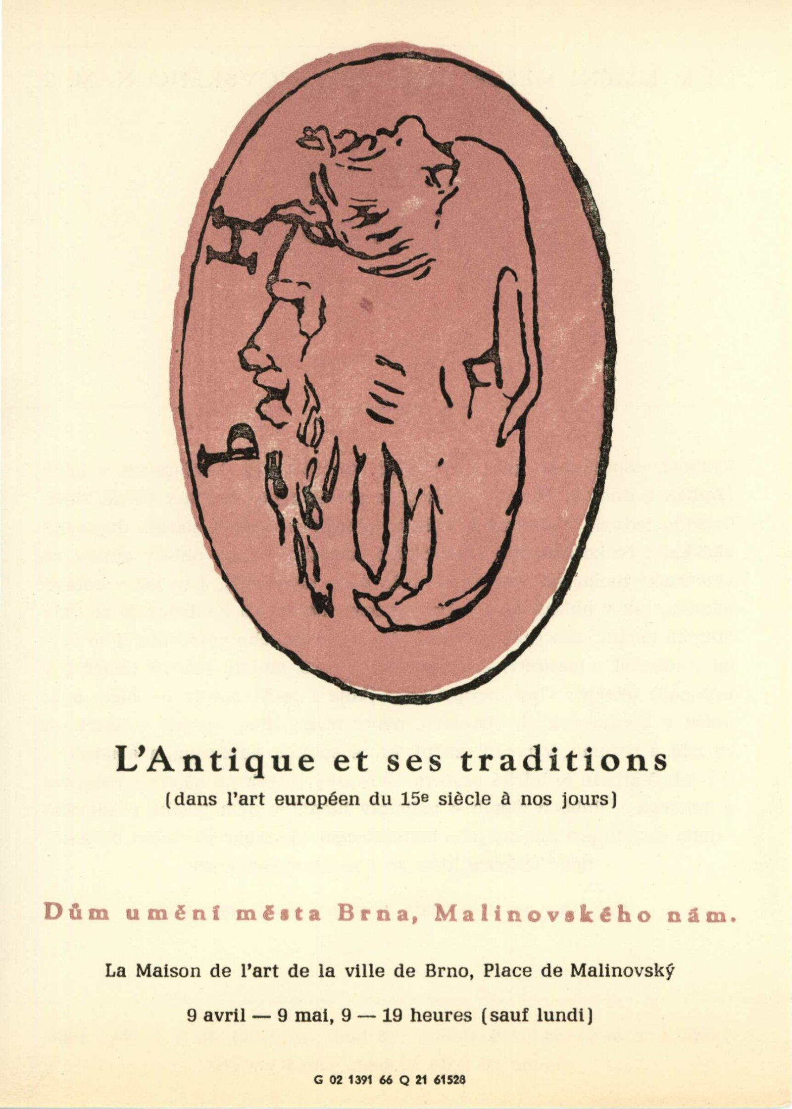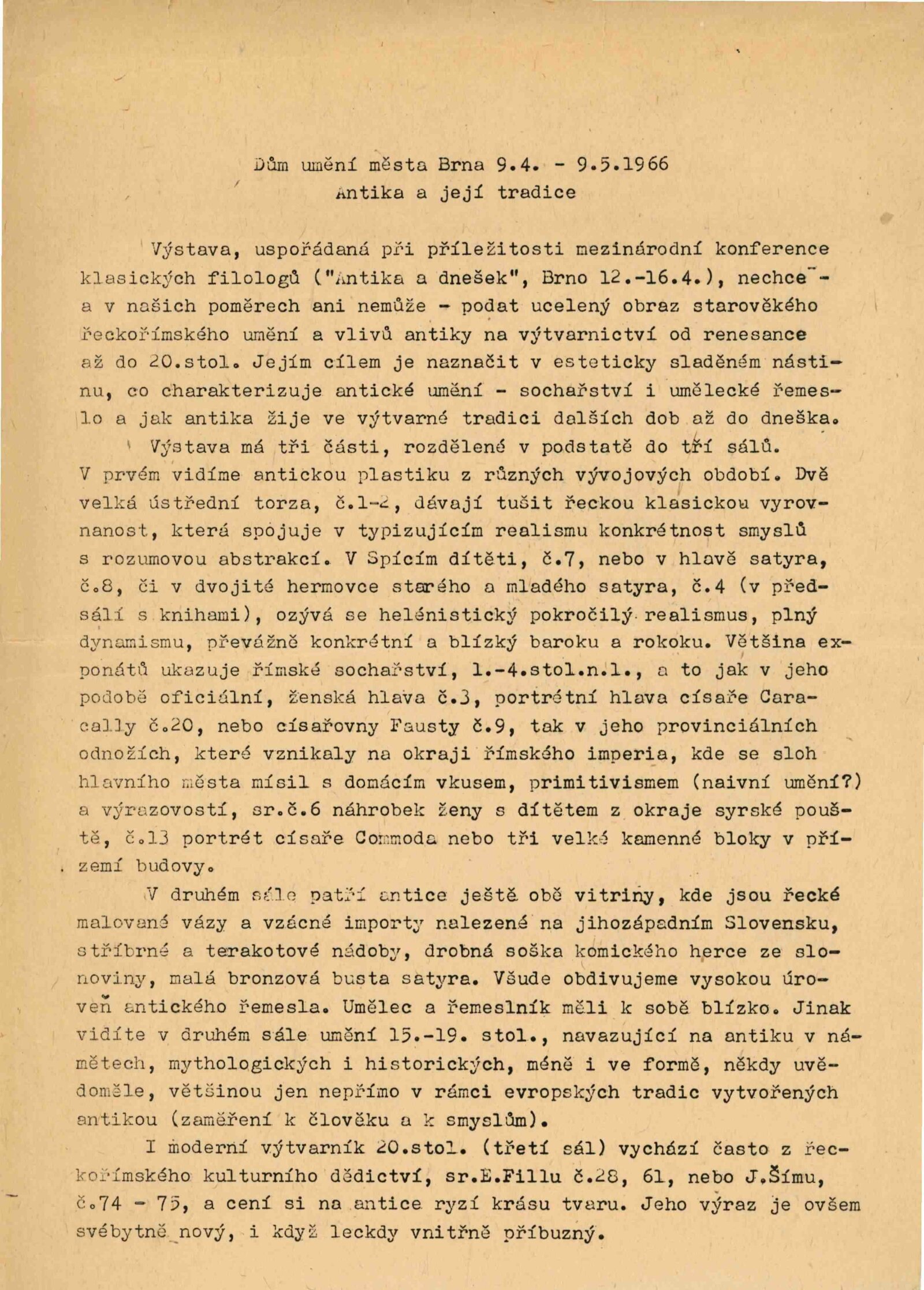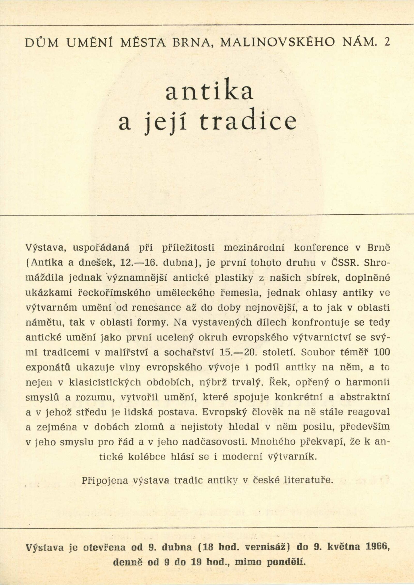 Antika a její tradice: Dům umění města Brna, 9. 4. – 9. 5. 1966 / Katalog výstavy uspořádané při příležitosti mezinárodní konference Antika a dnešek v Brně, 12. 4. – 16. 4. 1966. Antika a její tradice: Dům umění města Brna, 9. 4. – 9. 5. 1966 / Text: Oldřich Pelikán. – Praha: Československá akademie věd, 1966. – 16 s., 17 s. obr. příl., DU 456. – MZK; MG