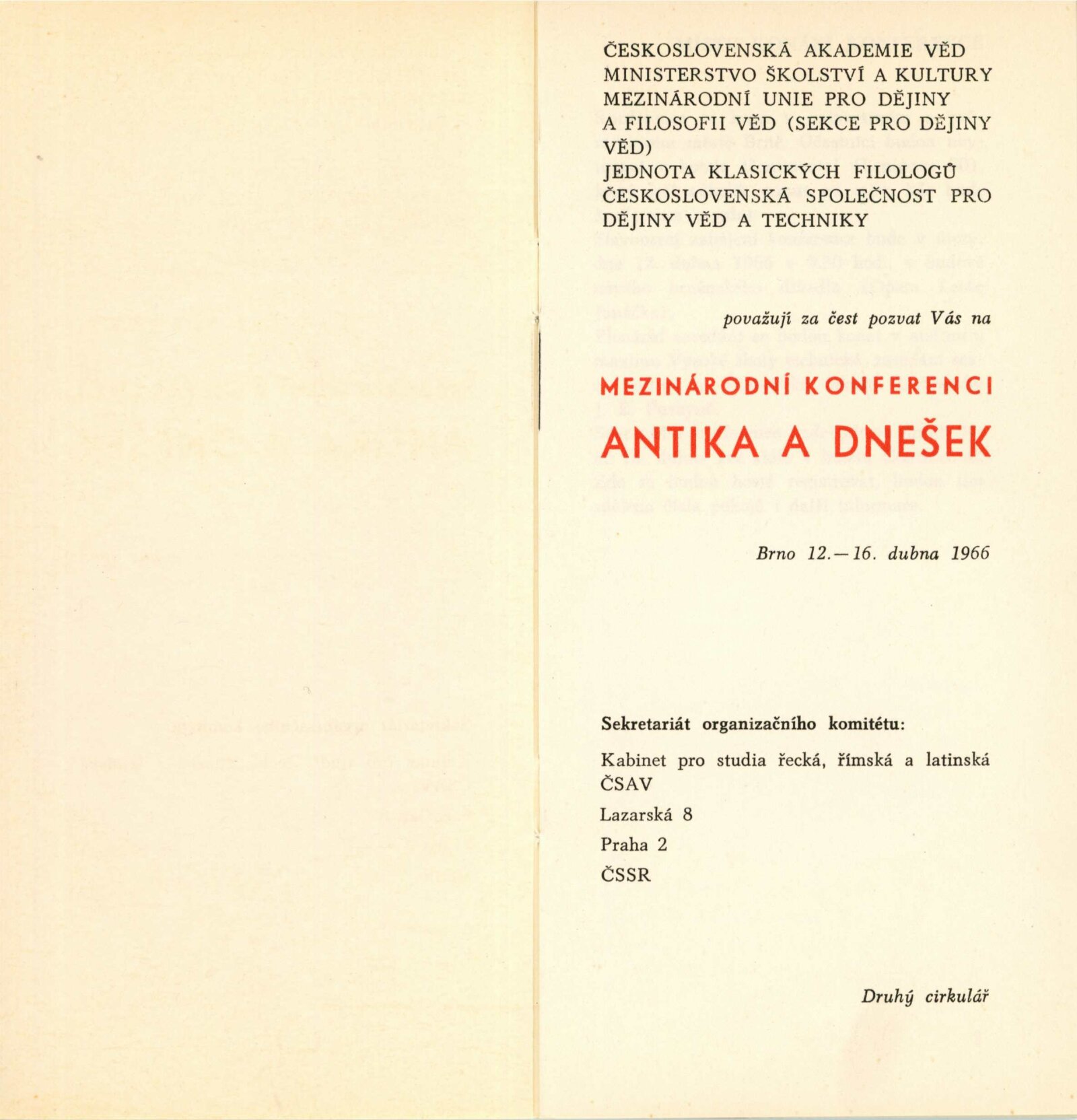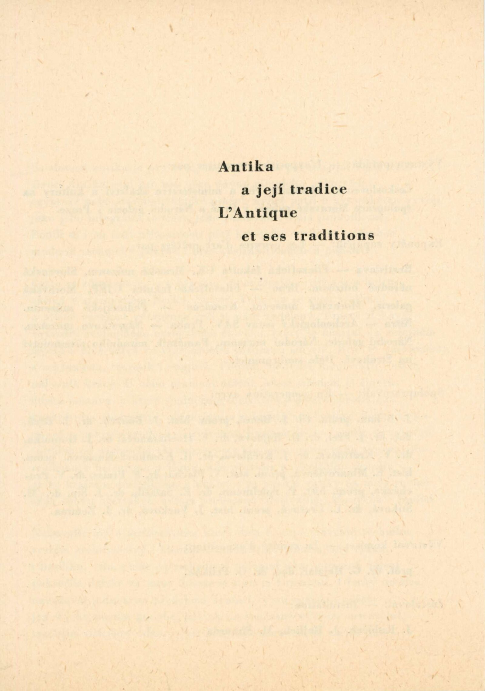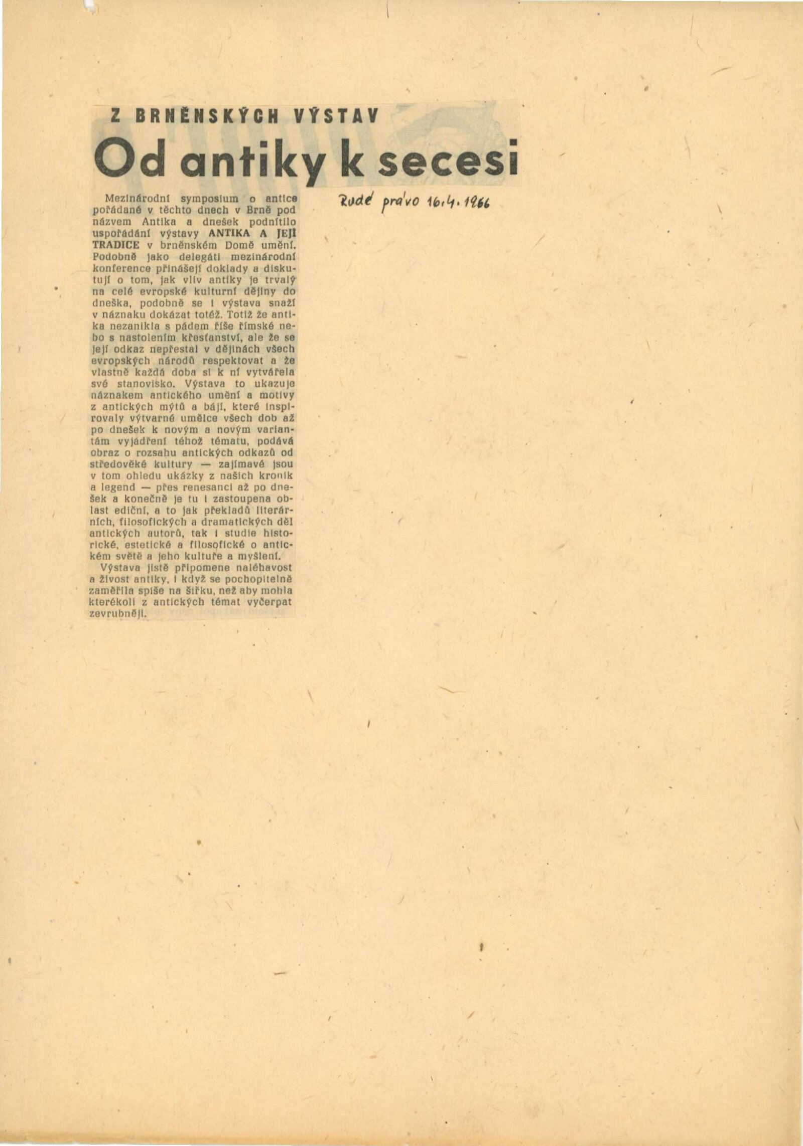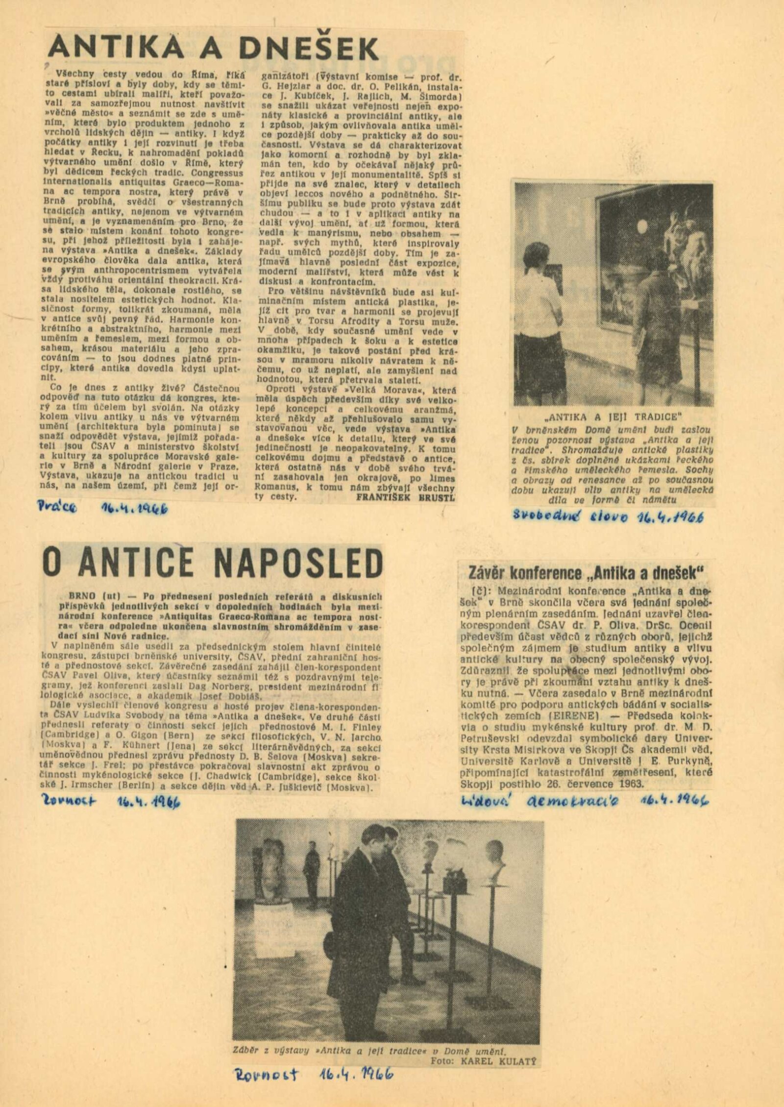 Antika a její tradice: Dům umění města Brna, 9. 4. – 9. 5. 1966 / Katalog výstavy uspořádané při příležitosti mezinárodní konference Antika a dnešek v Brně, 12. 4. – 16. 4. 1966. Antika a její tradice: Dům umění města Brna, 9. 4. – 9. 5. 1966 / Text: Oldřich Pelikán. – Praha: Československá akademie věd, 1966. – 16 s., 17 s. obr. příl., DU 456. – MZK; MG