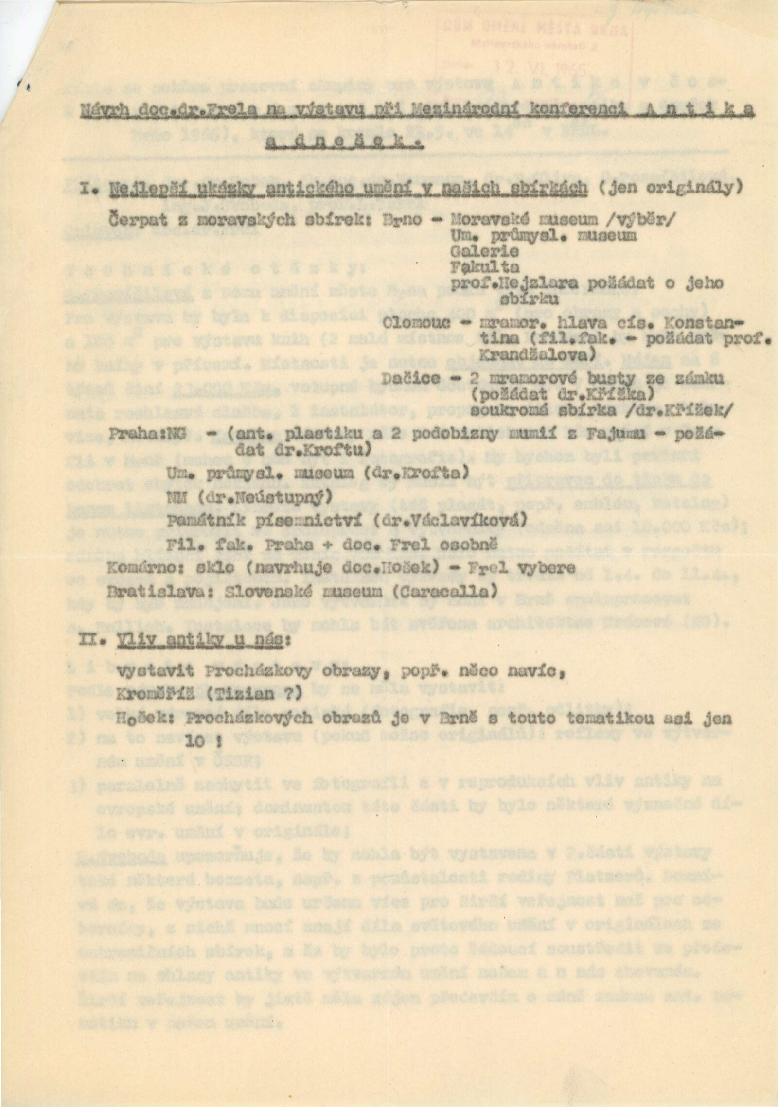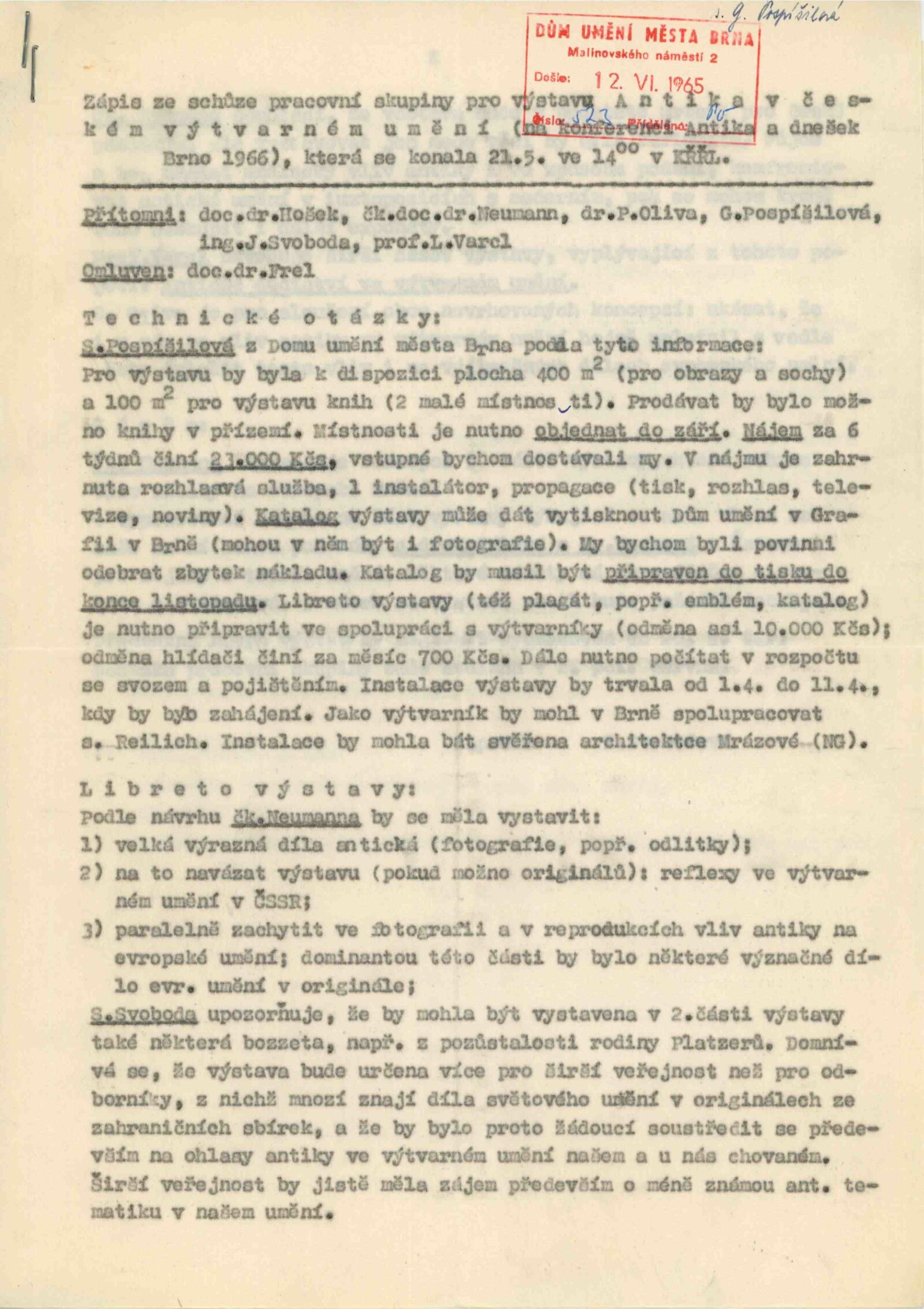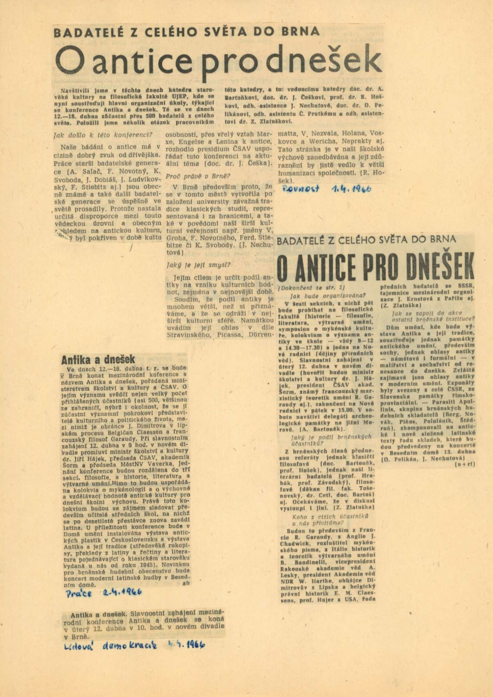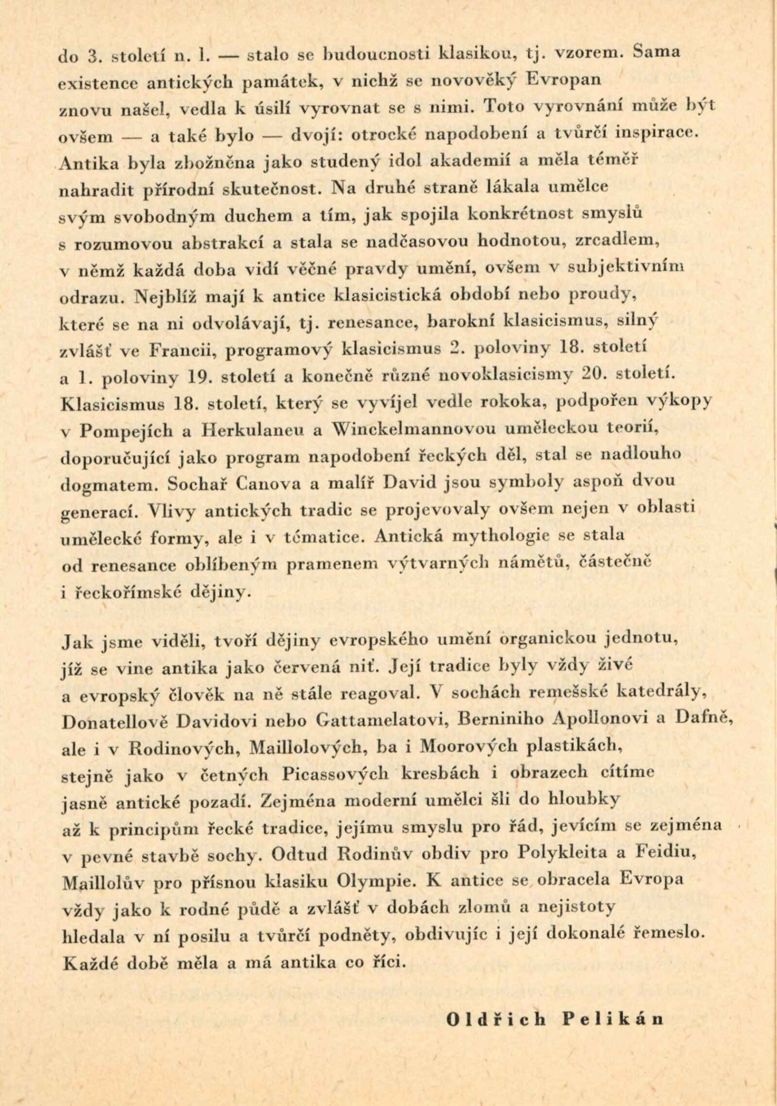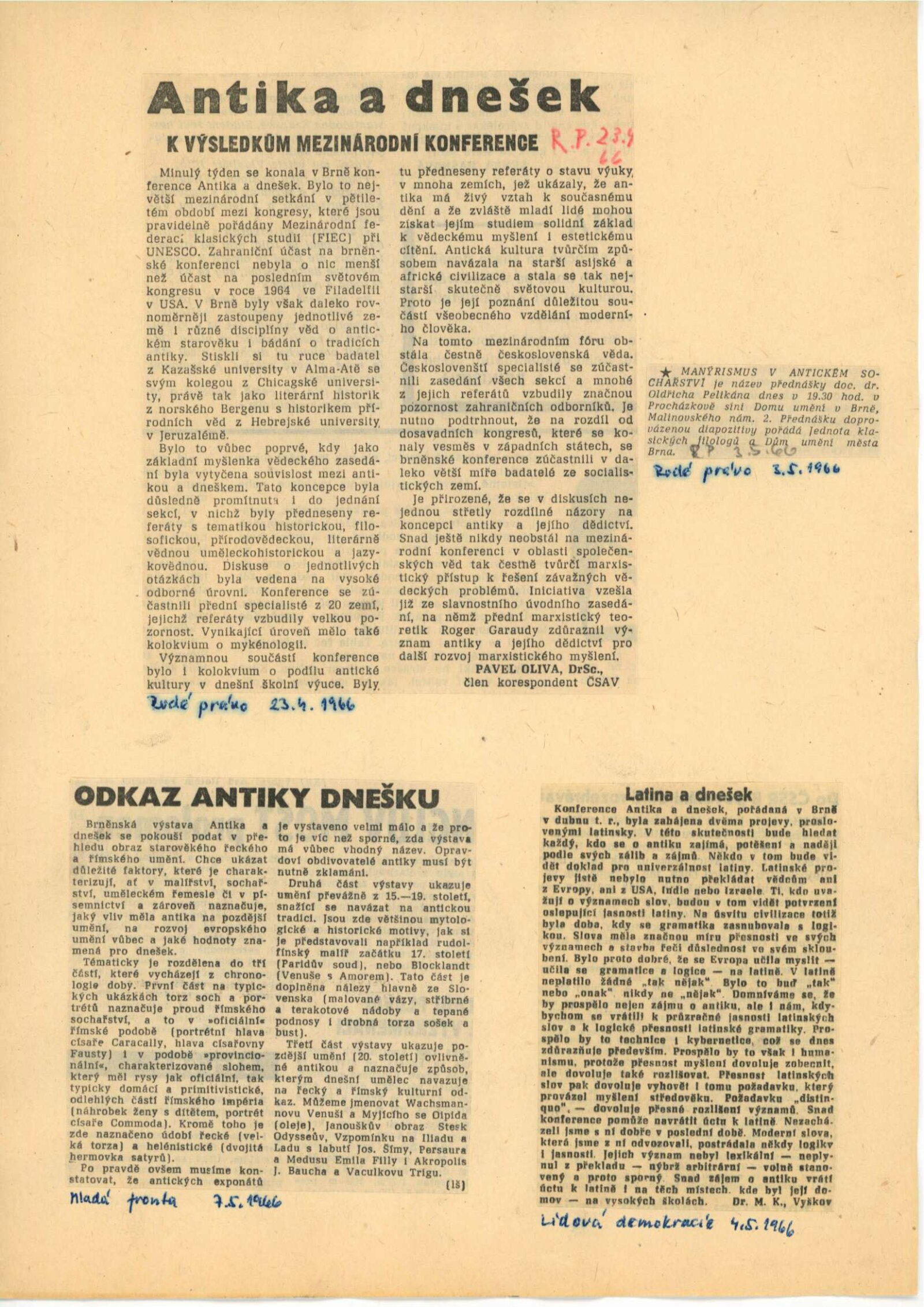 Antika a její tradice: Dům umění města Brna, 9. 4. – 9. 5. 1966 / Katalog výstavy uspořádané při příležitosti mezinárodní konference Antika a dnešek v Brně, 12. 4. – 16. 4. 1966. Antika a její tradice: Dům umění města Brna, 9. 4. – 9. 5. 1966 / Text: Oldřich Pelikán. – Praha: Československá akademie věd, 1966. – 16 s., 17 s. obr. příl., DU 456. – MZK; MG