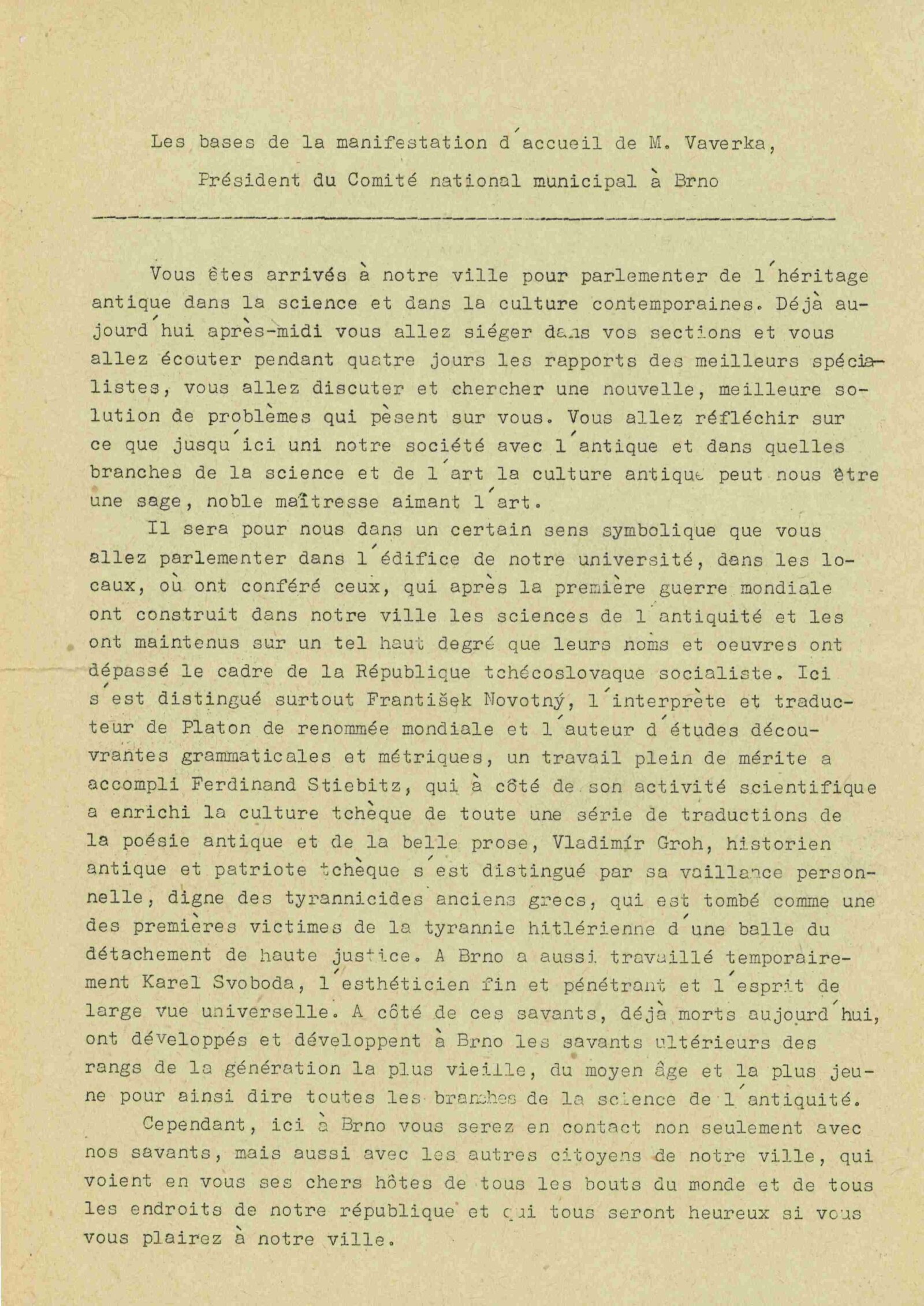pozvánka, pozvánka na přednášku v DU, katalog, letáky k výstavě, program a vícejazyčná brožura konference, text k výstavě, úvodní slovo (p. Veverky na konferenci ve francouzštině), zápisy ze schůzí, fotografie z vernisáže, korespondence (o přípravě výstavy, provozní korespondence), recenze v tisku, pozvání na konferenci „Antika a dnešek“