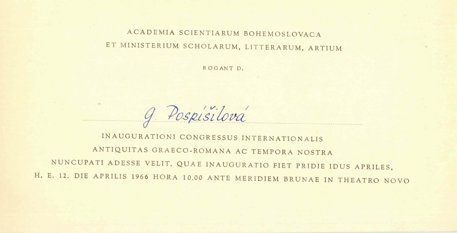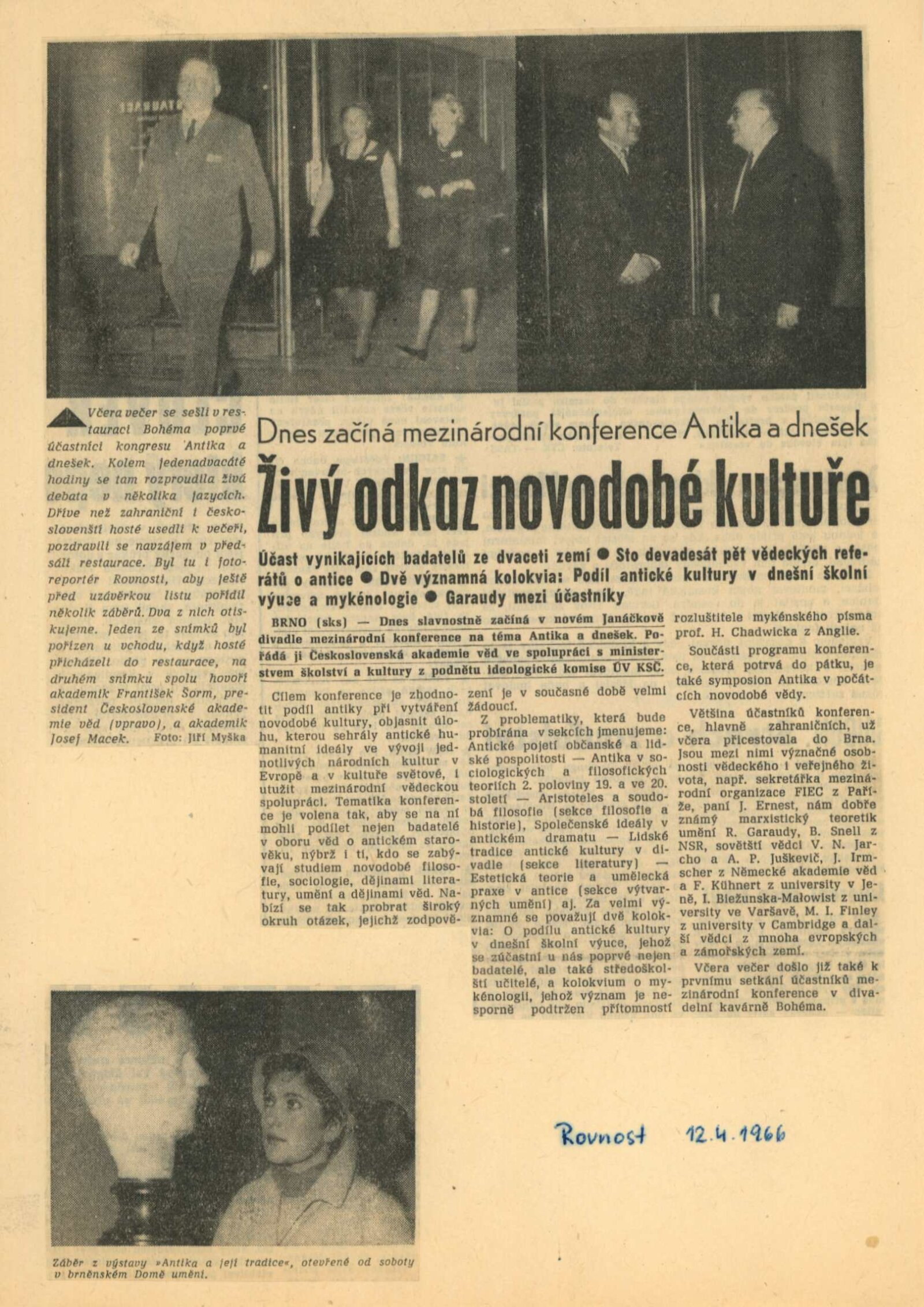 Výstava se konala u příležitosti mezinárodní konference Antika a dnešek od 12. do 16. 4. 1966 v Brně. Výstavu zahájil Pavel Oliva, o antice a jejích tradicích promluvil Oldřich Pelikán.
