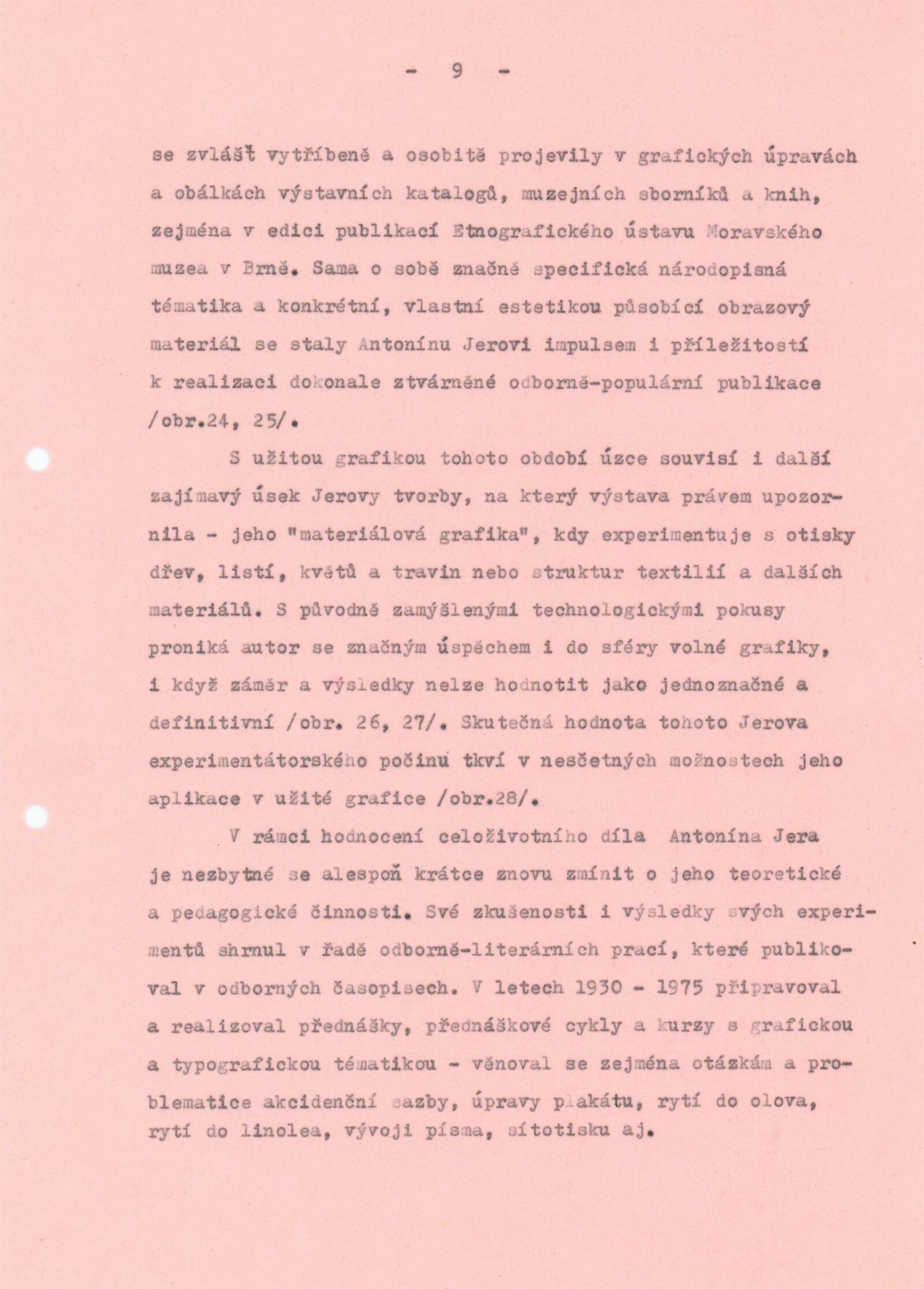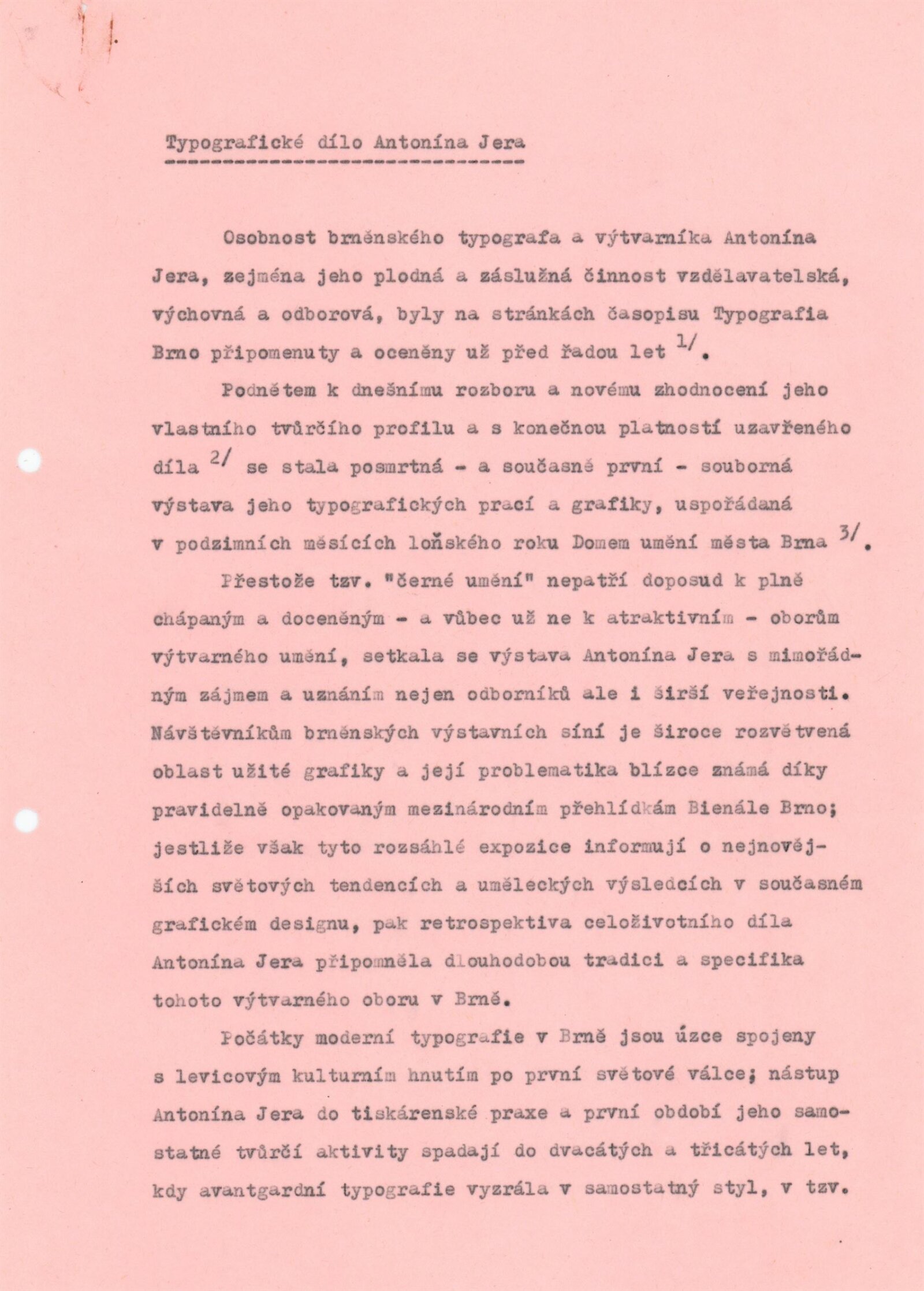 pozvánka, katalog, strojopis, text o autorovi od Milady Novákové, zpráva o výstavě, fotografie pro katalog, provozní korespondence, rukopis doporučujícího dopisu od Dalibora Chatrného a Jiřího Šindlera, žádost o výstavu od Petra Jera (syn), žádost o povolení výstavy, recenze v tisku, parte Antonína Jera