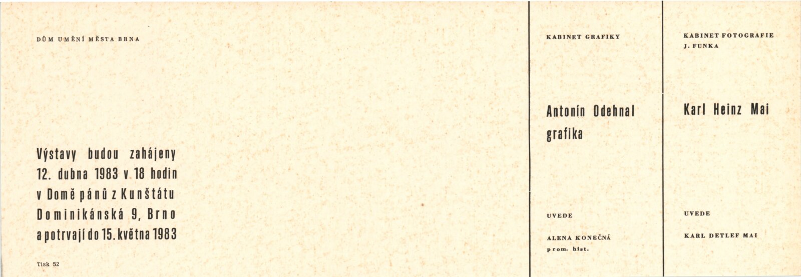 Antonín Odehnal. Grafika: Dům umění / Dům pánů z Kunštátu, Kabinet grafiky, 12. 4. – 15. 5. 1983 / Text: Alena Konečná. – Brno: DUmB, 1983. – 13 s., obr., životní data, výstavy, studijní cesty, DPK 797. – MZK; MG; MMB